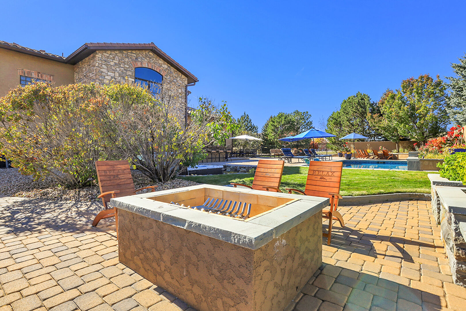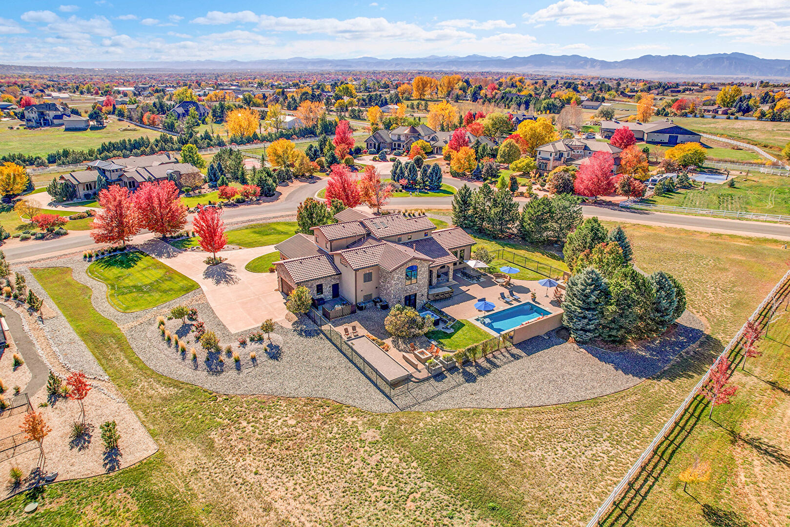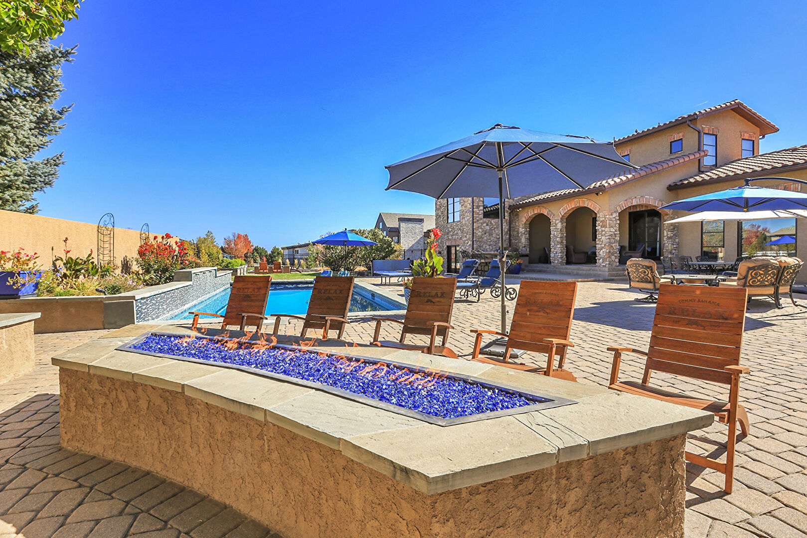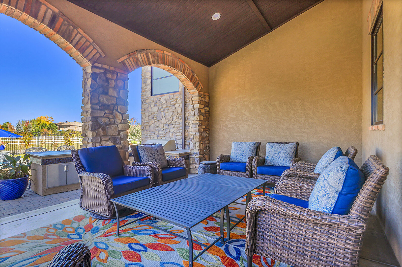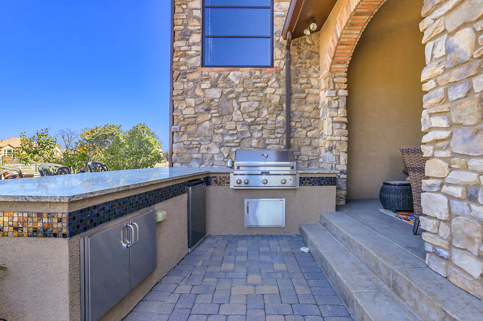 Downspout, Fence, Grill, Lawn, Outdoor Bar, Outdoor Dining Area, Outdoor Living Space, Patio, Pool, Stone Siding, Stucco Siding, Tile Roof, Fence, Gutters, Outdoor Kitchen, Outdoor Living Space, Patio, Pool