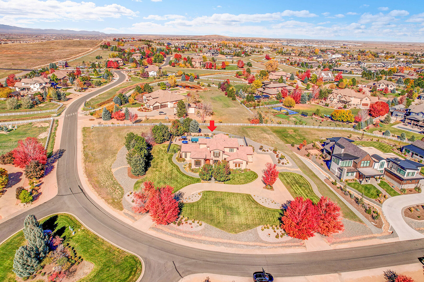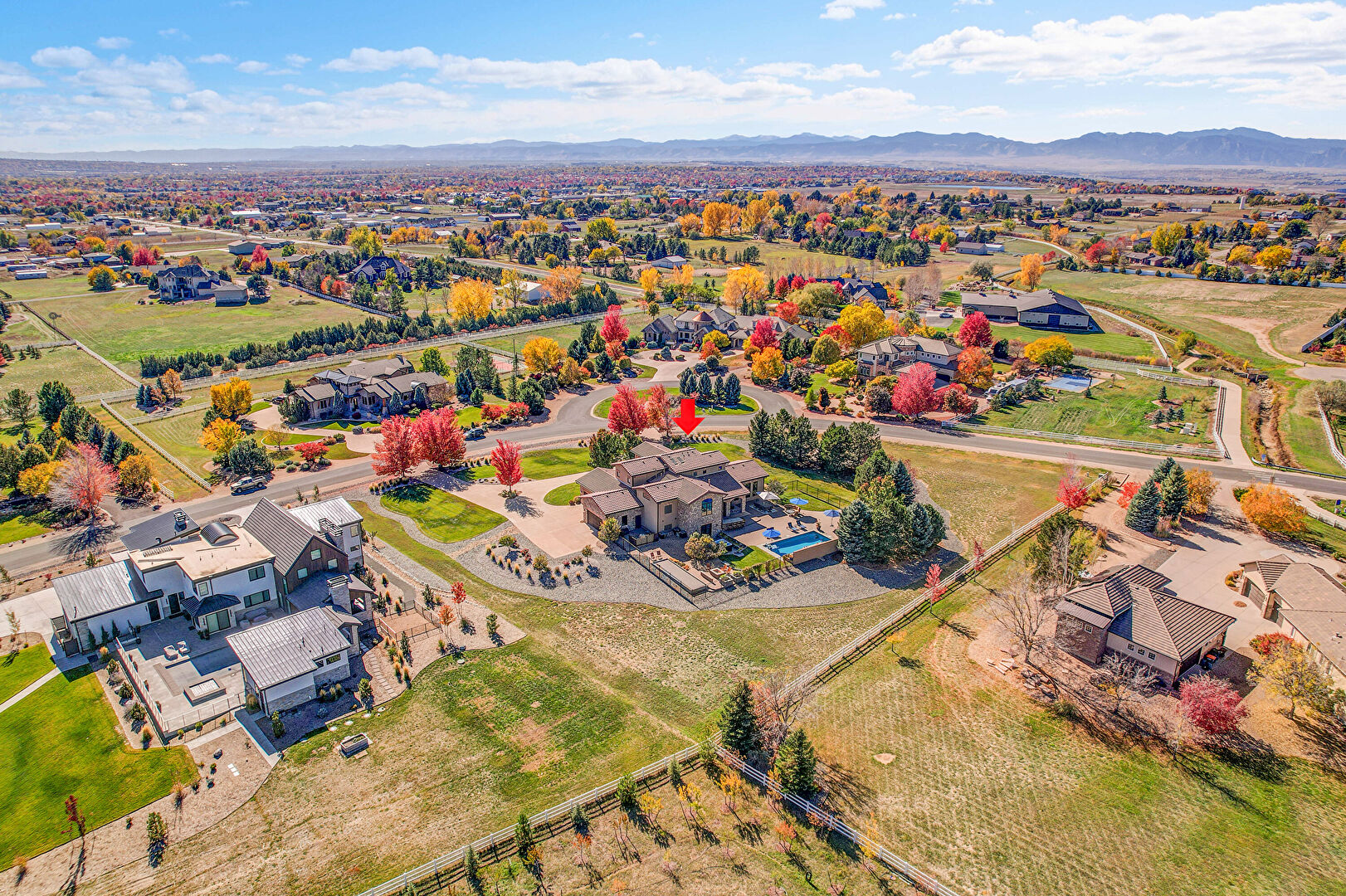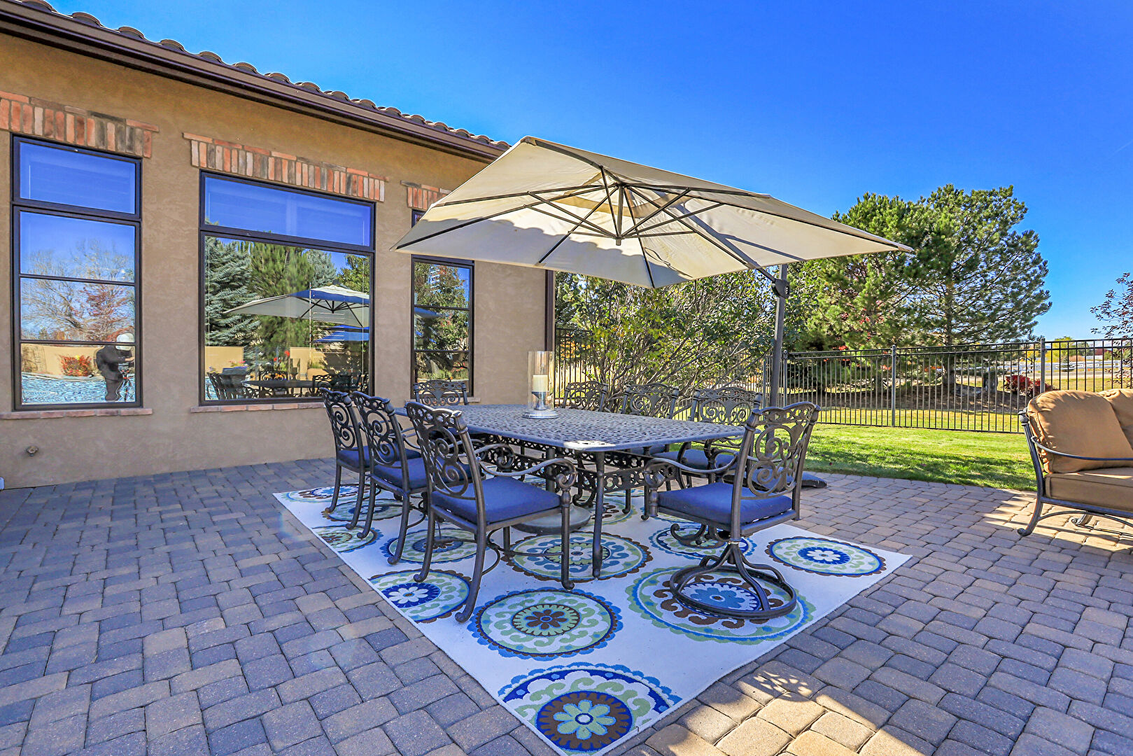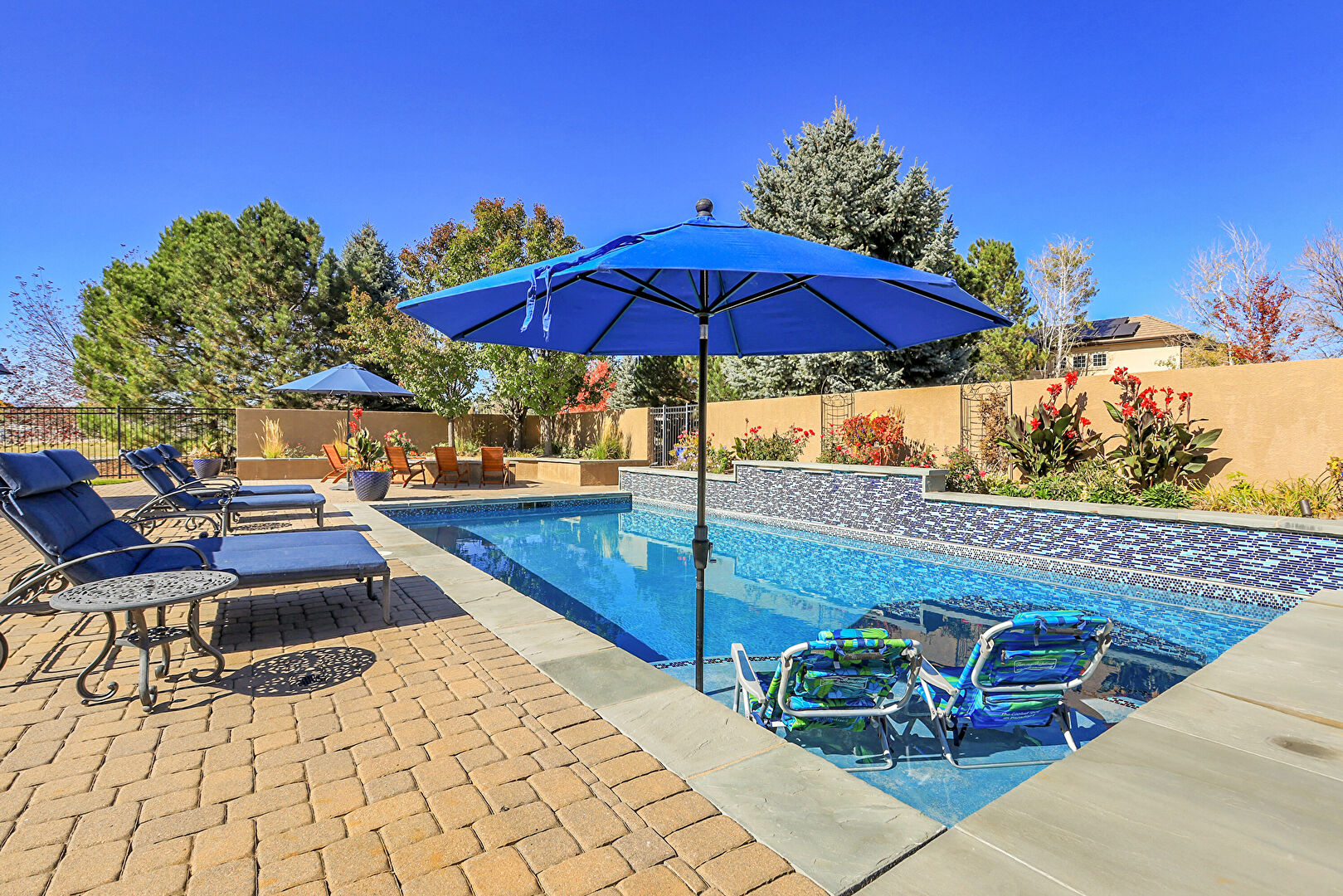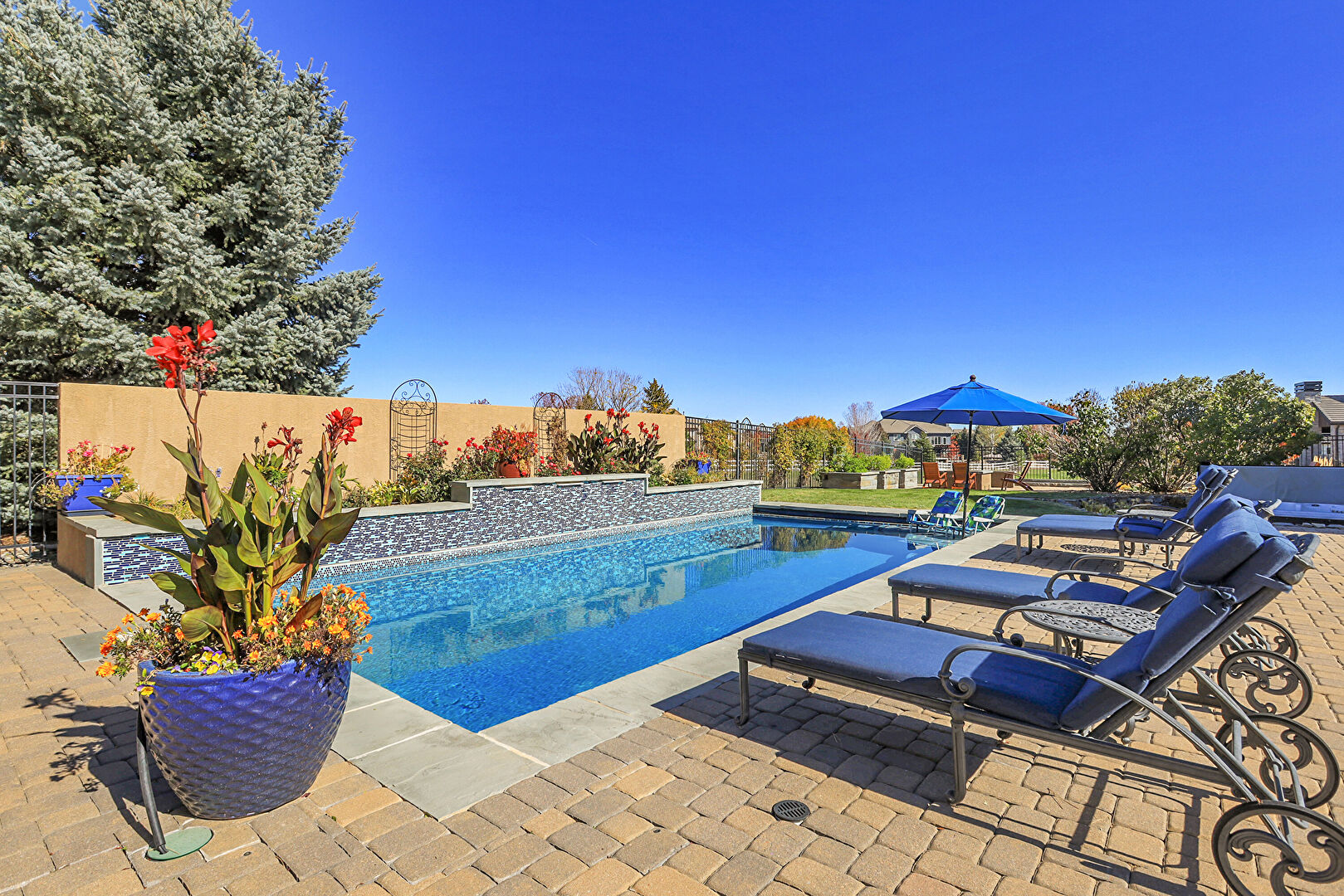 Downspout, Fence, Grill, Lawn, Outdoor Bar, Outdoor Dining Area, Outdoor Living Space, Patio, Pool, Stone Siding, Stucco Siding, Tile Roof, Fence, Gutters, Outdoor Kitchen, Outdoor Living Space, Patio, Pool
