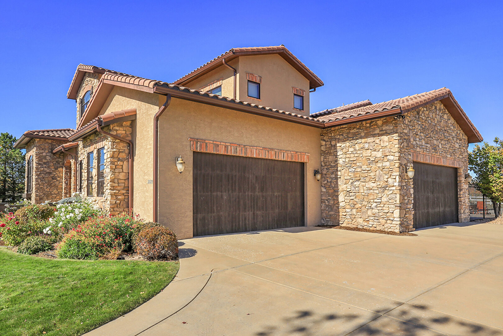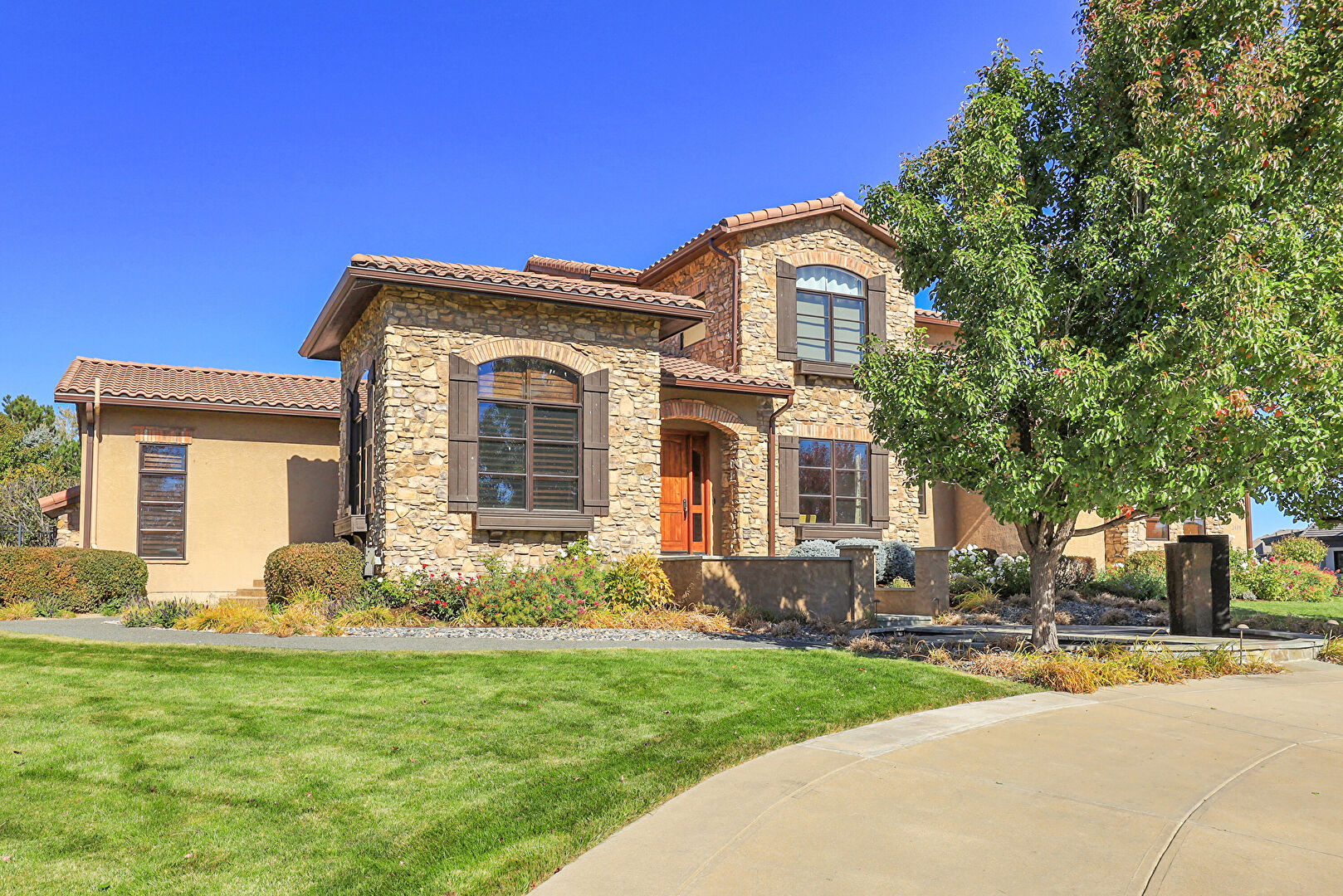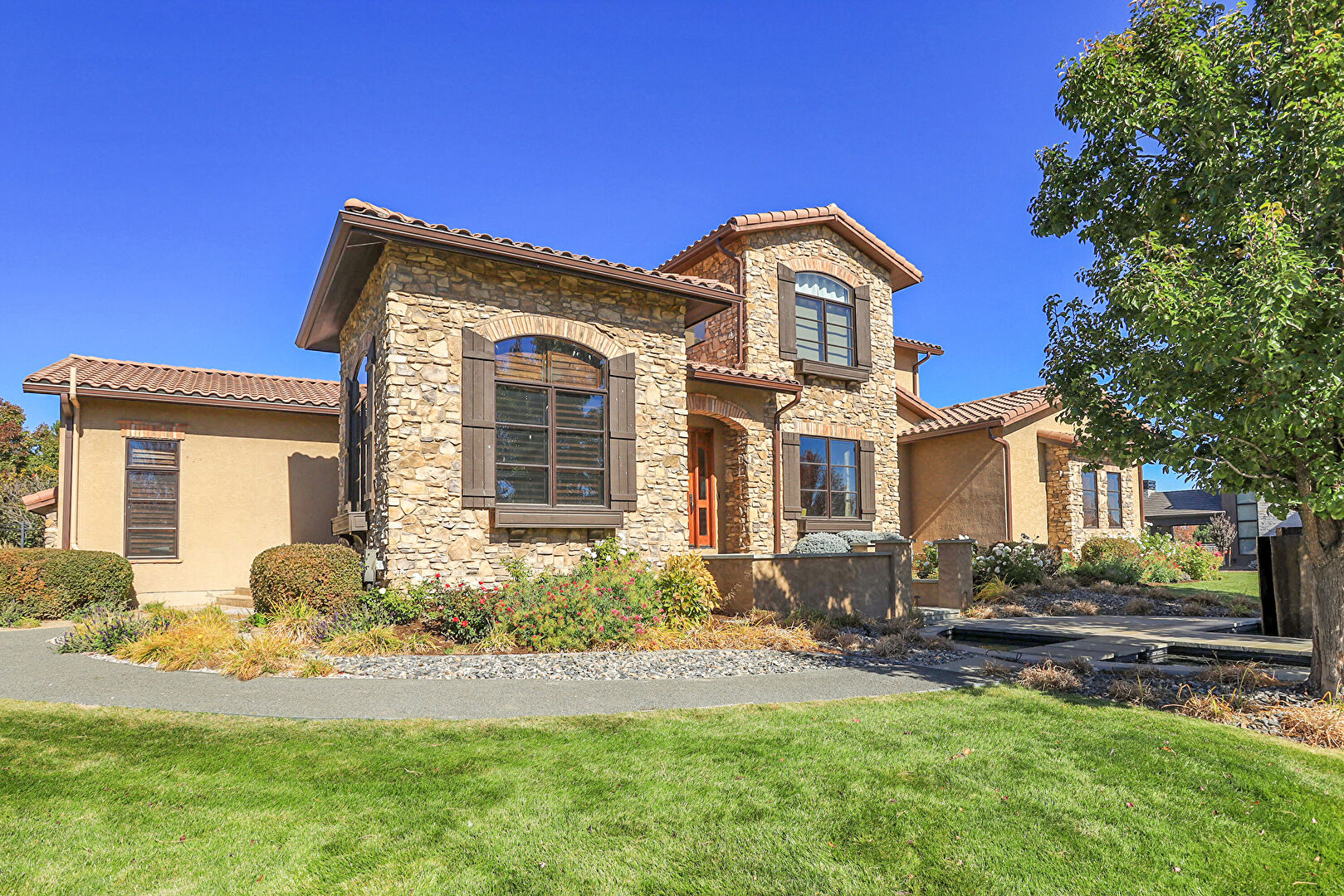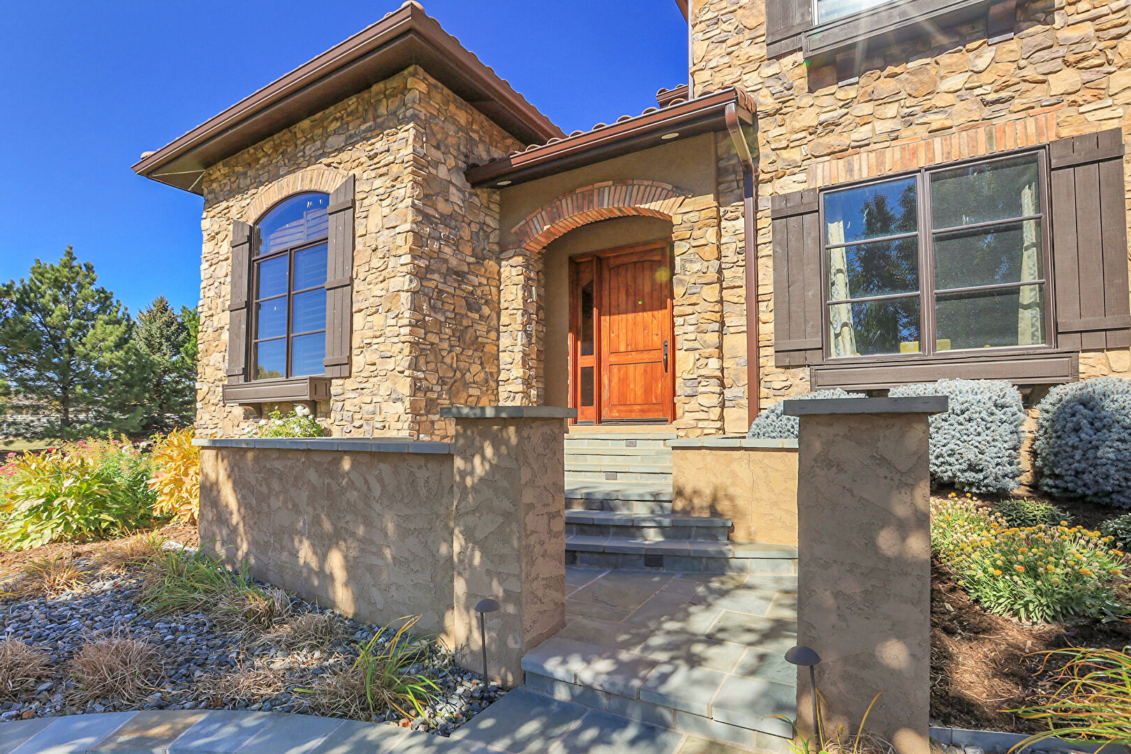 Downspout, Driveway, Electric Meter, Fence, Gutters, Lawn, Stone Siding, Stoop, Stucco Siding, Tile Roof, Gutters, Lawn, Stone Siding, Stoop, Stucco Siding, Tile Roof