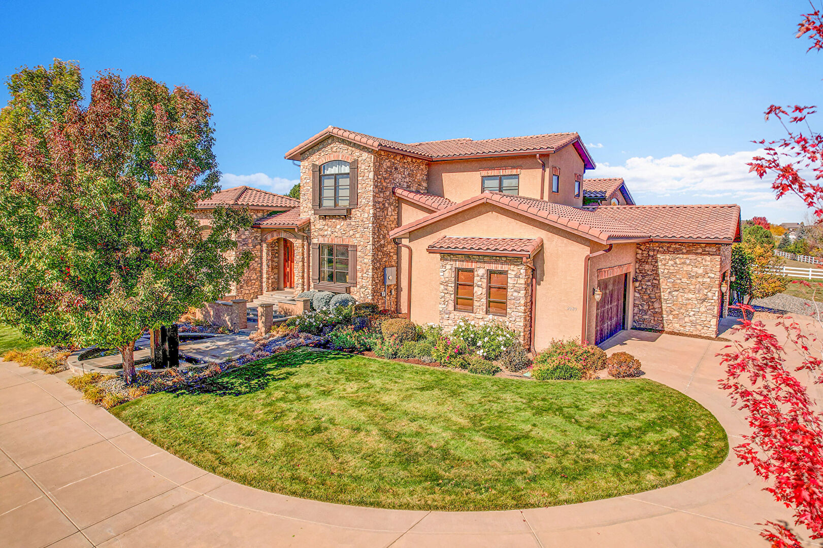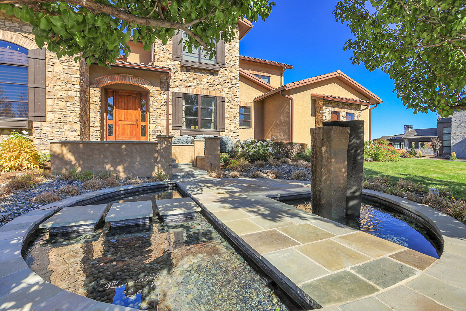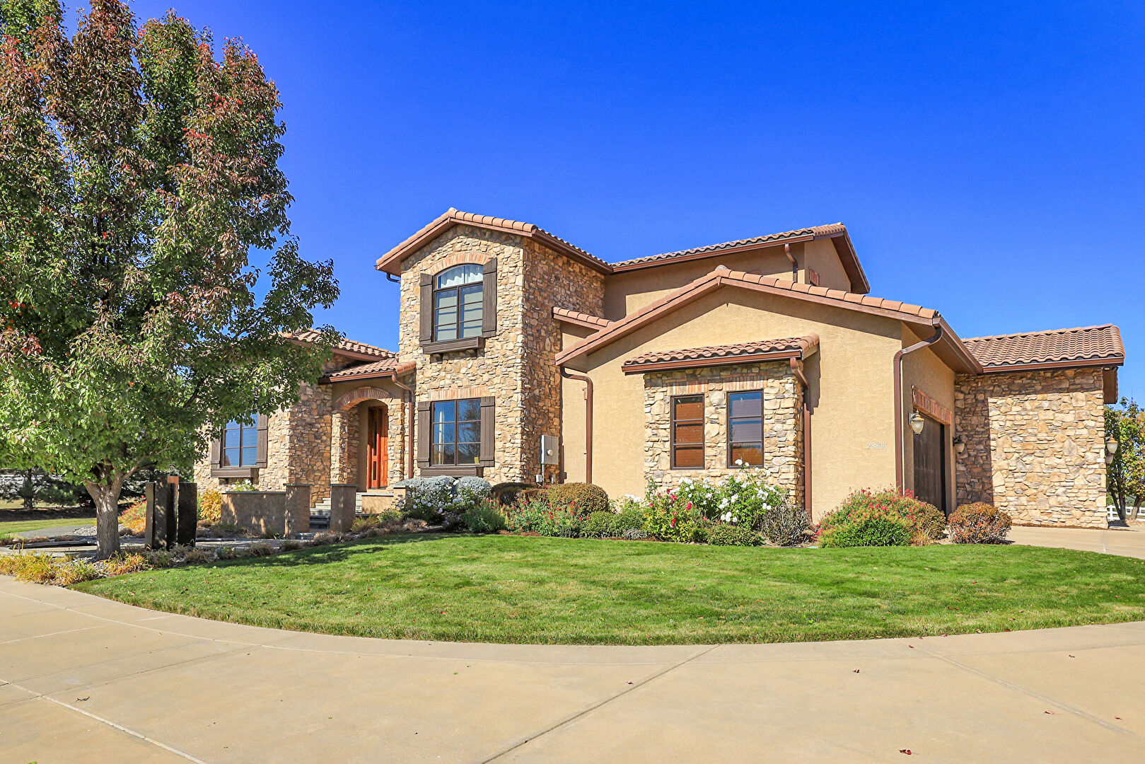 Downspout, Driveway, Electric Meter, Fence, Gutters, Lawn, Stone Siding, Stoop, Stucco Siding, Tile Roof, Gutters, Lawn, Stone Siding, Stoop, Stucco Siding, Tile Roof
