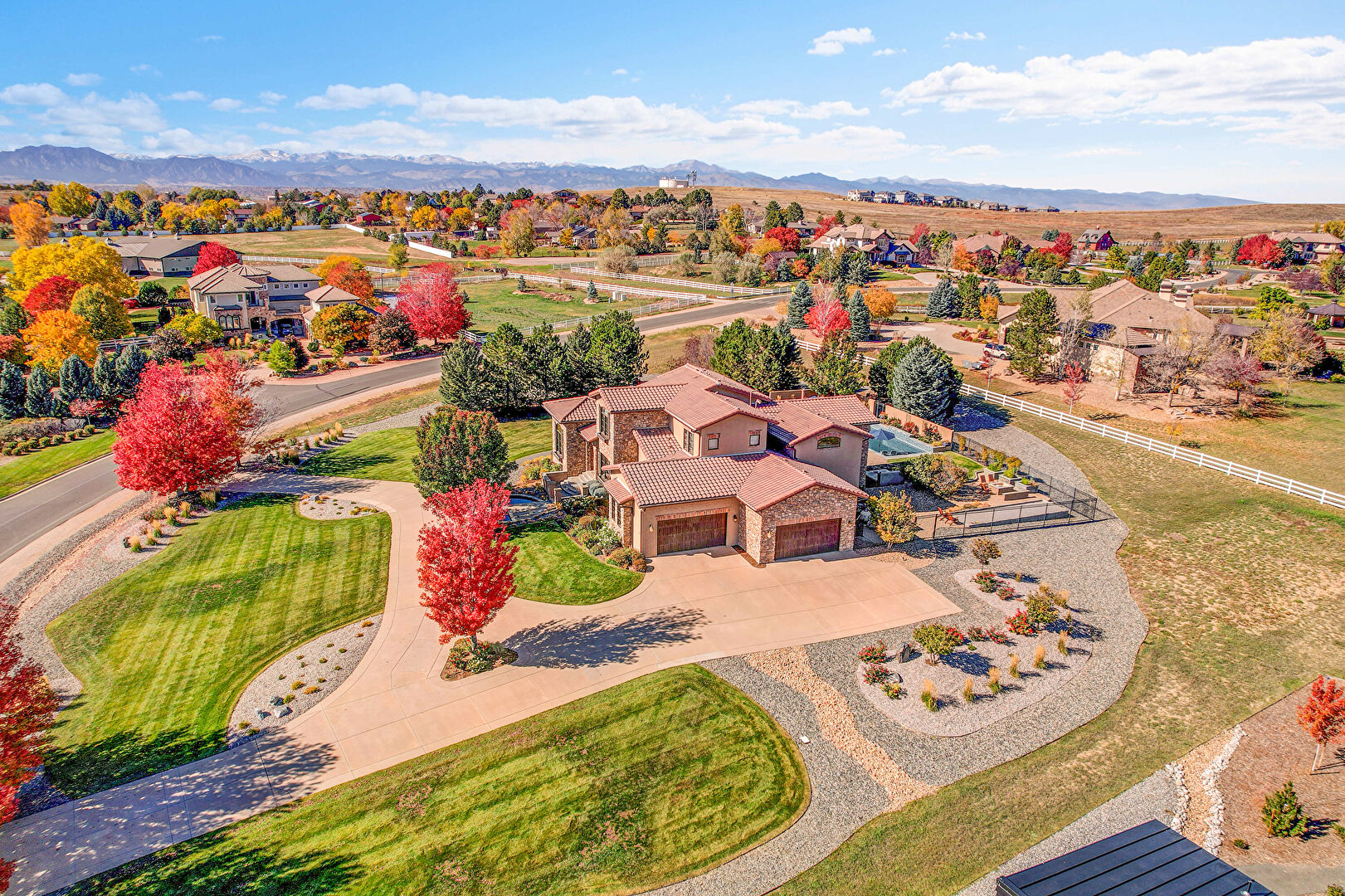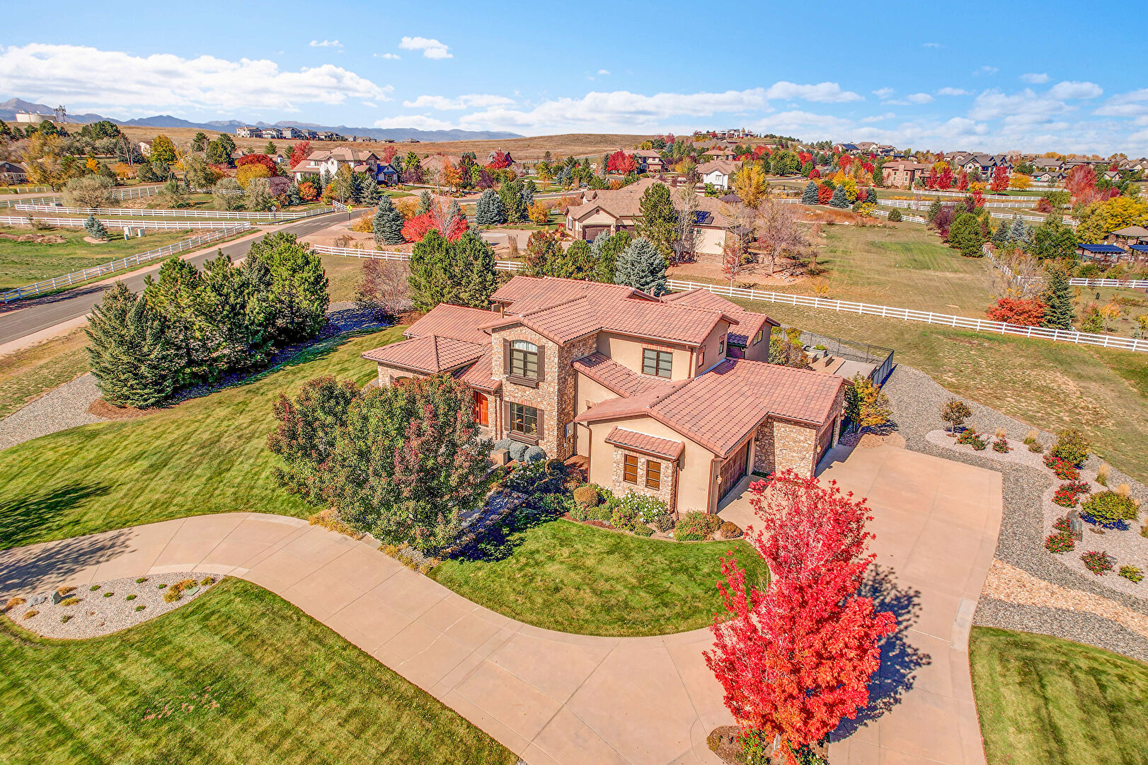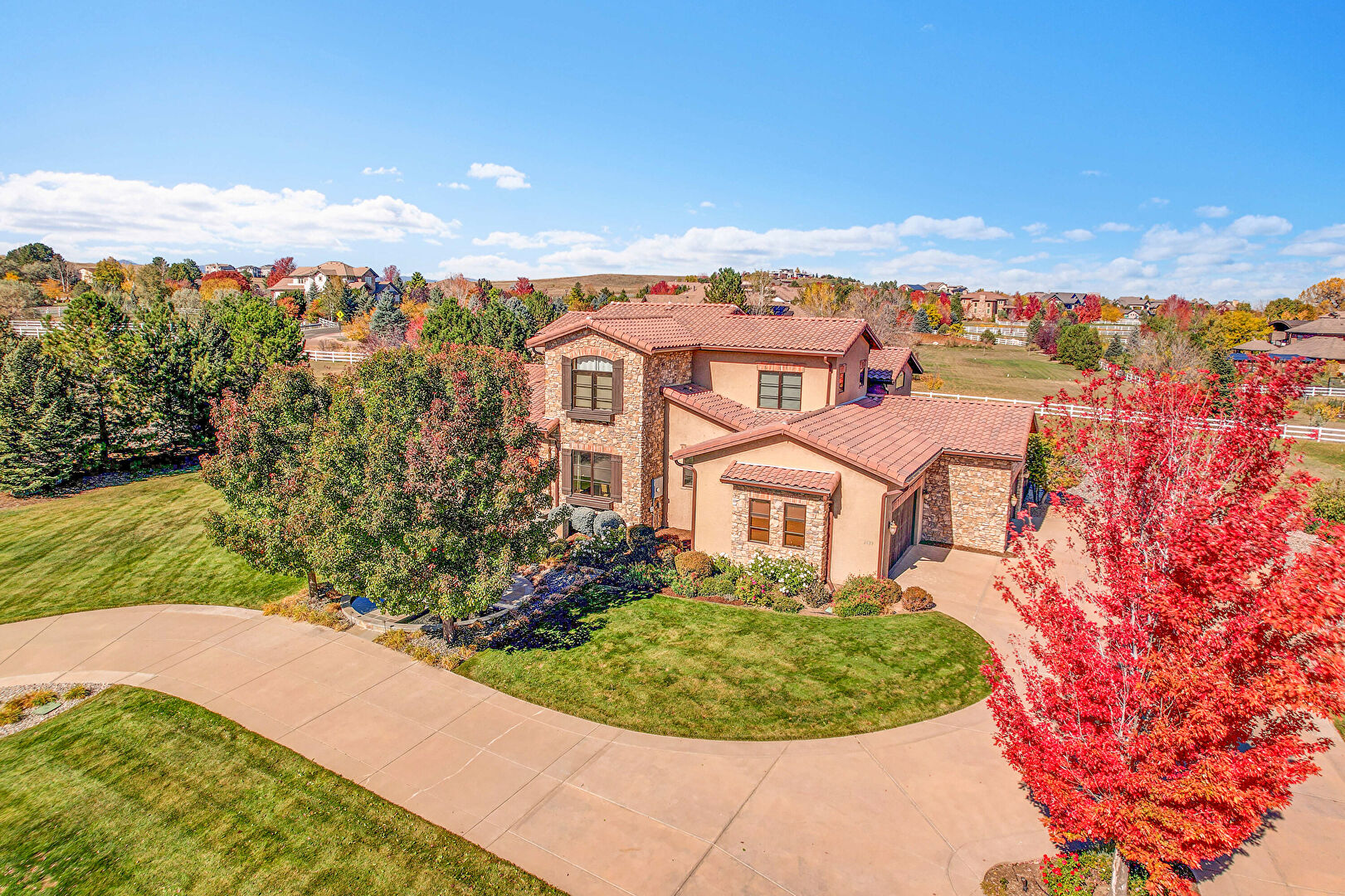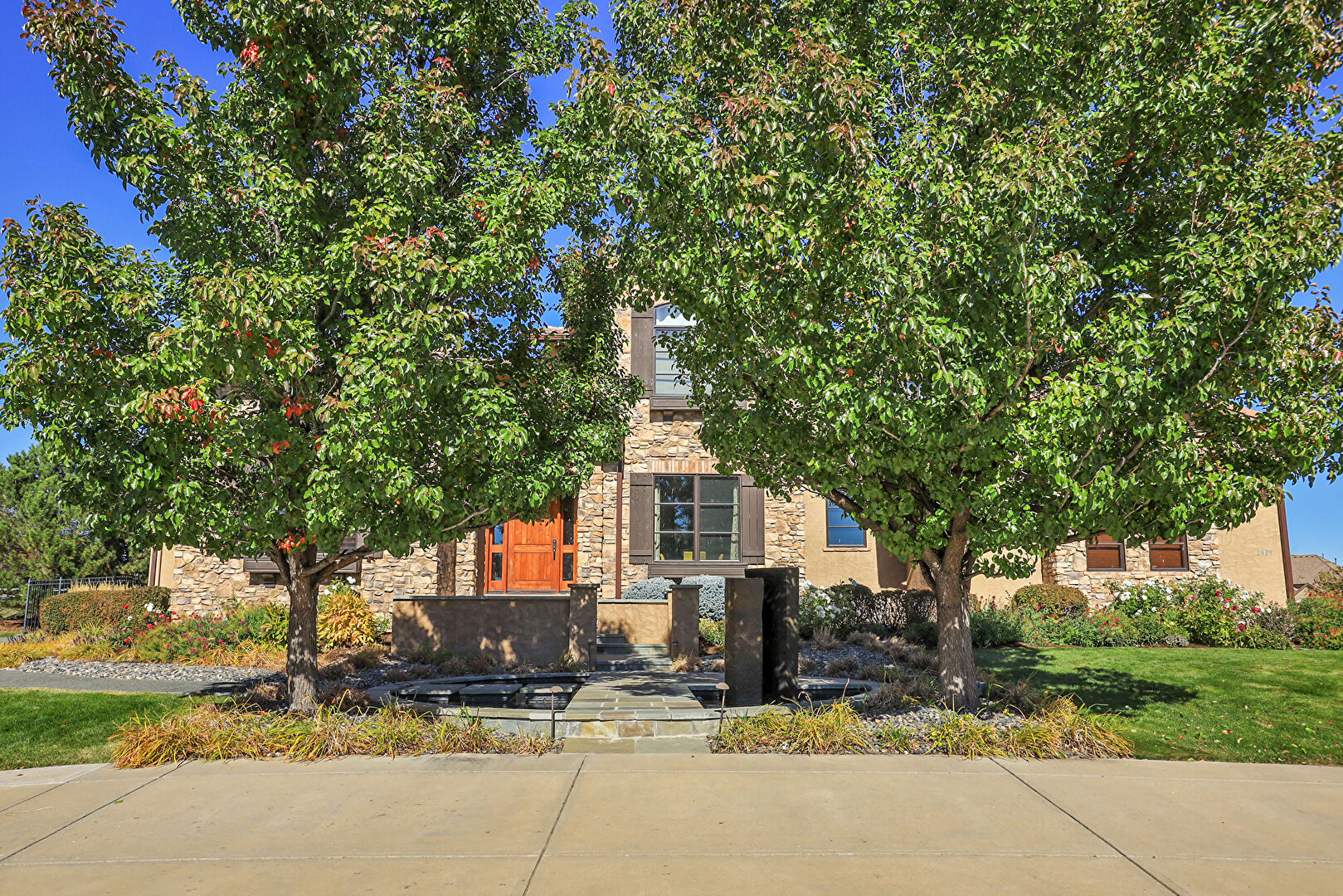 Downspout, Driveway, Electric Meter, Fence, Gutters, Lawn, Stone Siding, Stoop, Stucco Siding, Tile Roof, Gutters, Lawn, Stone Siding, Stoop, Stucco Siding, Tile Roof