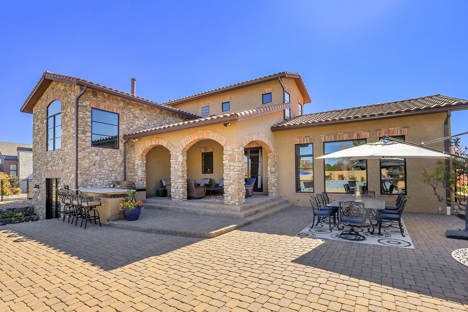 Downspout, Gazebo, Gutters, Outdoor Dining Area, Outdoor Living Space, Patio, Pool, Stone Siding, Stucco Siding, Tile Roof