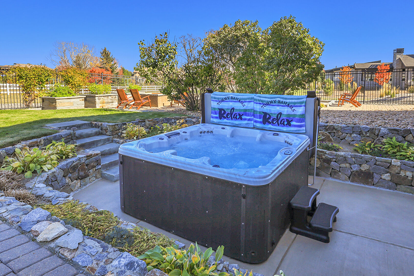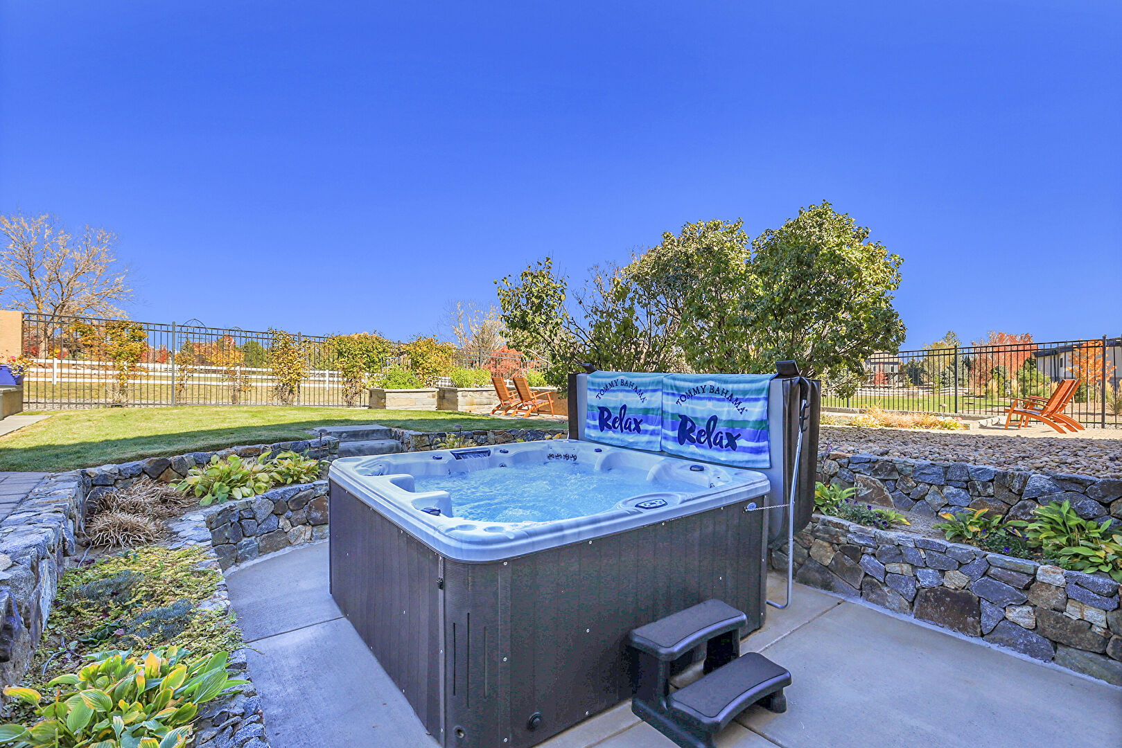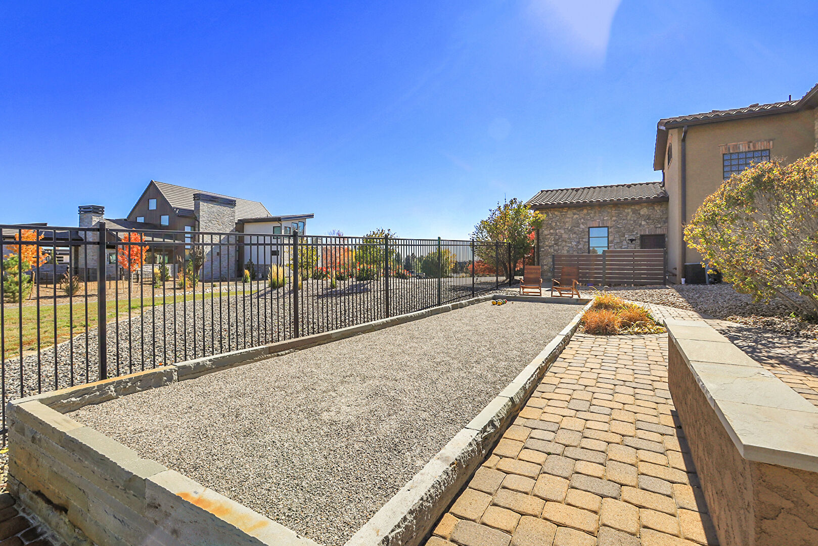 Fence, Hot Tub, Lawn, Outdoor Bar, Patio, Pool, Bocce Ball, Fence, Fire Pit