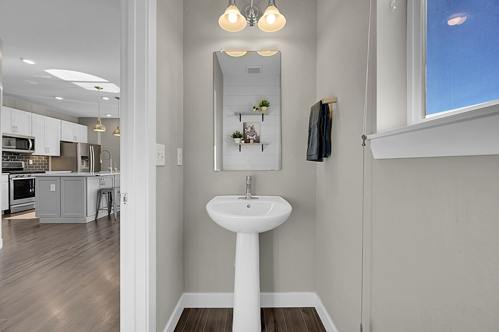 Baseboards Wall, Combined Bath Shower, Drywall, Full Bathroom, Half Bathroom, Recessed Lighting, Vanity, Vent, Wood Finish Floor, Recessed Lighting, Skylight, Tile Floor