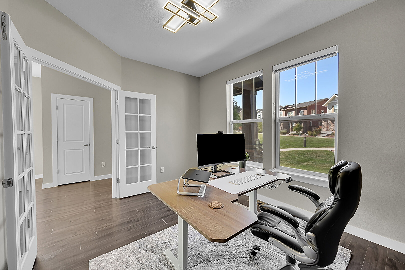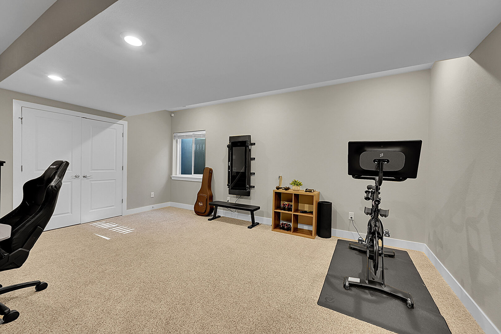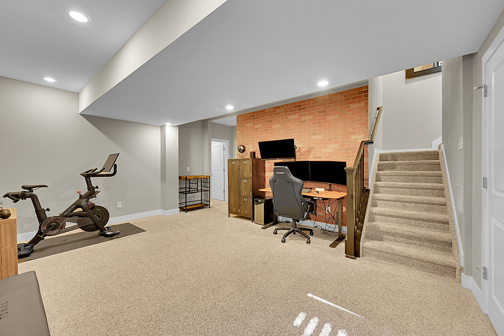 Accent Wall, Baseboards Wall, Basement, Drywall, French Doors, Natural Light, Office Area, Paneling Wall, Recessed Lighting, Vent, Wood Finish Floor, Carpet, Drywall, Office Area