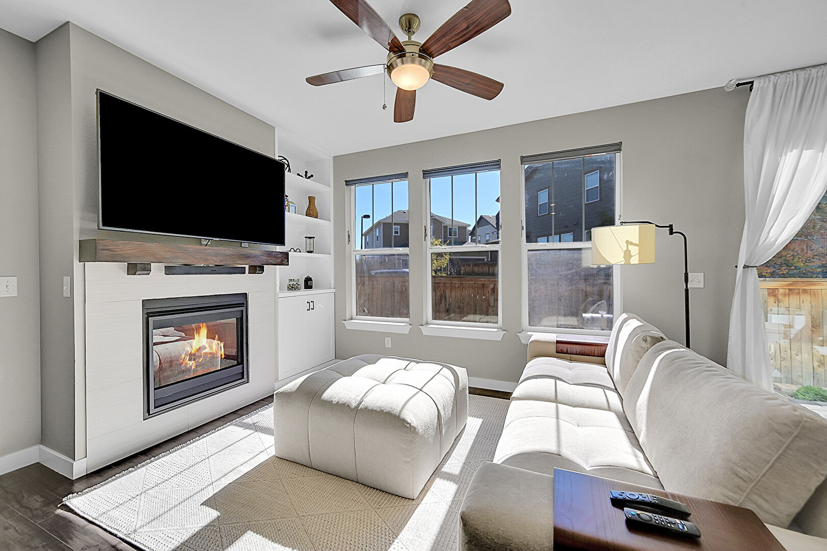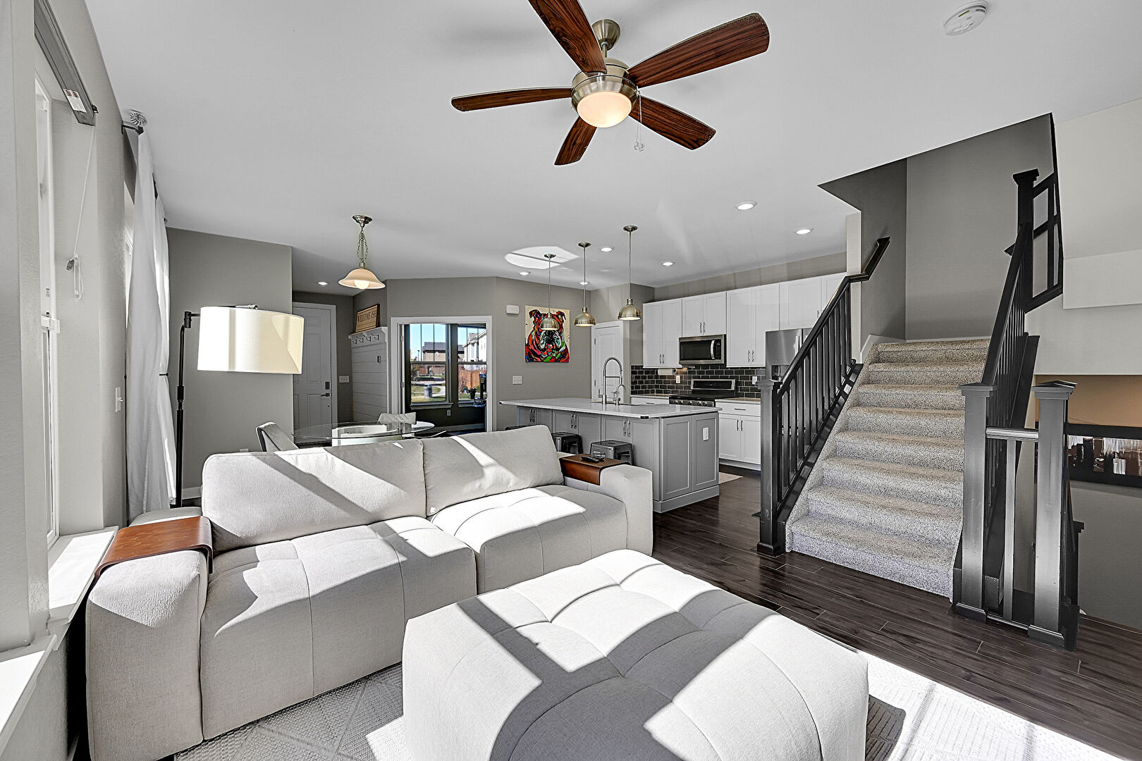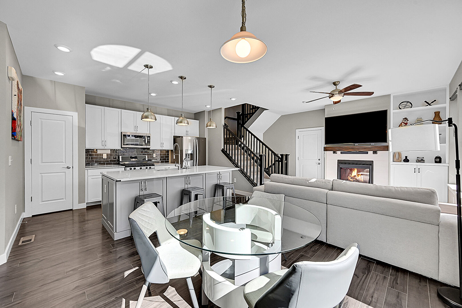 Baseboards Wall, Ceiling Fan, Drywall, Fireplace, Gray Cabinets, Kitchen Bar, Kitchen Island, Natural Light, One Wall Kitchen, Opens To Living Area, Pendant Lighting, Recessed Lighting, Shaker Cabinets, Stone Countertops, Vent, Wood Finish Floor, Baseboards Wall, Ceiling Fan, Drywall, Pendant Lighting, Shaker Cabinets