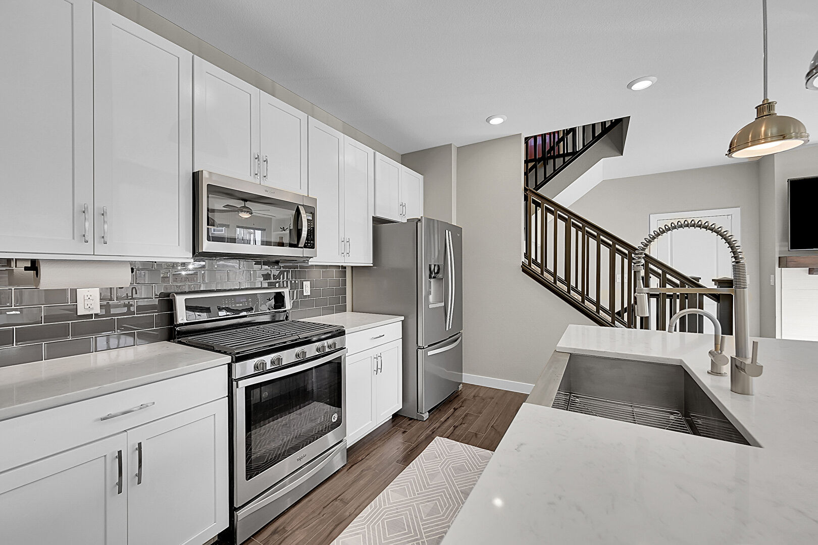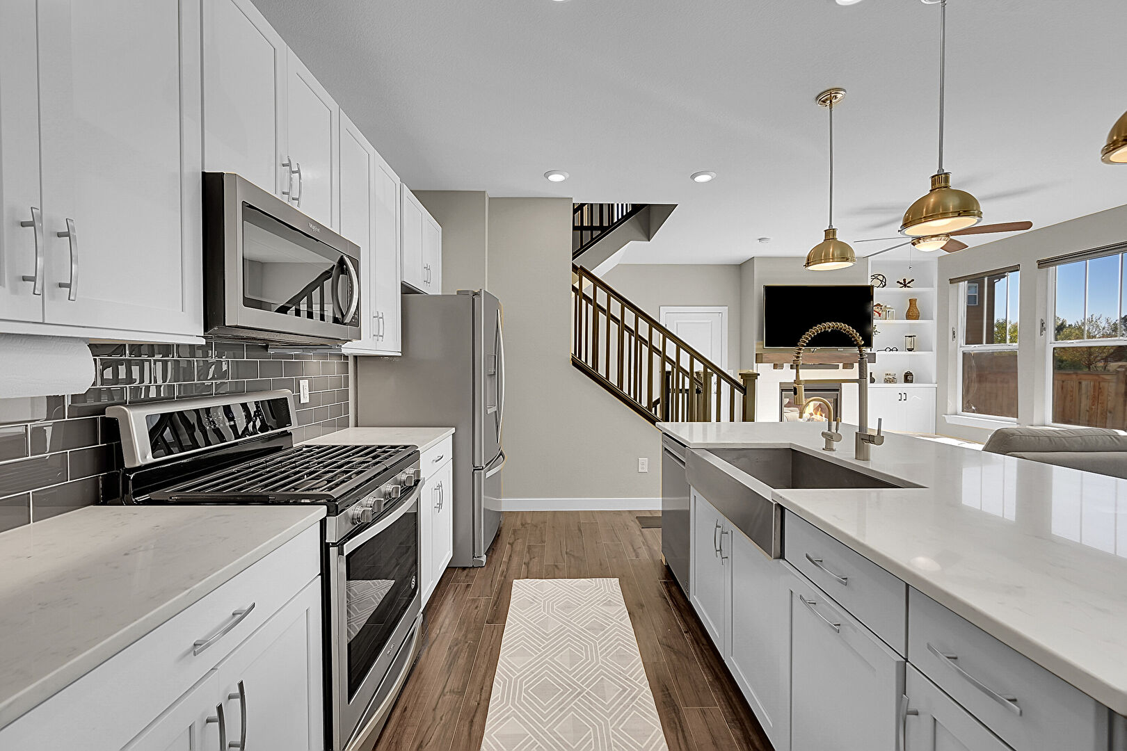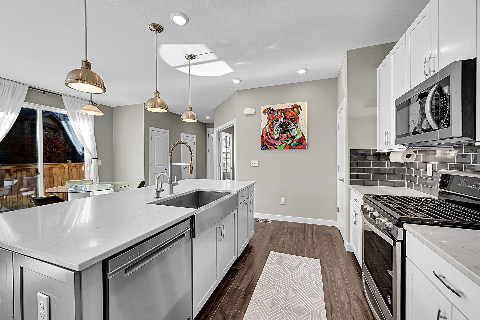 Baseboards Wall, Ceiling Fan, Drywall, Fireplace, Gray Cabinets, Kitchen Bar, Kitchen Island, Natural Light, One Wall Kitchen, Opens To Living Area, Pendant Lighting, Recessed Lighting, Shaker Cabinets, Stone Countertops, Vent, Wood Finish Floor, Baseboards Wall, Ceiling Fan, Drywall, Pendant Lighting, Shaker Cabinets