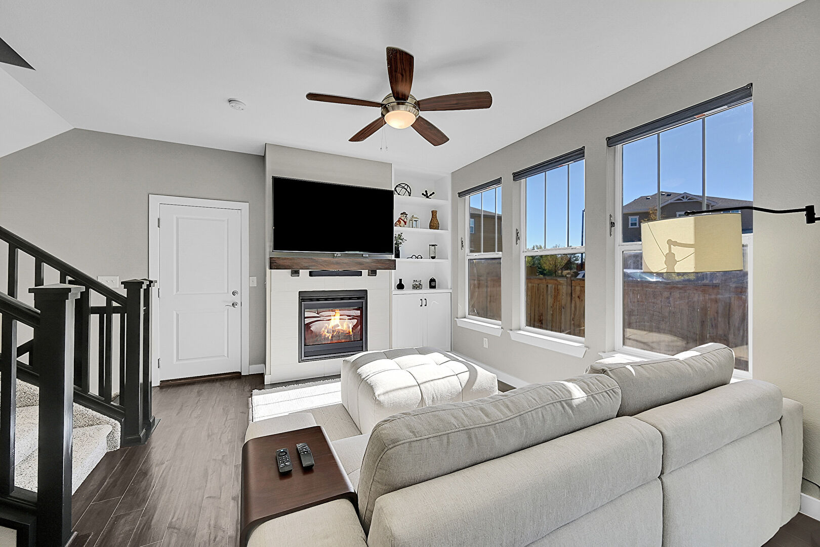 Baseboards Wall, Built In Shelves, Carpet, Ceiling Fan, Drywall, Fireplace, Natural Light, One Wall Kitchen, Recessed Lighting, Smoke Carbon Monoxide Detector, Stairs, Vent, Wood Finish Floor, Baseboards Wall, Carpet, Ceiling Fan, Stairs