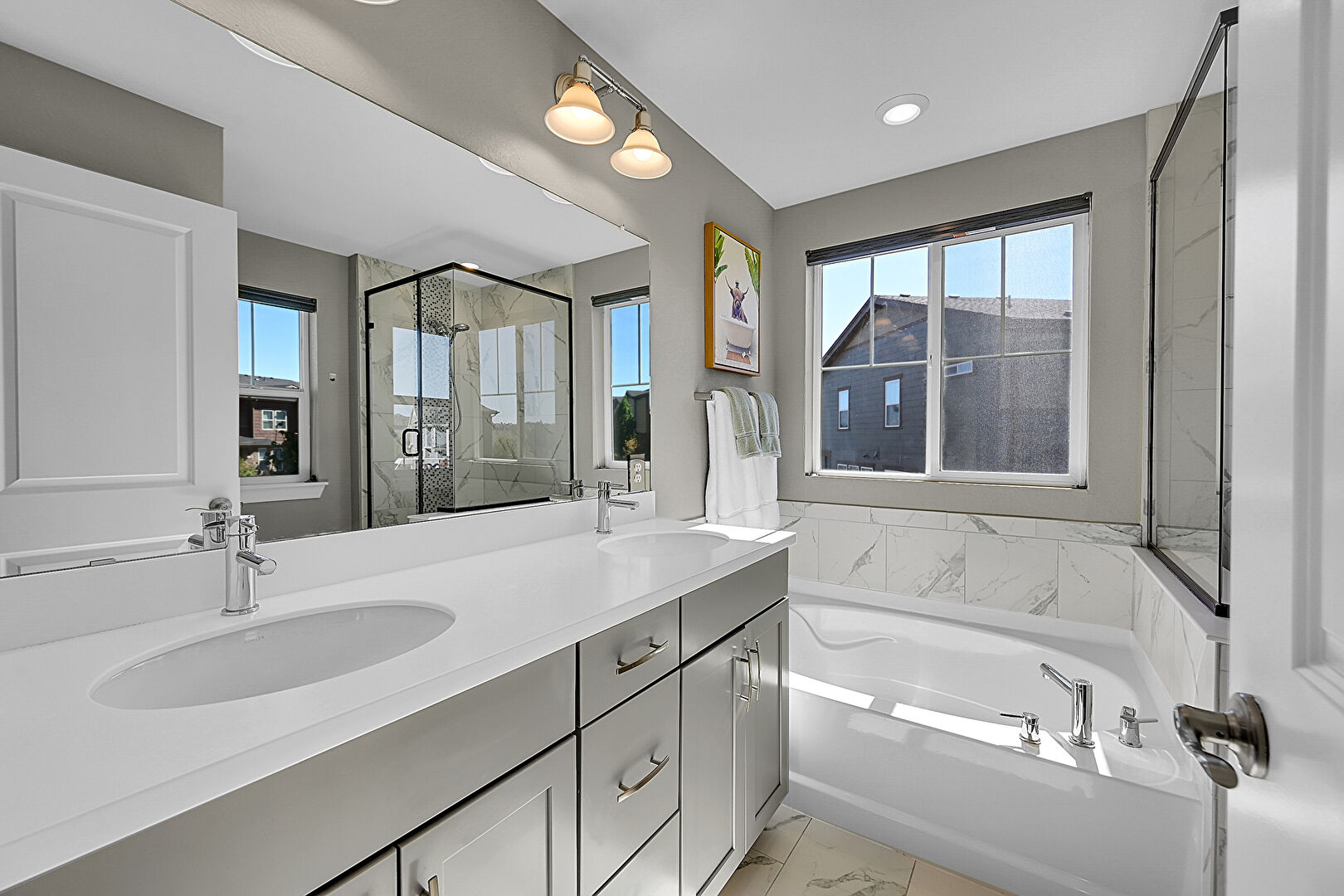 Double Vanity, Drywall, Full Bathroom, Marble Finish Floor, Natural Light, Recessed Lighting, Vanity, Full Bathroom, Recessed Lighting