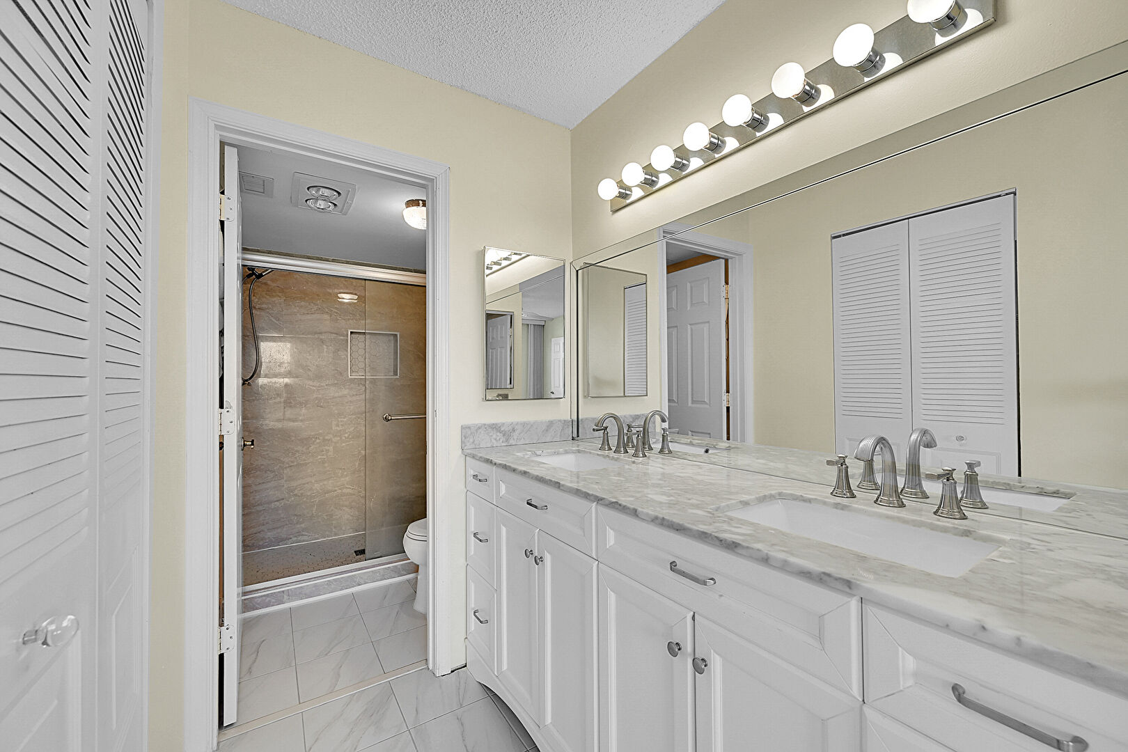 Closet, Drywall, Full Bathroom, Marble Finish Floor, Textured Ceiling, Vent, Double Vanity, Drywall