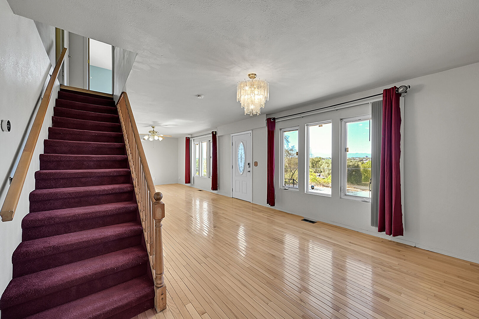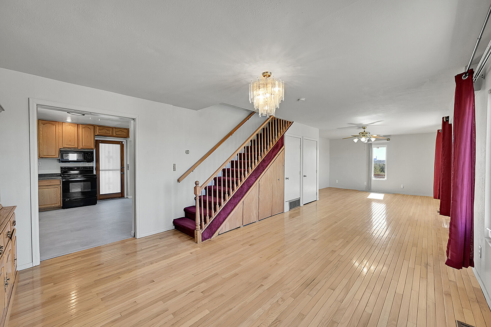 Baseboards Wall, Ceiling Fan, Drywall, Natural Light, Notable Chandelier, Textured Ceiling, Vent, Wood Finish Floor, Stairs
