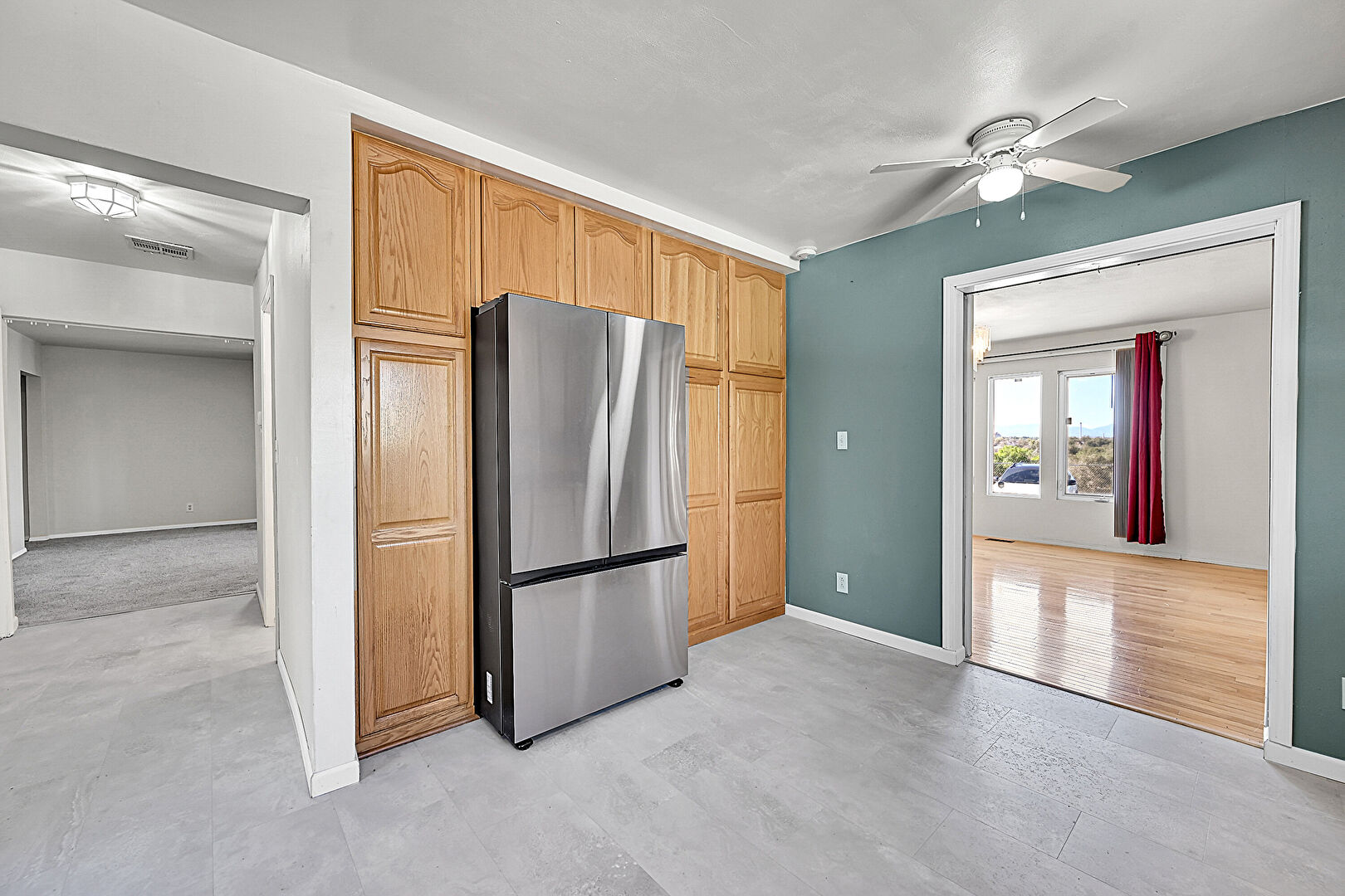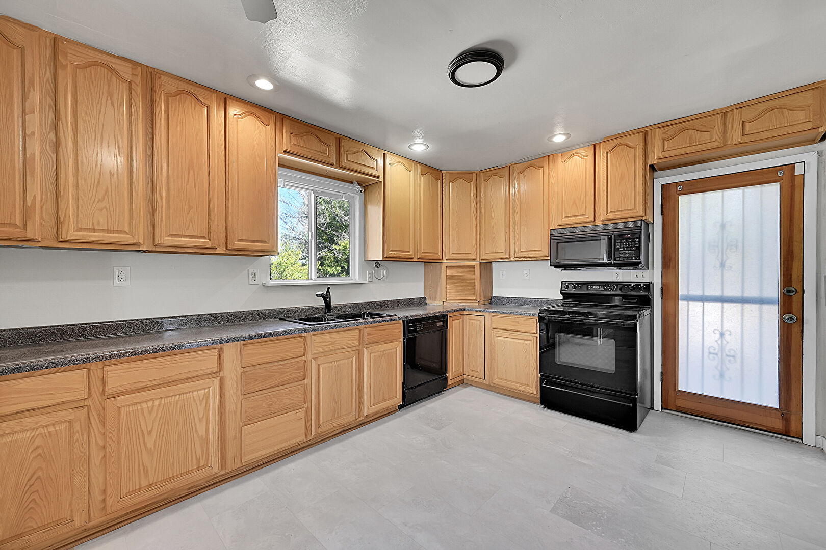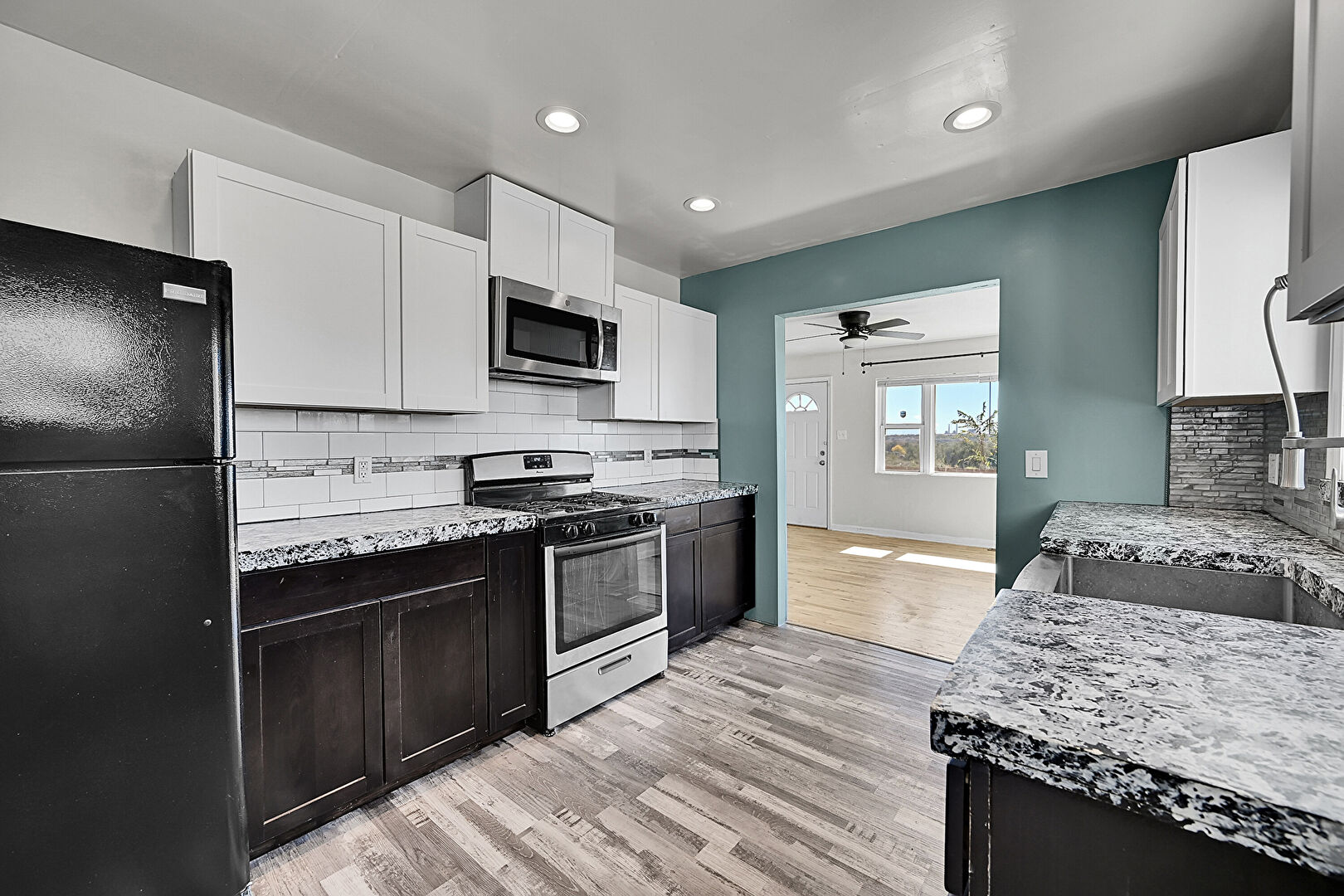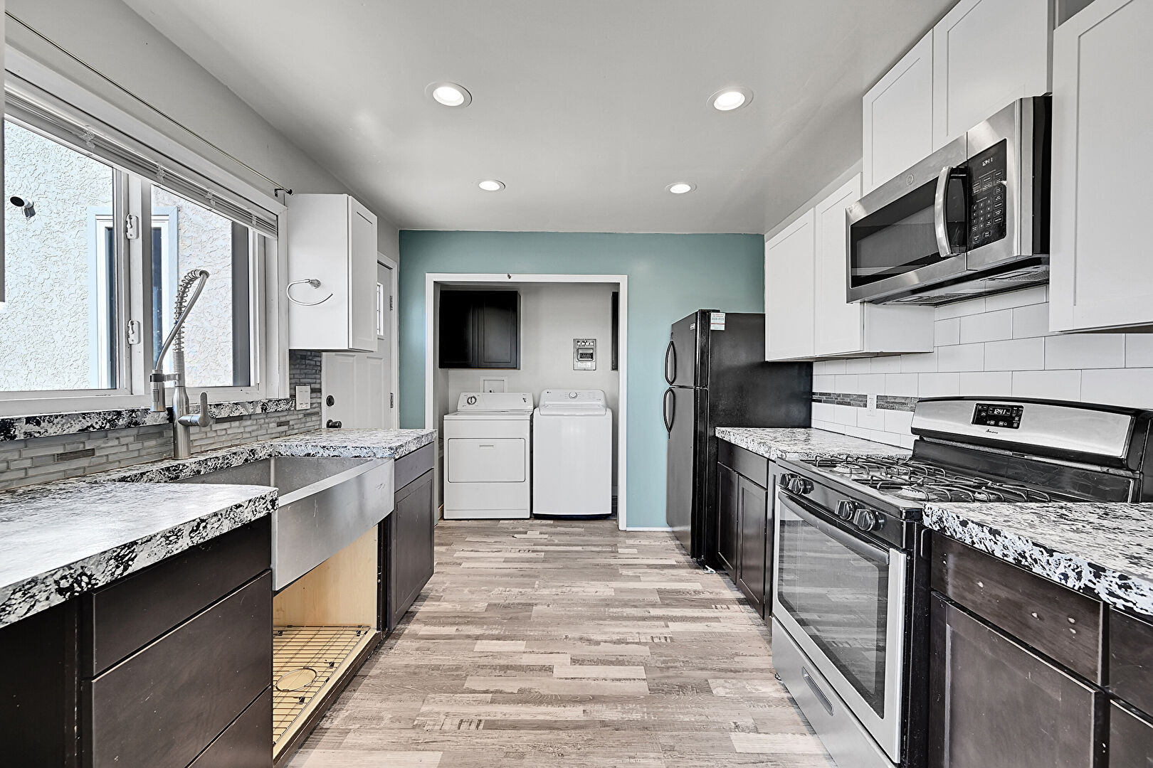 Arched Cabinets, Baseboards Wall, Black Cabinets, Ceiling Fan, Dark Brown Cabinets, Drywall, Fire Extinguisher, Galley Kitchen, Laundry, Medium Brown Cabinets, Natural Light, Raised Cabinets, Recessed Lighting, Shaker Cabinets, Smoke Carbon Monoxide Detector, Stone Countertops, Vent, Vinyl Floor, Wood Finish Floor, Arched Cabinets, Baseboards Wall, Black Cabinets, Drywall, Raised Cabinets, Recessed Lighting, Vinyl Floor, Wood Finish Floor