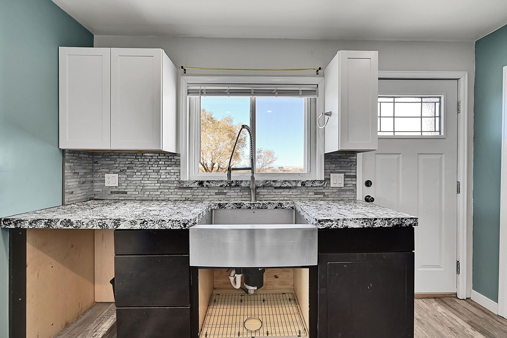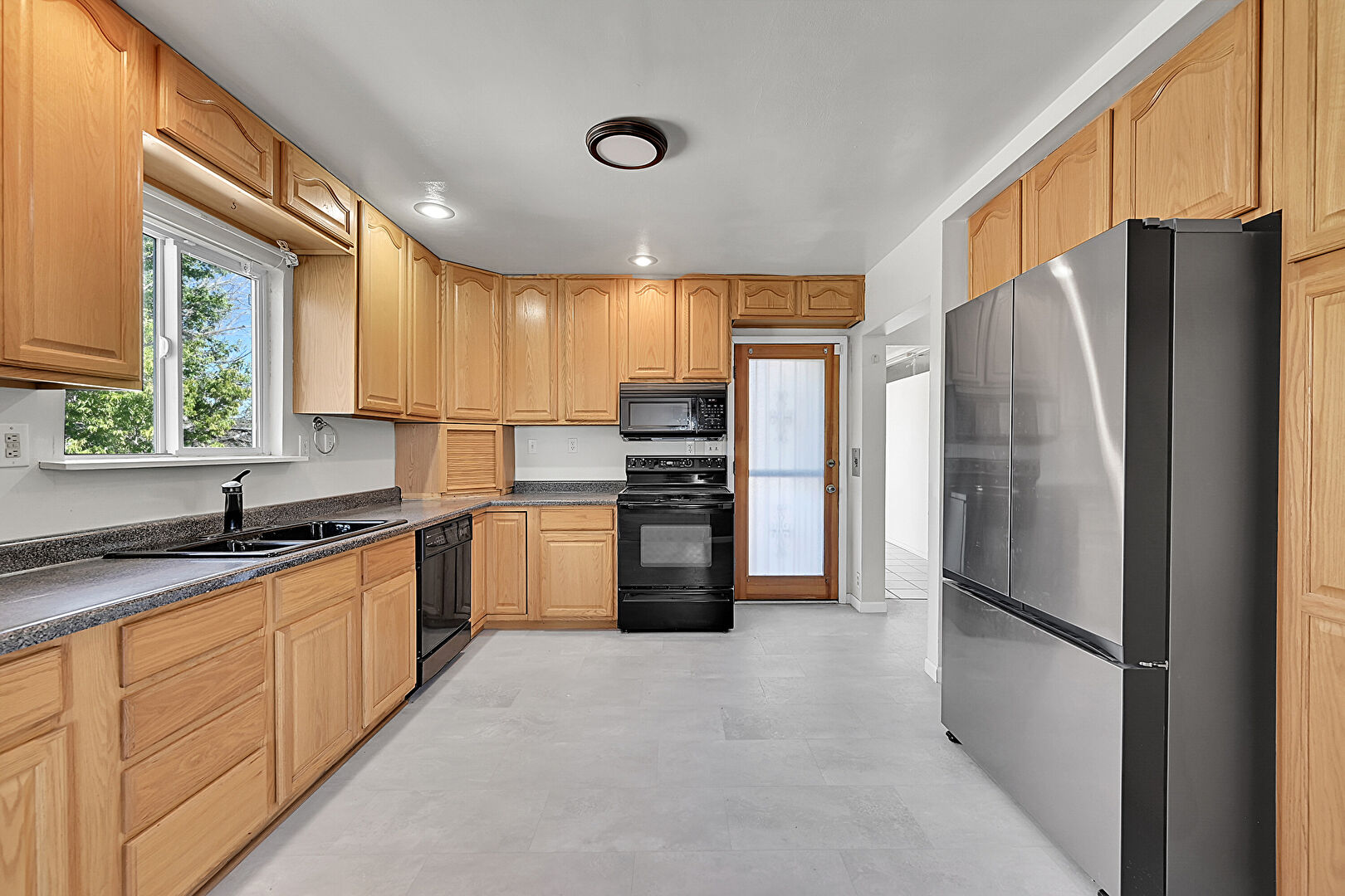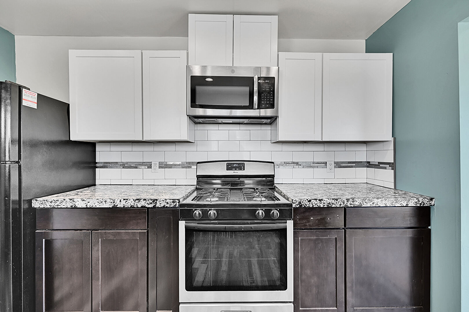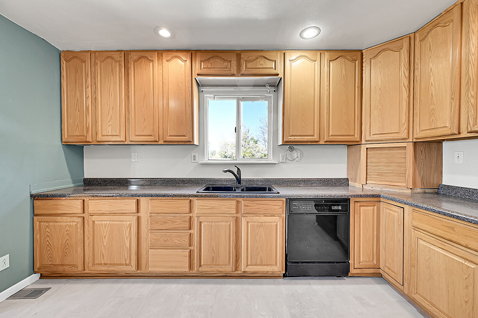 Arched Cabinets, Baseboards Wall, Black Cabinets, Ceiling Fan, Dark Brown Cabinets, Drywall, Fire Extinguisher, Galley Kitchen, Laundry, Medium Brown Cabinets, Natural Light, Raised Cabinets, Recessed Lighting, Shaker Cabinets, Smoke Carbon Monoxide Detector, Stone Countertops, Vent, Vinyl Floor, Wood Finish Floor, Arched Cabinets, Baseboards Wall, Black Cabinets, Drywall, Raised Cabinets, Recessed Lighting, Vinyl Floor, Wood Finish Floor