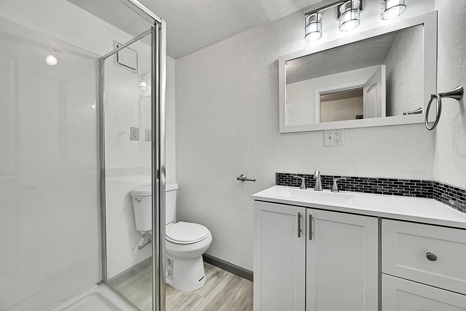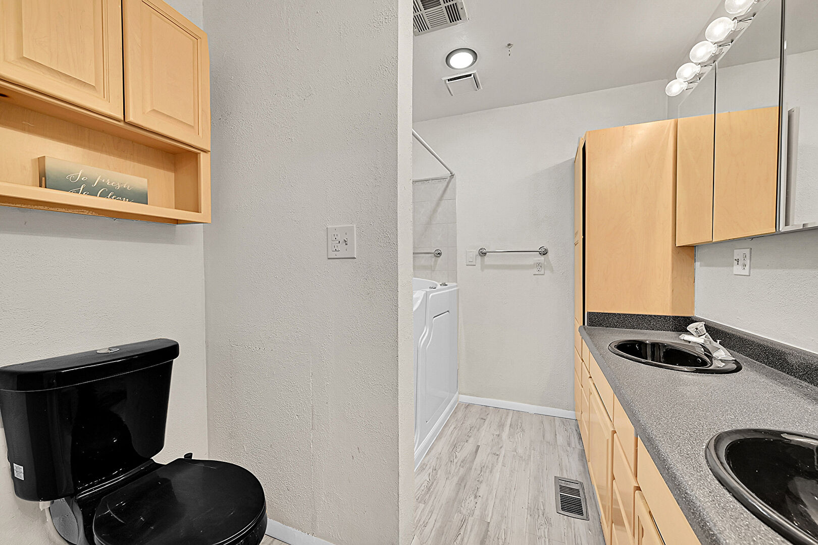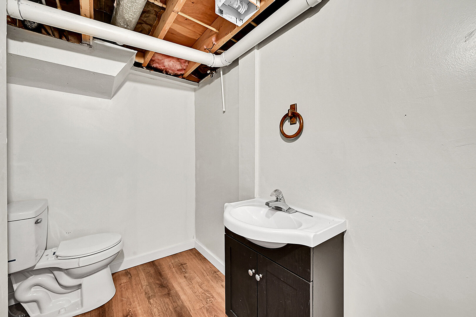 Baseboards Wall, Combined Bath Shower, Double Vanity, Drywall, Full Bathroom, Half Bathroom, Natural Light, Open Shelves, Raised Cabinets, Textured Ceiling, Textured Wall, Tile Floor, Vanity, Vent, Wood Finish Floor, Basement, Drywall, Full Bathroom, Textured Wall, Wood Finish Floor