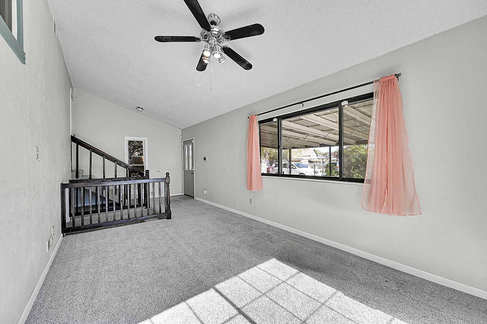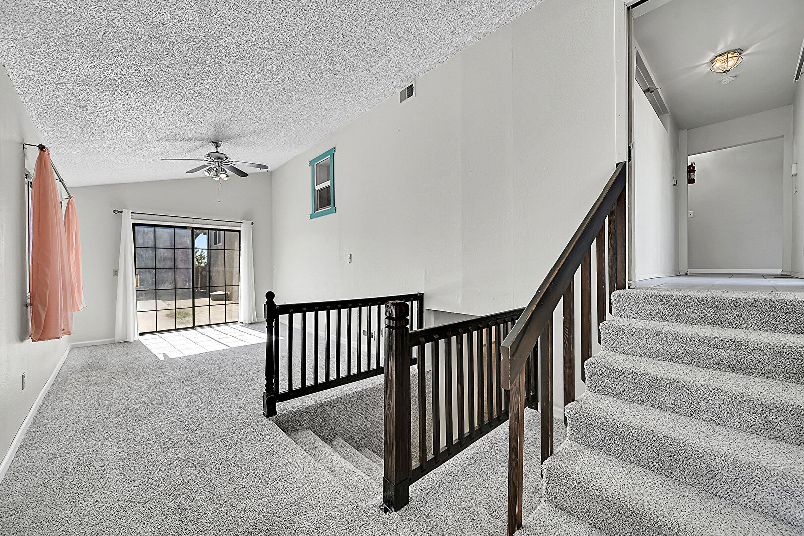 Baseboards Wall, Carpet, Ceiling Fan, Drywall, Natural Light, Stairs, Textured Ceiling, Vaulted Ceiling, Vent, Natural Light, Textured Ceiling