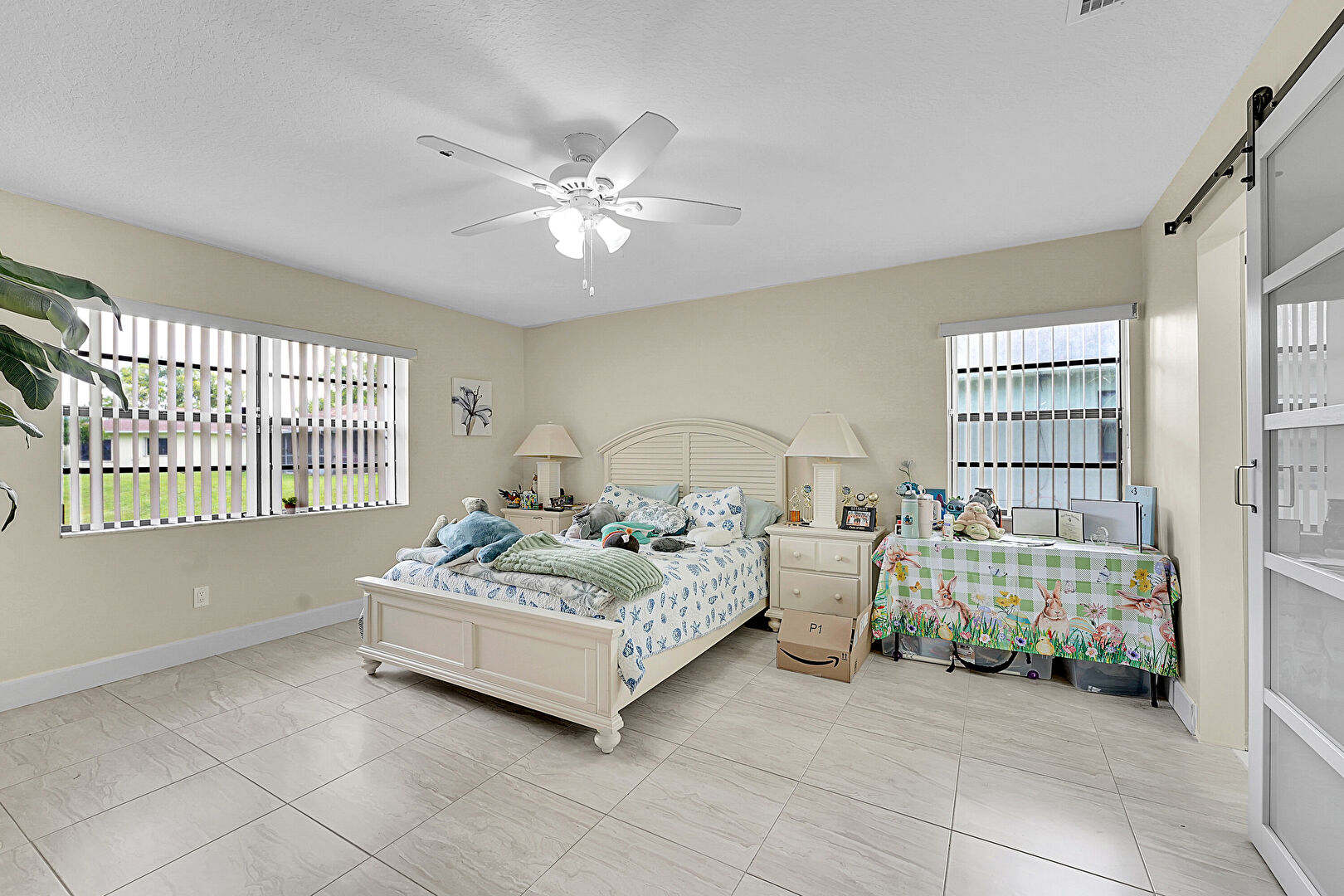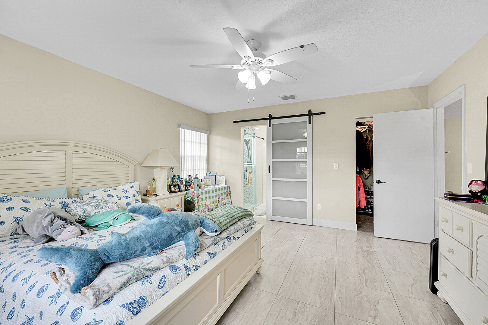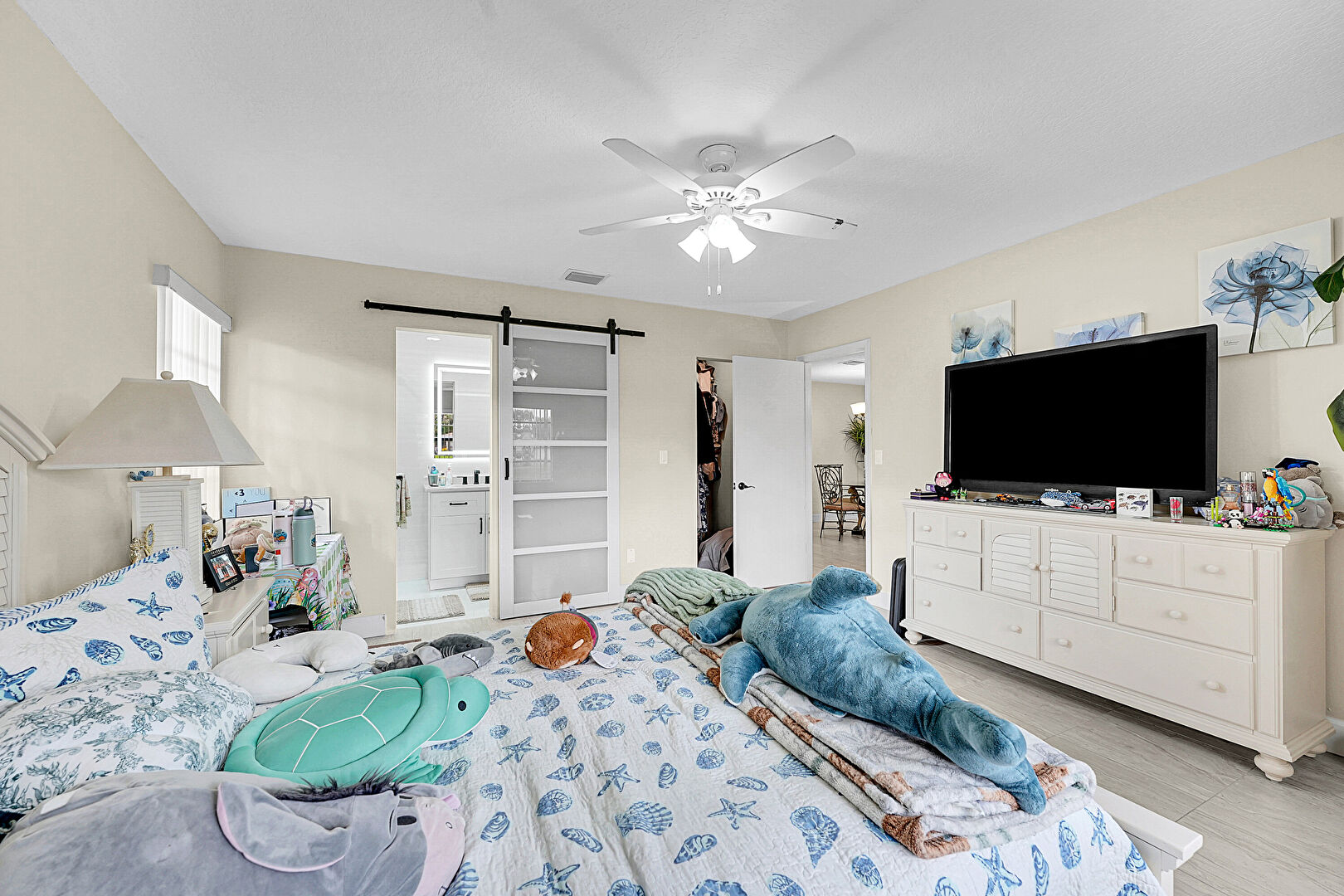 Barn Door, Baseboards Wall, Ceiling Fan, Drywall, Ensuite Bathroom, Natural Light, Tile Floor, Vent, Walk In Closet, Wood Finish Floor, Ceiling Fan, Vent, Walk In Closet