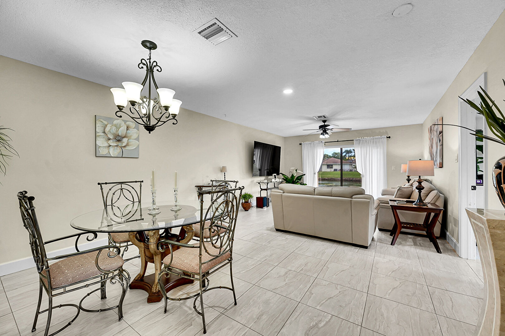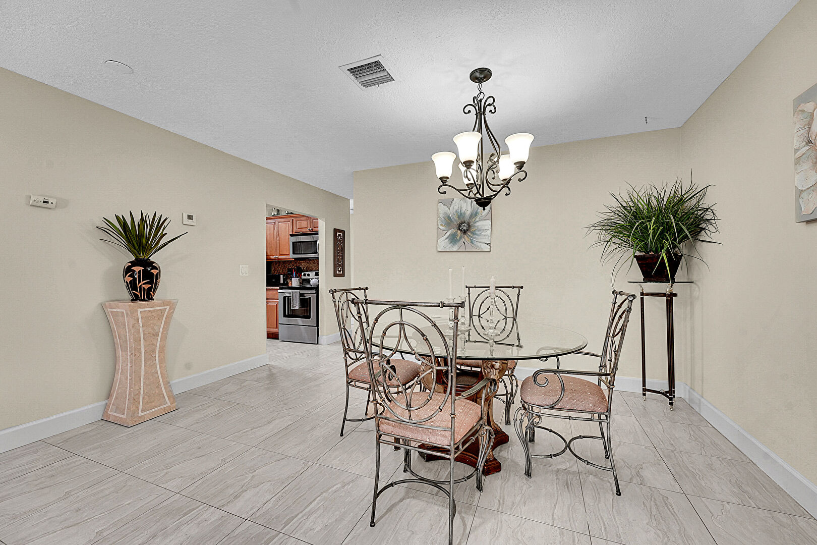 Baseboards Wall, Ceiling Fan, Drywall, Natural Light, Recessed Lighting, Tile Floor, Vent, Notable Chandelier, Tile Floor