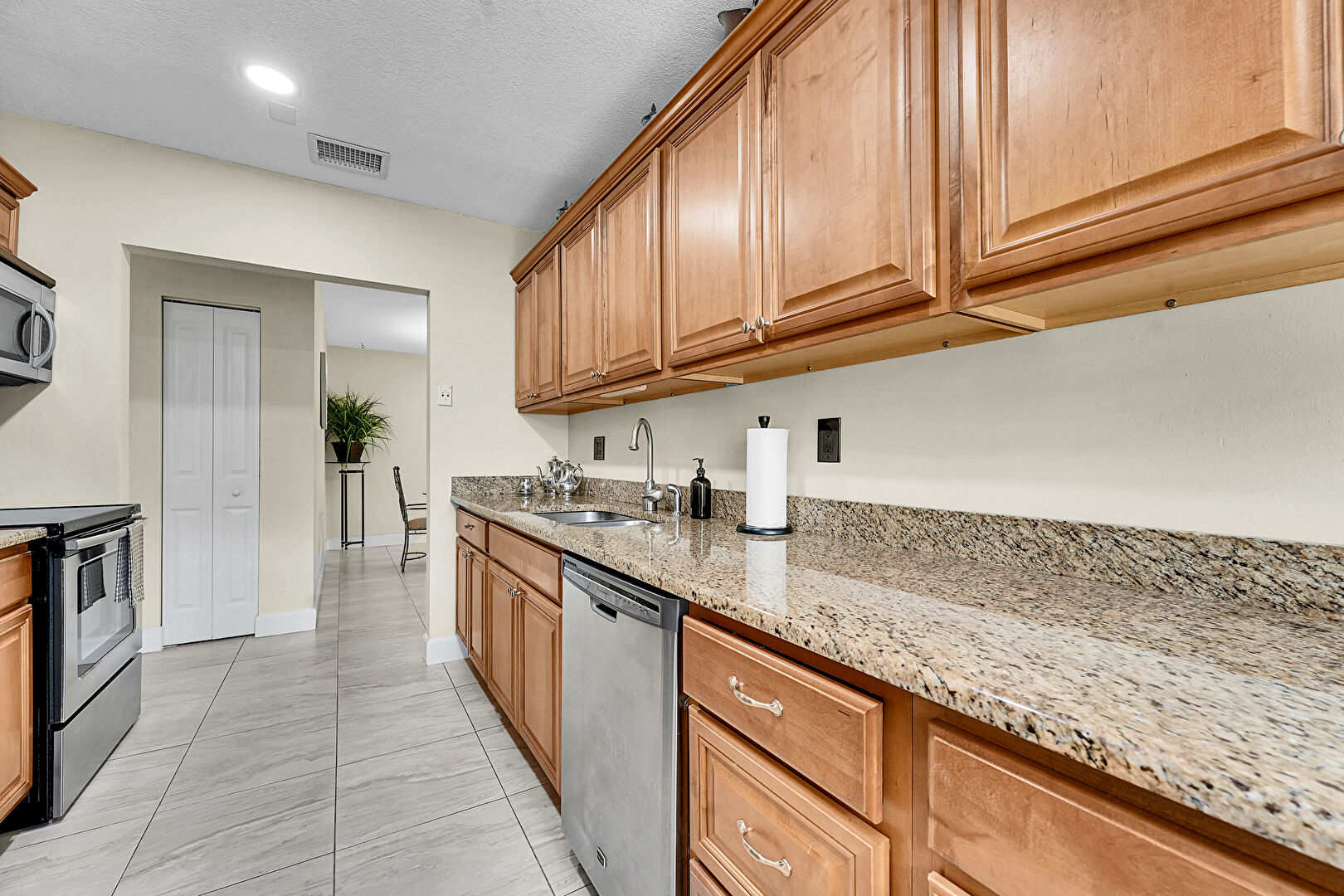 Baseboards Wall, Ceiling Fan, Crown Molding Cabinets, Drywall, Medium Brown Cabinets, Natural Light, Raised Cabinets, Recessed Lighting, Stone Countertops, Textured Ceiling, Tile Floor, Toaster, Vent, Crown Molding Cabinets, Stone Countertops