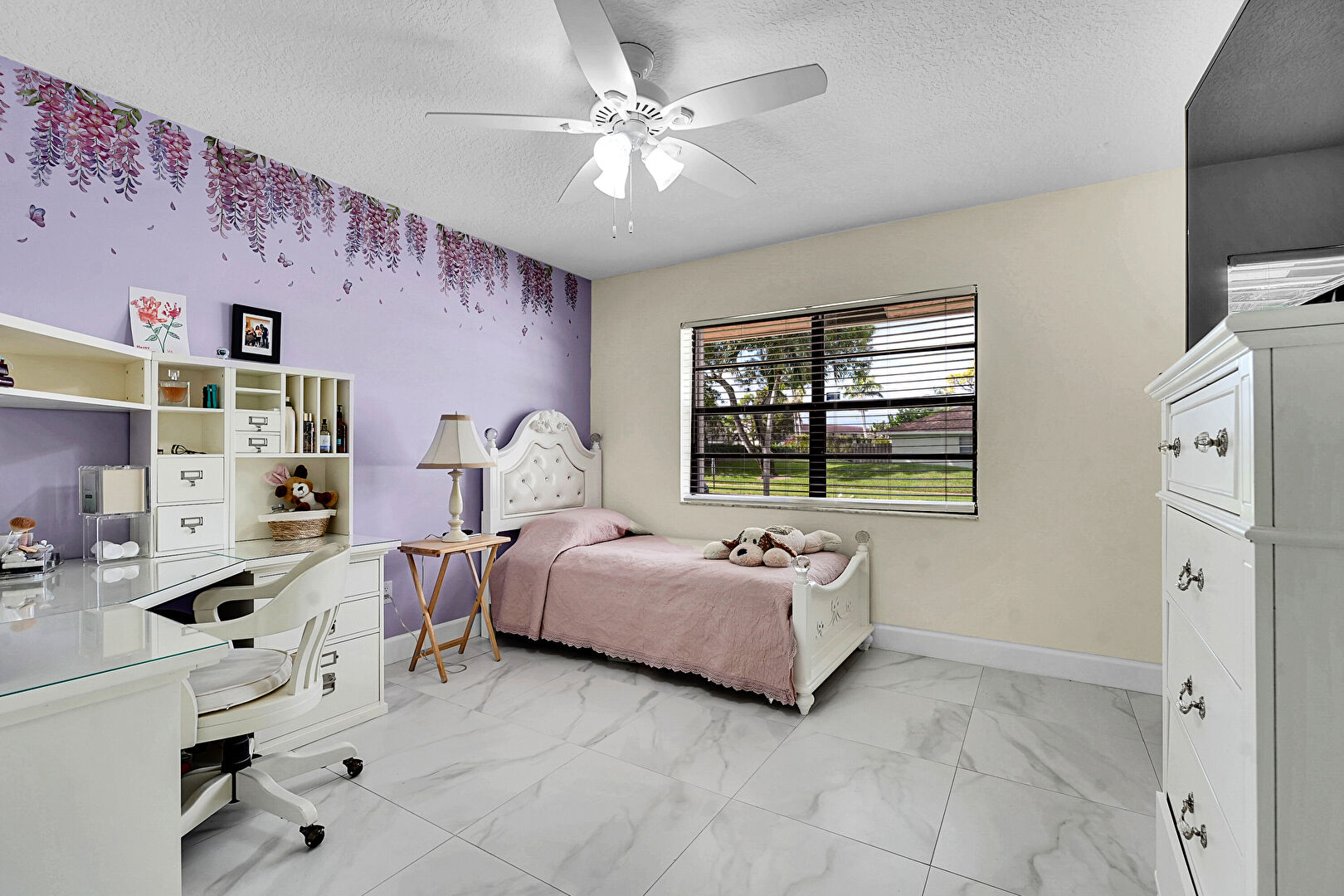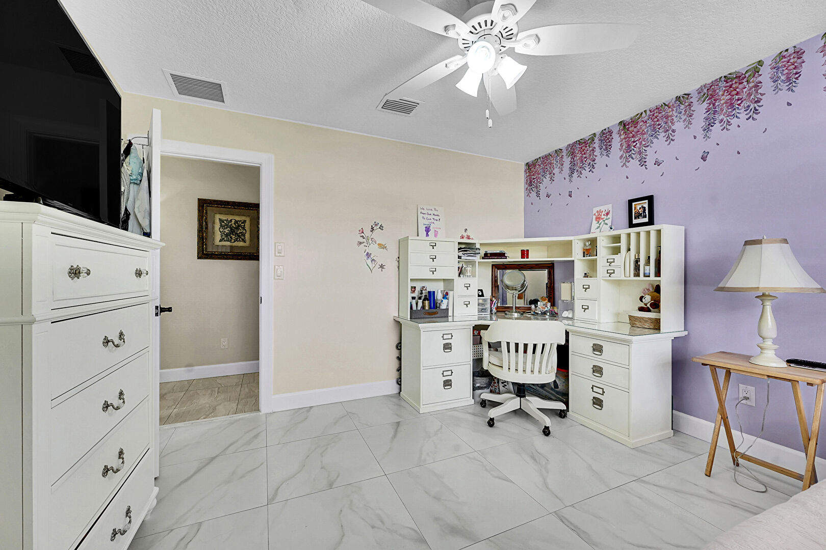 Baseboards Wall, Drywall, Marble Finish Floor, Natural Light, Office Area, Textured Ceiling, Ceiling Fan