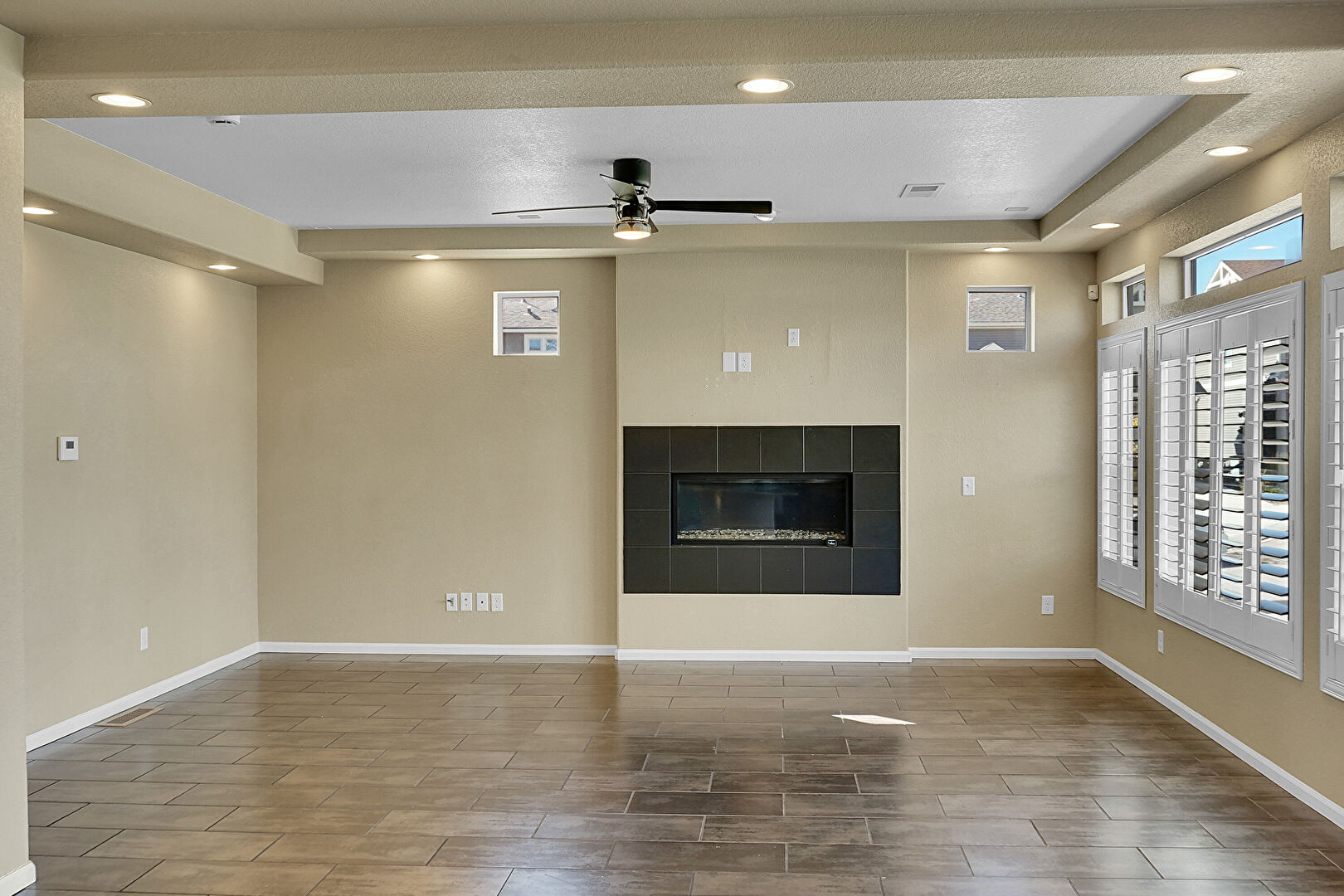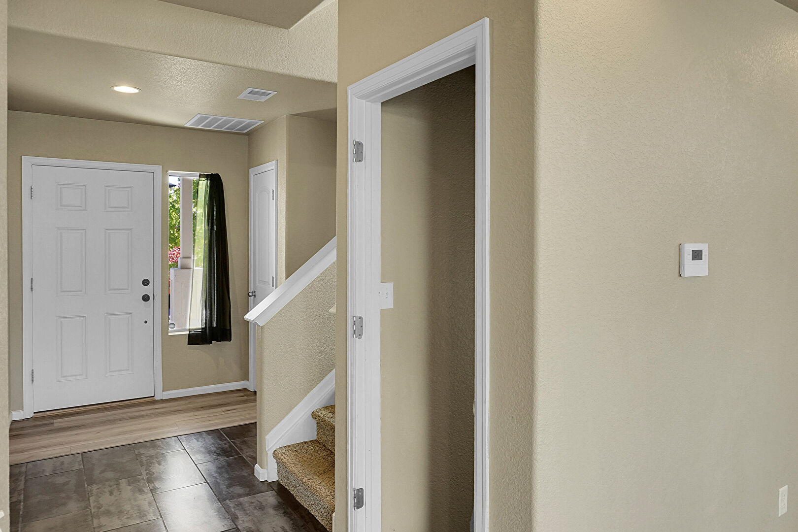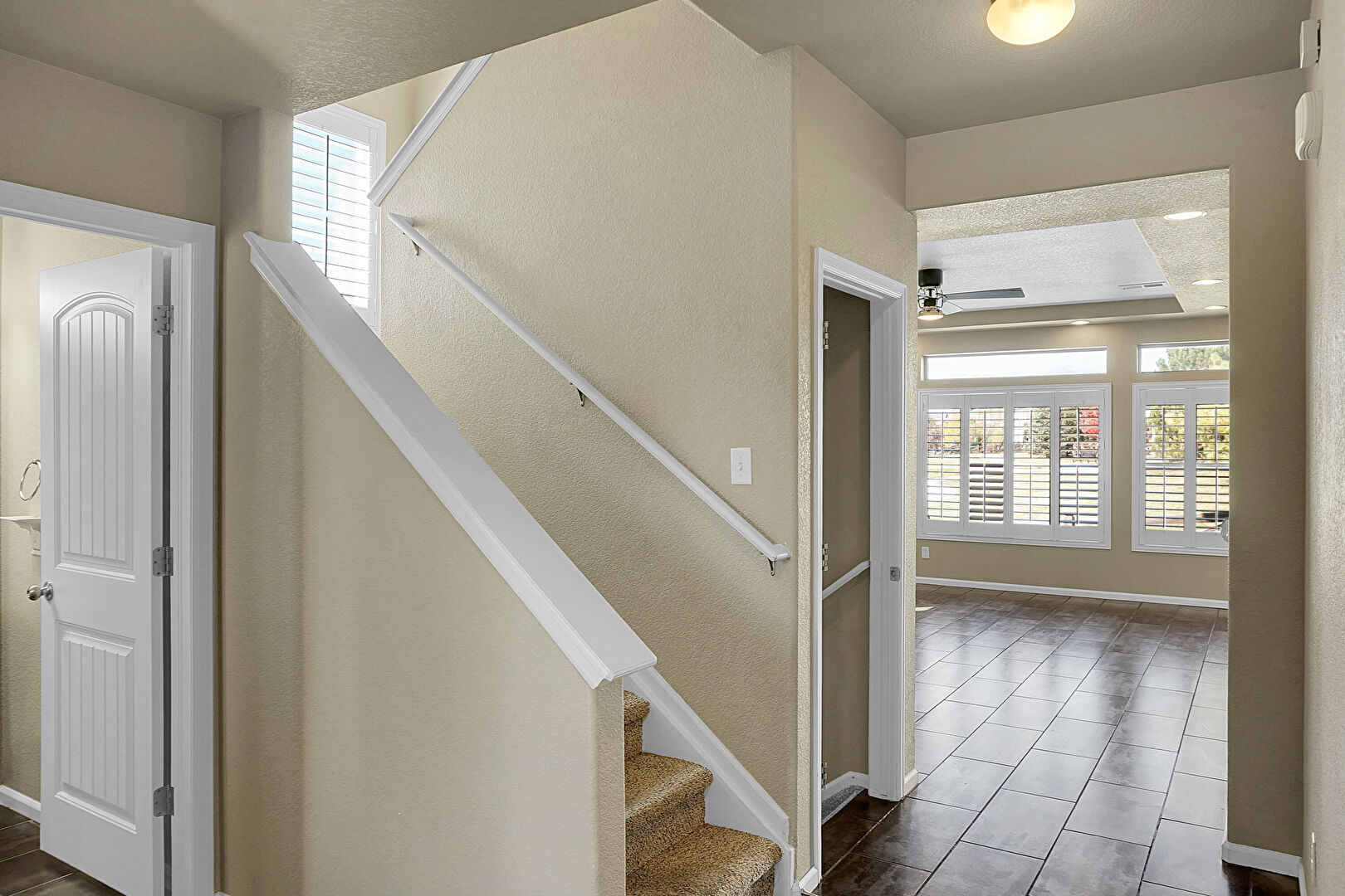 Baseboards Wall, Ceiling Fan, Drywall, Natural Light, Recessed Lighting, Stairs, Textured Ceiling, Vent, Tile Floor, Wood Finish Floor