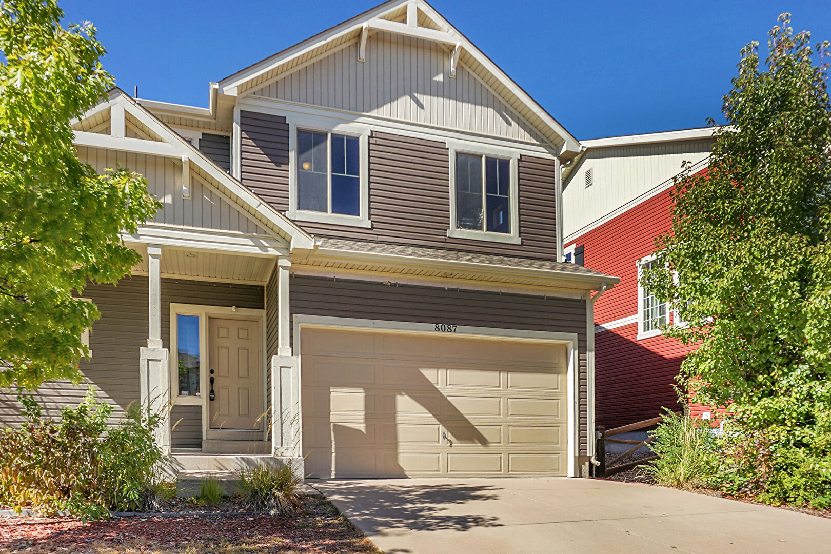 Board Batten Siding, Built In Garage, Downspout, Driveway, Gutters, Horizontal Siding, Lawn, Porch, Residential View, Shingle Roof, Stairs, Stoop, Vertical Siding, Board Batten Siding, Downspout, Horizontal Siding