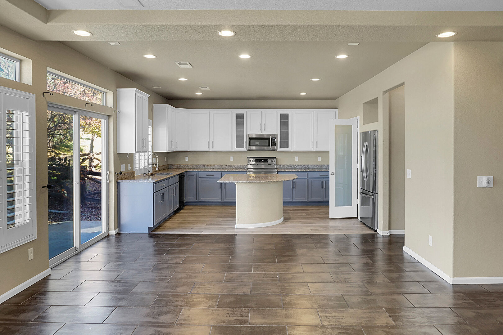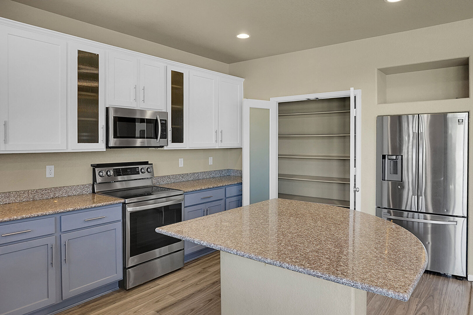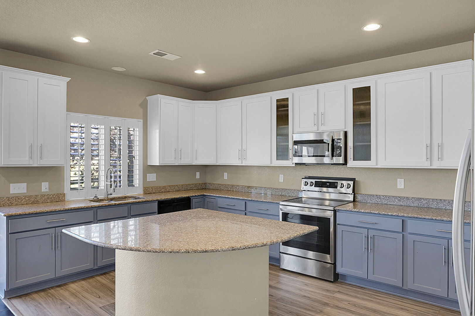 Blue Cabinets, Crown Molding Cabinets, Drywall, Glass Insert Cabinets, Gray Cabinets, Kitchen Island, Natural Light, Recessed Lighting, Shaker Cabinets, Stone Countertops, Textured Ceiling, U Shaped Kitchen, Vent, Wood Finish Floor, Glass Insert Cabinets, Gray Cabinets, Wood Finish Floor