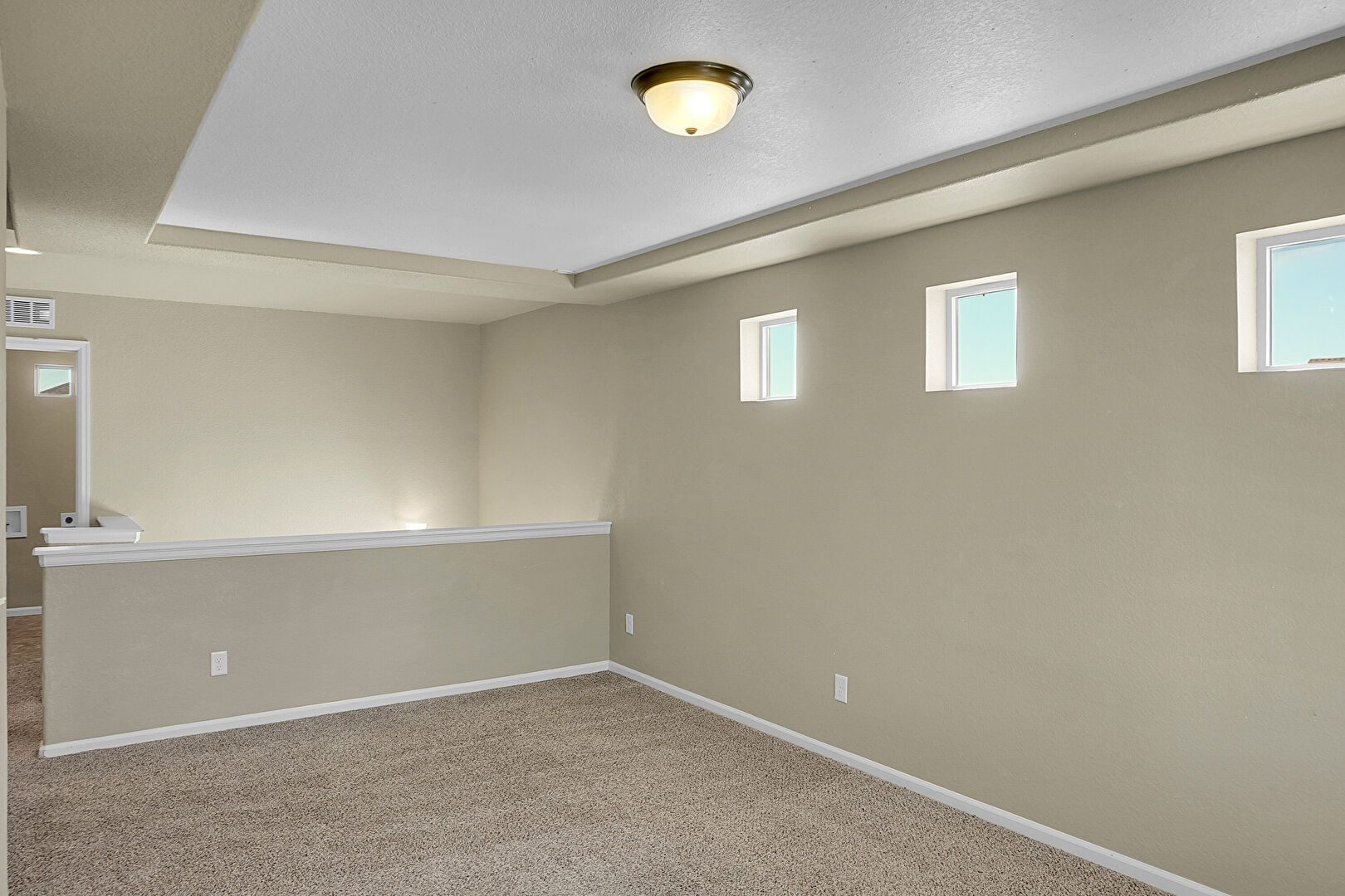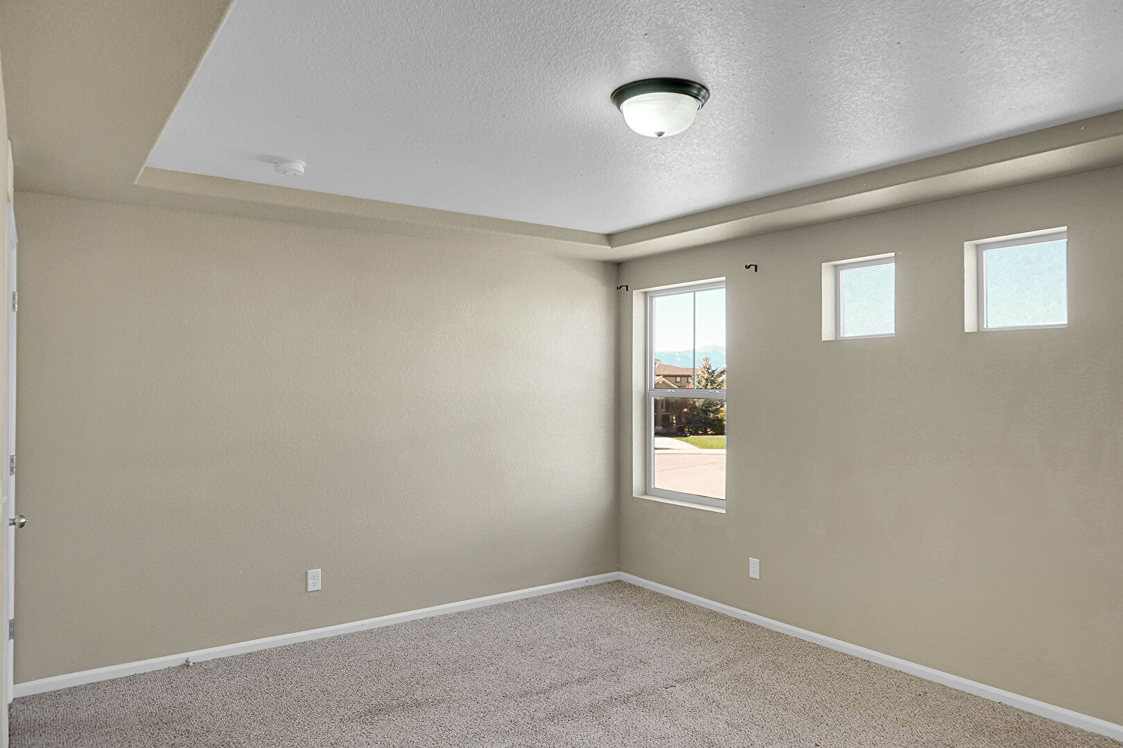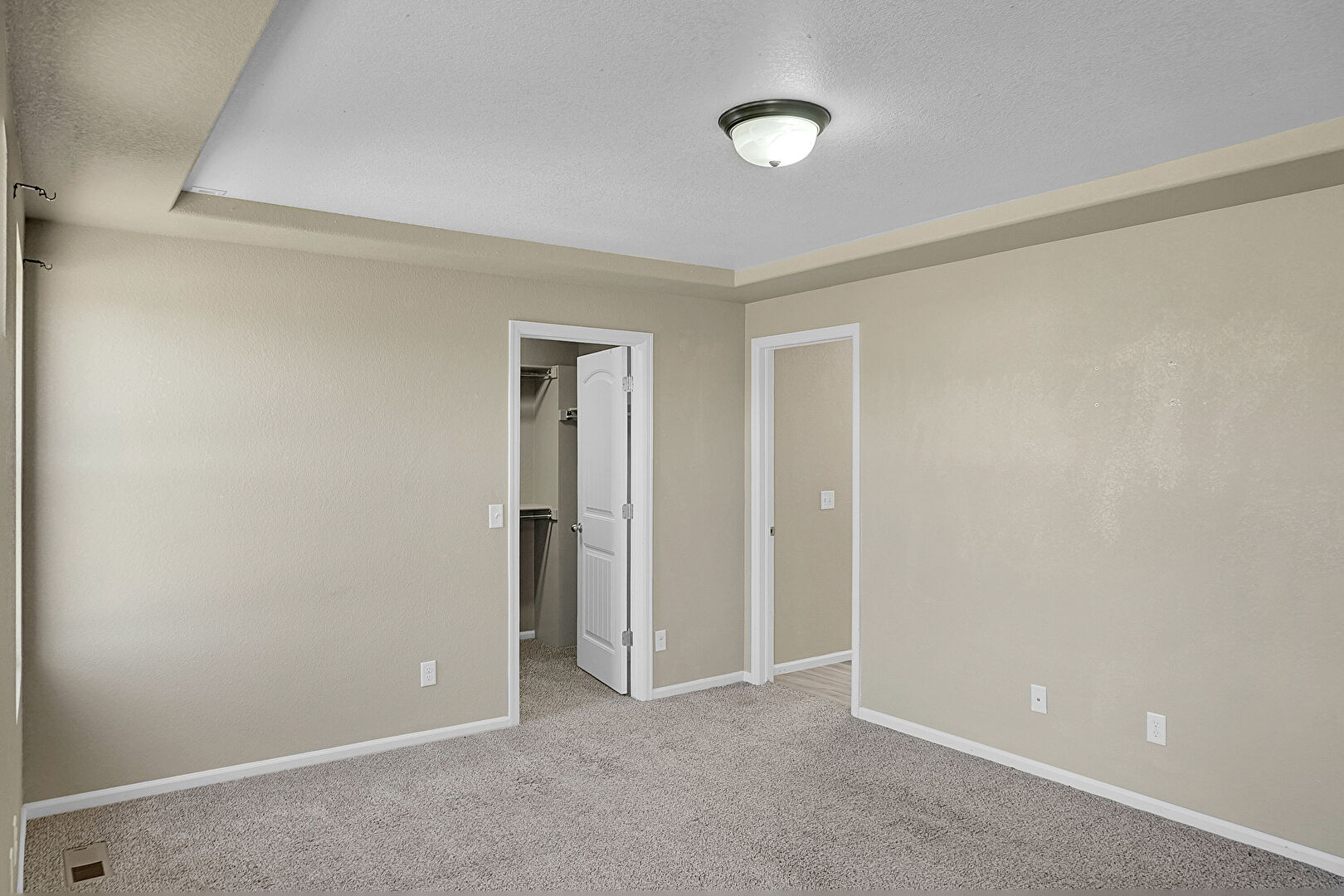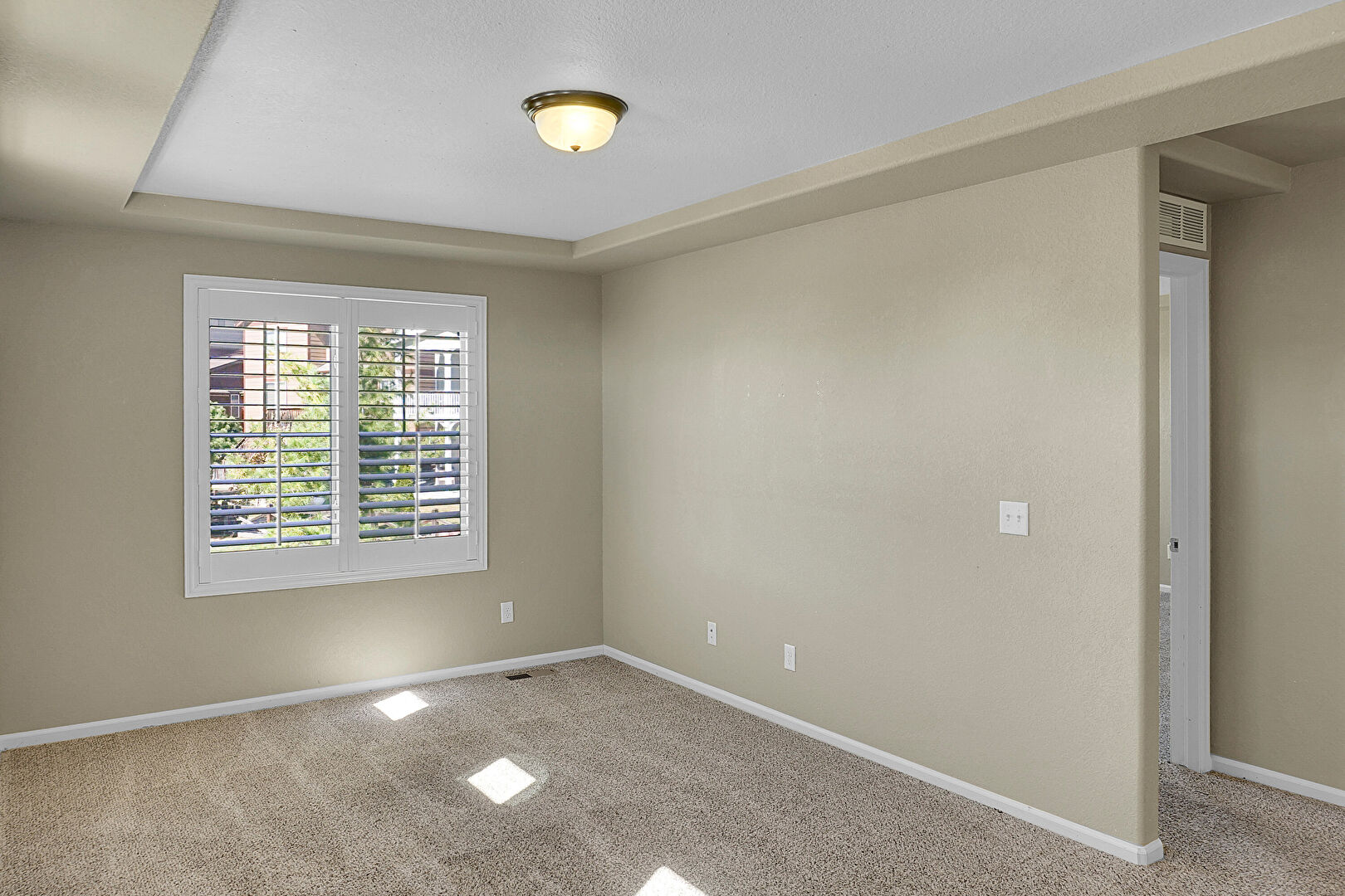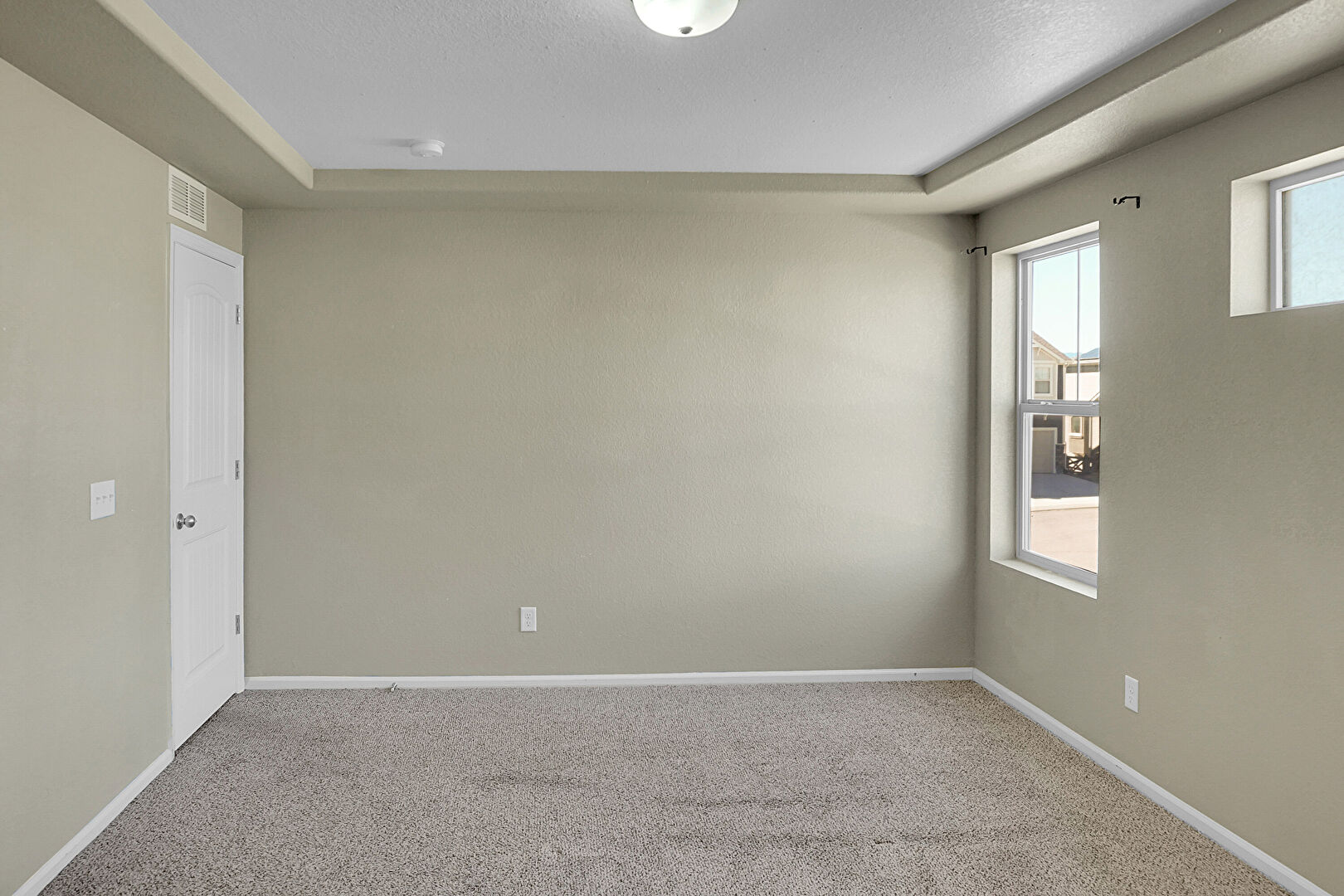 Baseboards Wall, Carpet, Drywall, Natural Light, Textured Ceiling, Tray Ceiling, Vent, Carpet, Vent