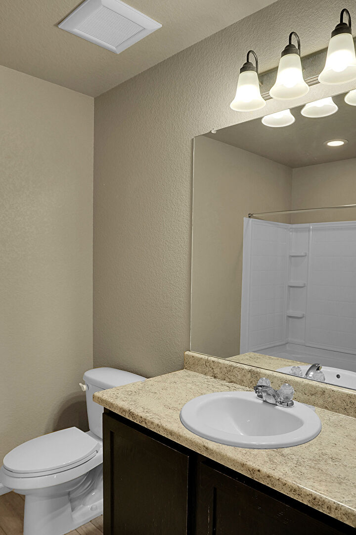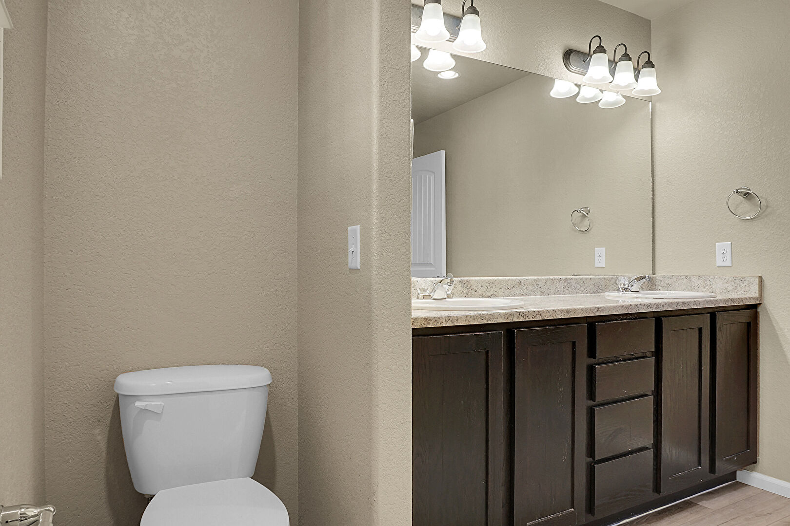 Baseboards Wall, Double Vanity, Full Bathroom, Natural Light, Textured Ceiling, Textured Wall, Wood Finish Floor, Baseboards Wall, Full Bathroom, Textured Wall