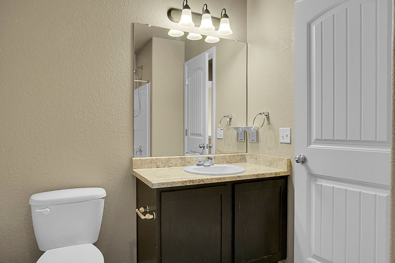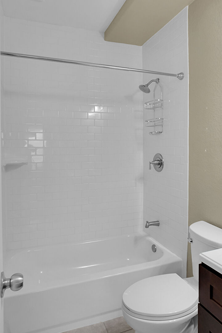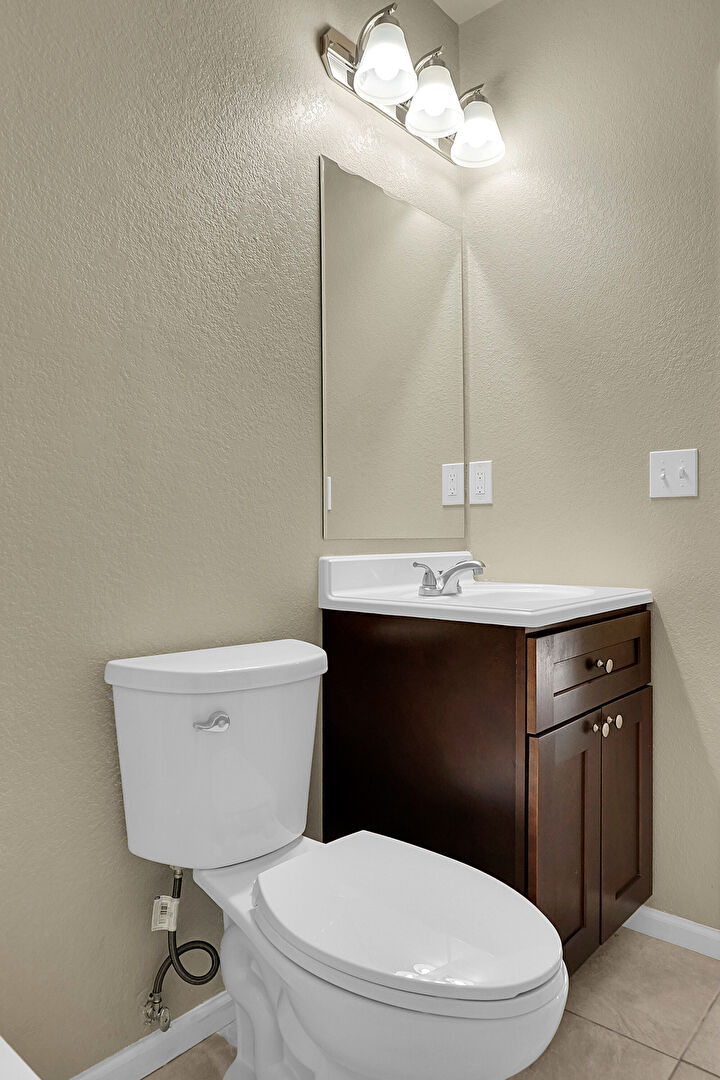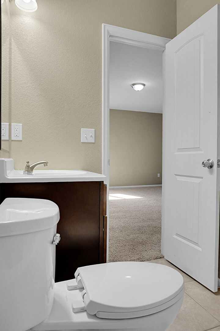 Baseboards Wall, Carpet, Combined Bath Shower, Full Bathroom, Half Bathroom, Textured Wall, Tile Floor, Vanity, Baseboards Wall, Textured Wall, Vanity