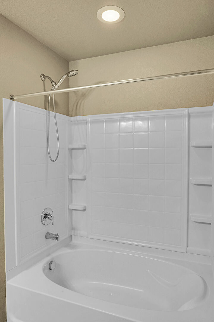 Full Bathroom, Recessed Lighting, Textured Ceiling, Textured Wall, Vent, Wood Finish Floor, Combined Bath Shower, Vanity