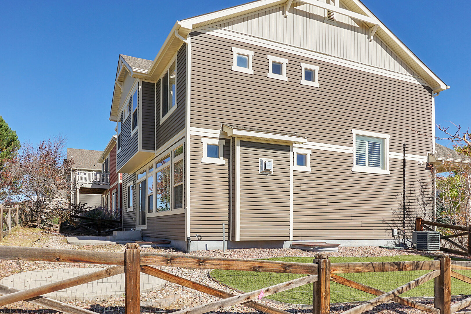 Balcony, Board Batten Siding, Central Ac, Concrete Foundation, Downspout, Entry Steps, Fence, Gutters, Horizontal Siding, Lawn, Shingle Roof, Vertical Siding, Board Batten Siding, Fence
