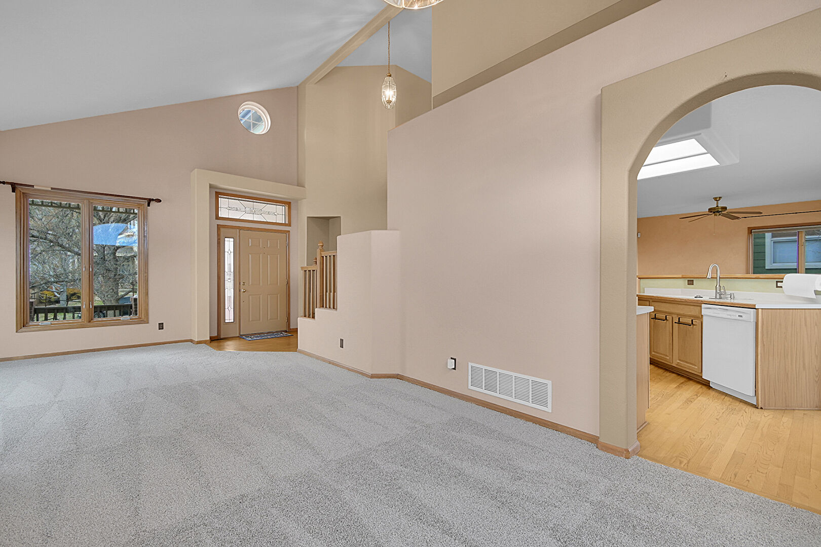 Arched Walkways, Baseboards Wall, Carpet, Ceiling Fan, Drywall, Natural Light, Vaulted Ceiling, Vent, Wood Finish Floor, High Ceiling