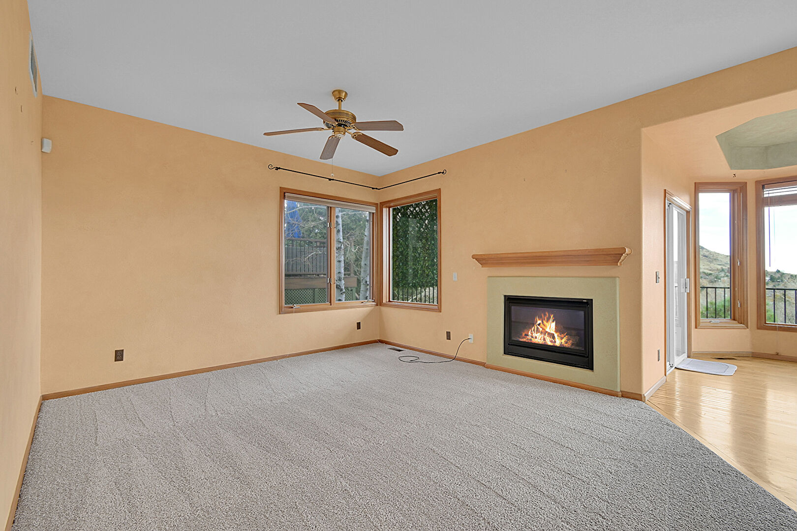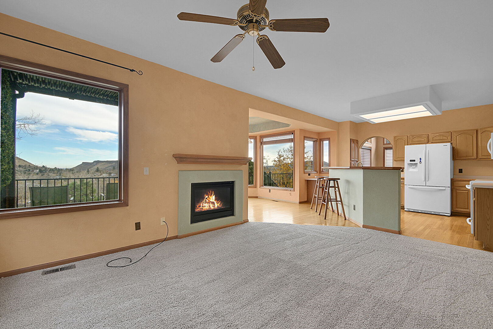Baseboards Wall, Carpet, Ceiling Fan, Drywall, Fireplace, Natural Light, Vent, Drywall, Mountain View