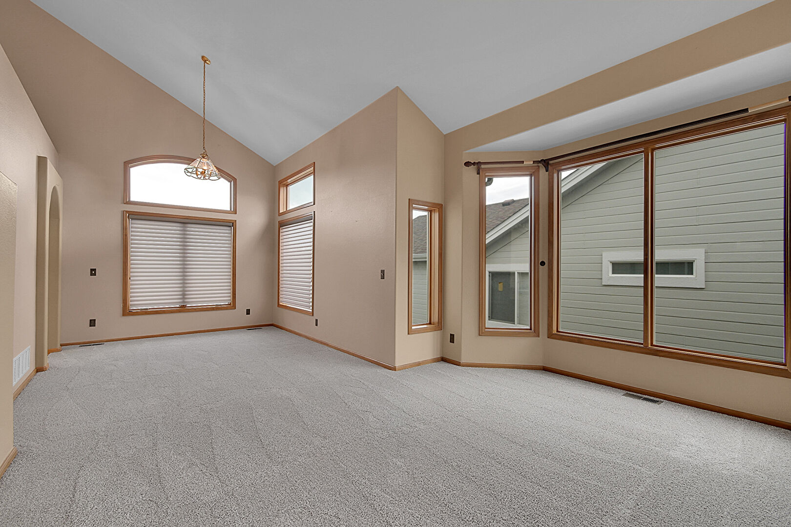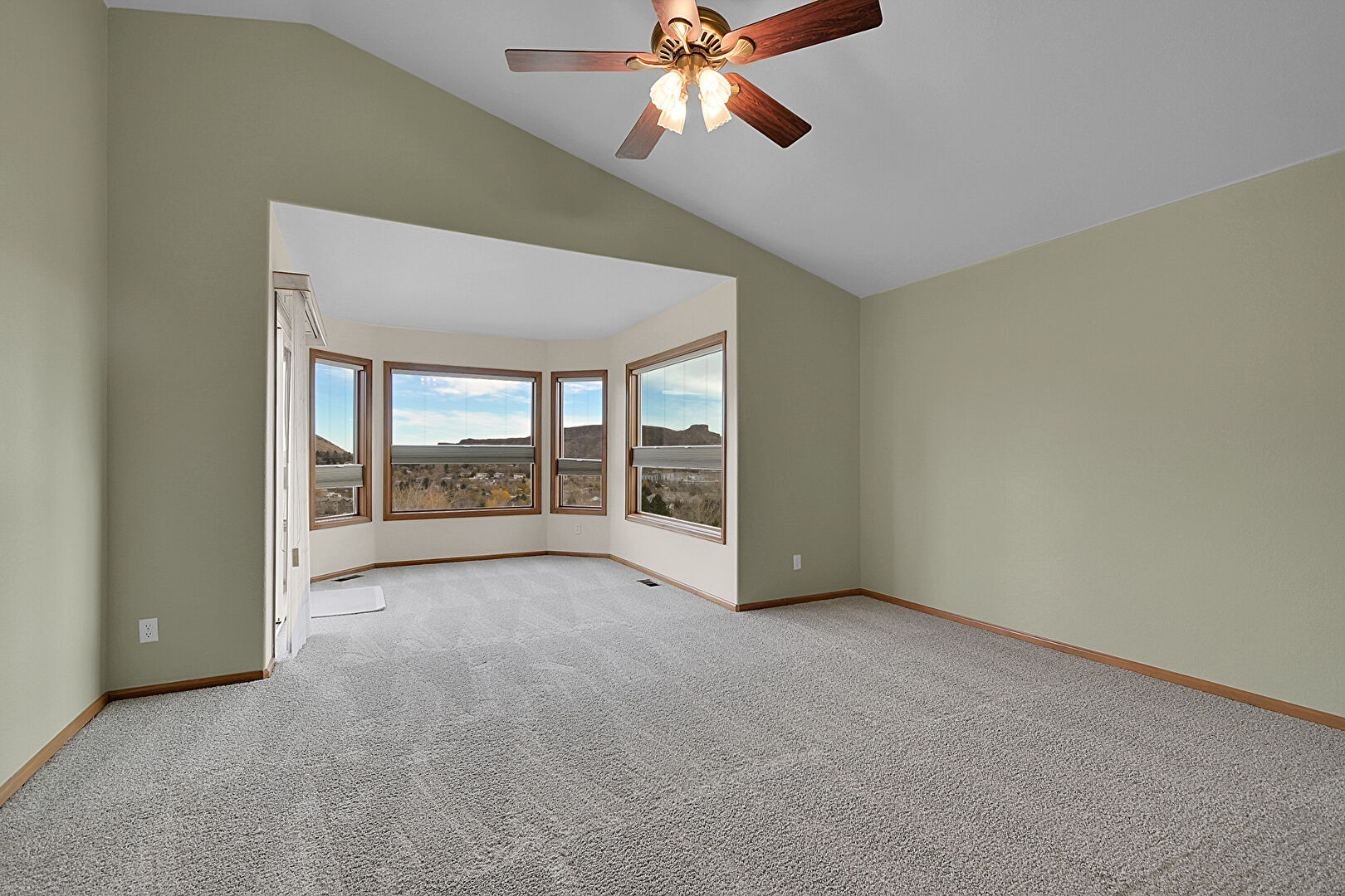 Baseboards Wall, Carpet, Ceiling Fan, Drywall, High Ceiling, Natural Light, Vaulted Ceiling, Vent, Ceiling Fan, Drywall, Natural Light, Vent