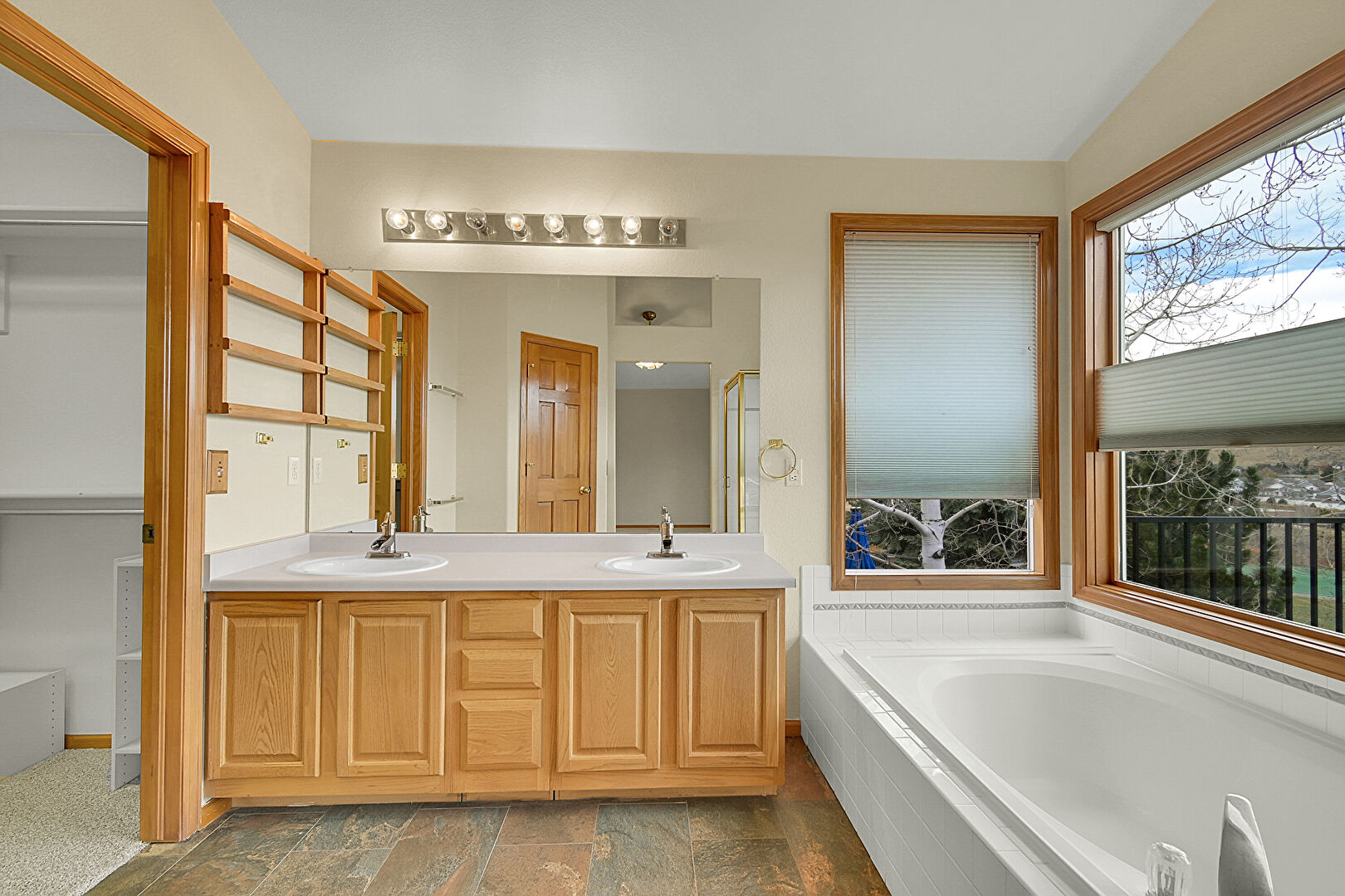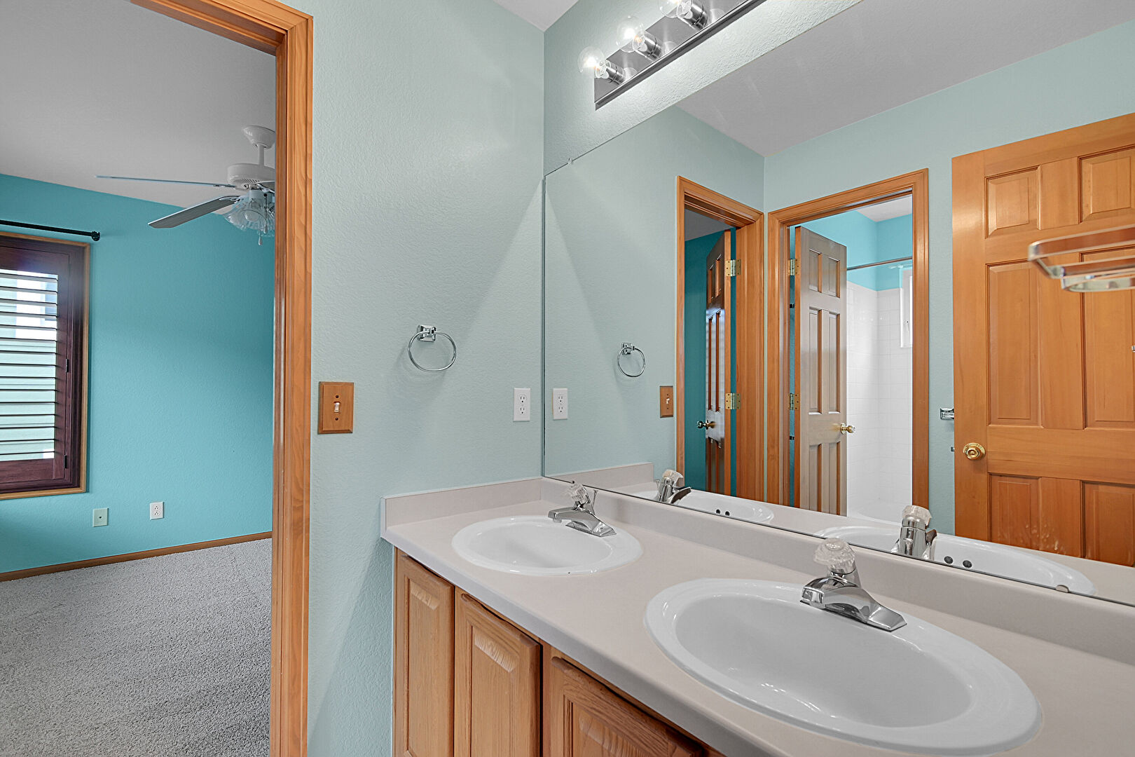 Baseboards Wall, Ceiling Fan, Closet, Double Vanity, Drywall, Full Bathroom, Natural Light, Stone Finish Floor, Vaulted Ceiling, Carpet, Drywall