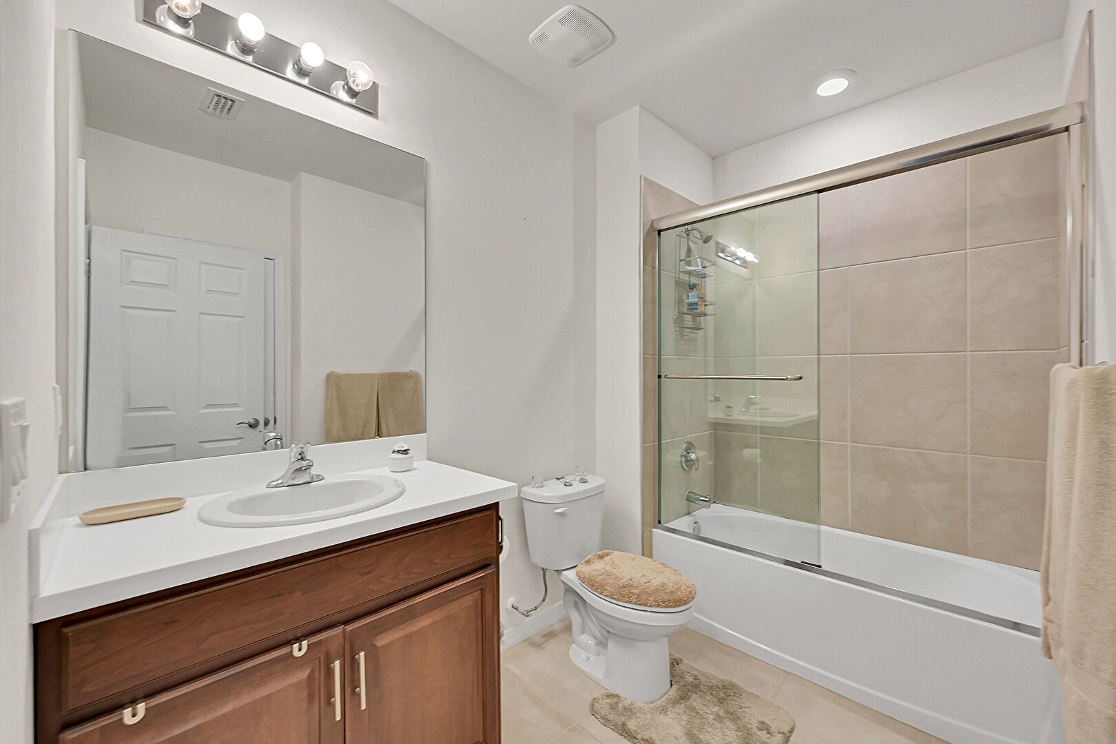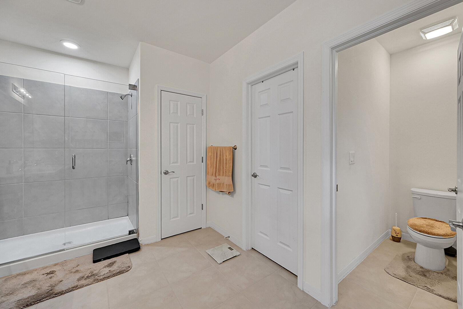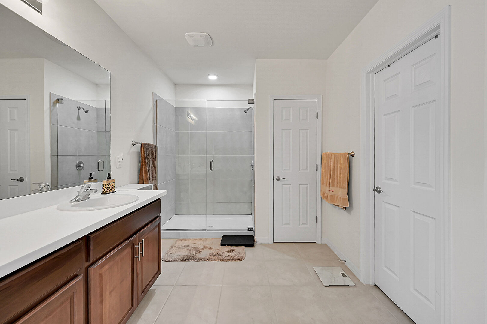 Baseboards Wall,  Double Vanity,  Drywall,  Full Bathroom,  Recessed Lighting,  Tile Floor,  Vanity,  Vent,  Water Closet, Full Bathroom, Recessed Lighting