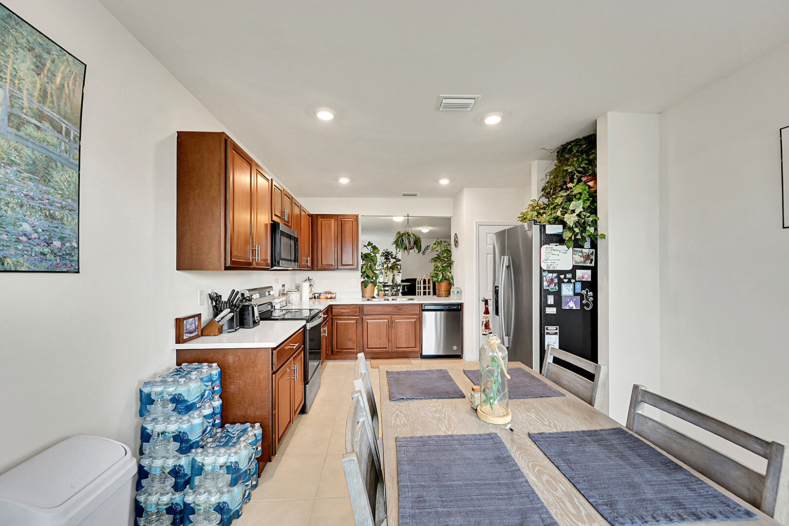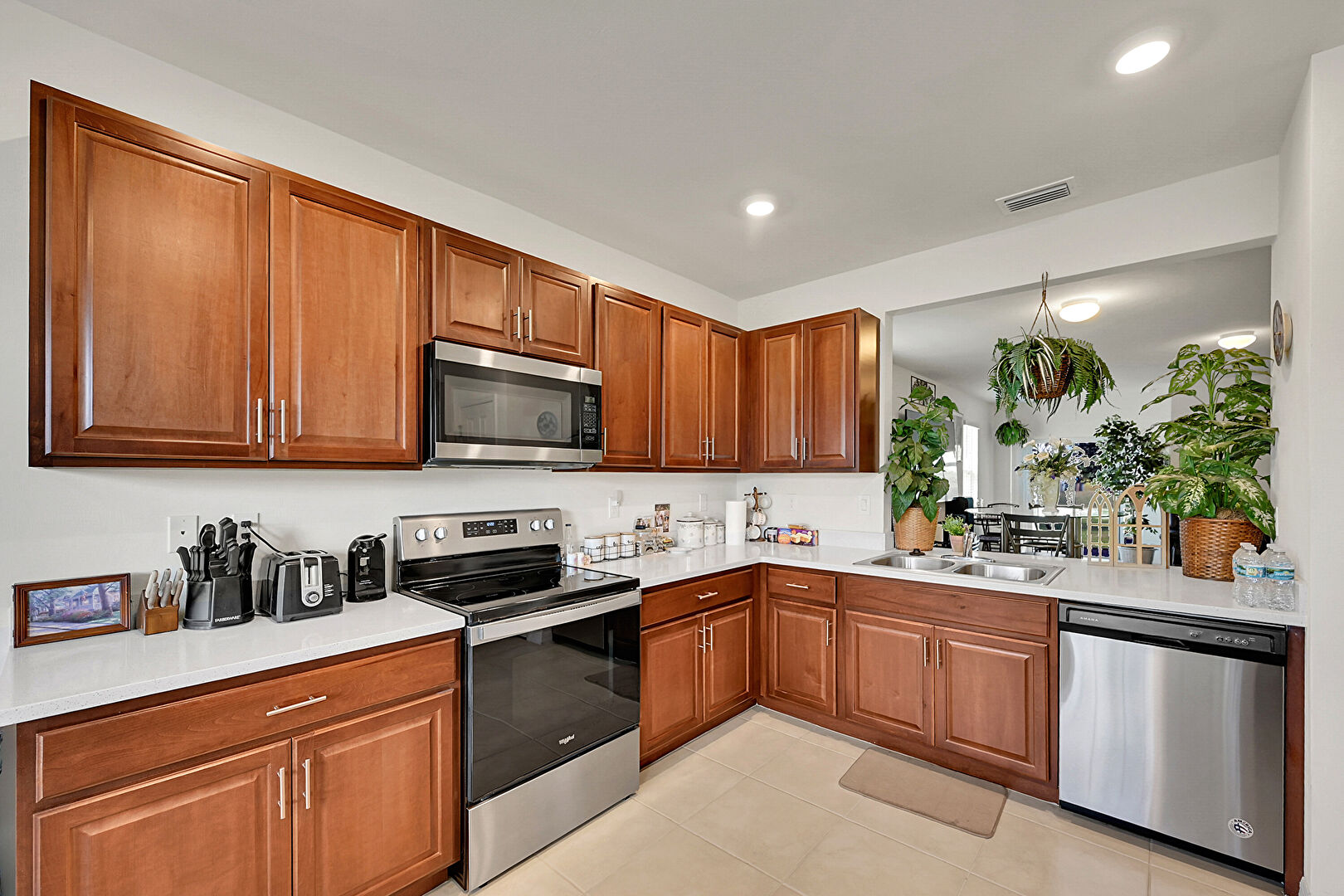 Baseboards Wall,  Drywall,  Medium Brown Cabinets,  Natural Light,  Pass Through Window,  Raised Cabinets,  Recessed Lighting,  Stone Countertops,  Tile Floor,  U Shaped Kitchen,  Vent, Drywall, Medium Brown Cabinets, Recessed Lighting, Stone Countertops