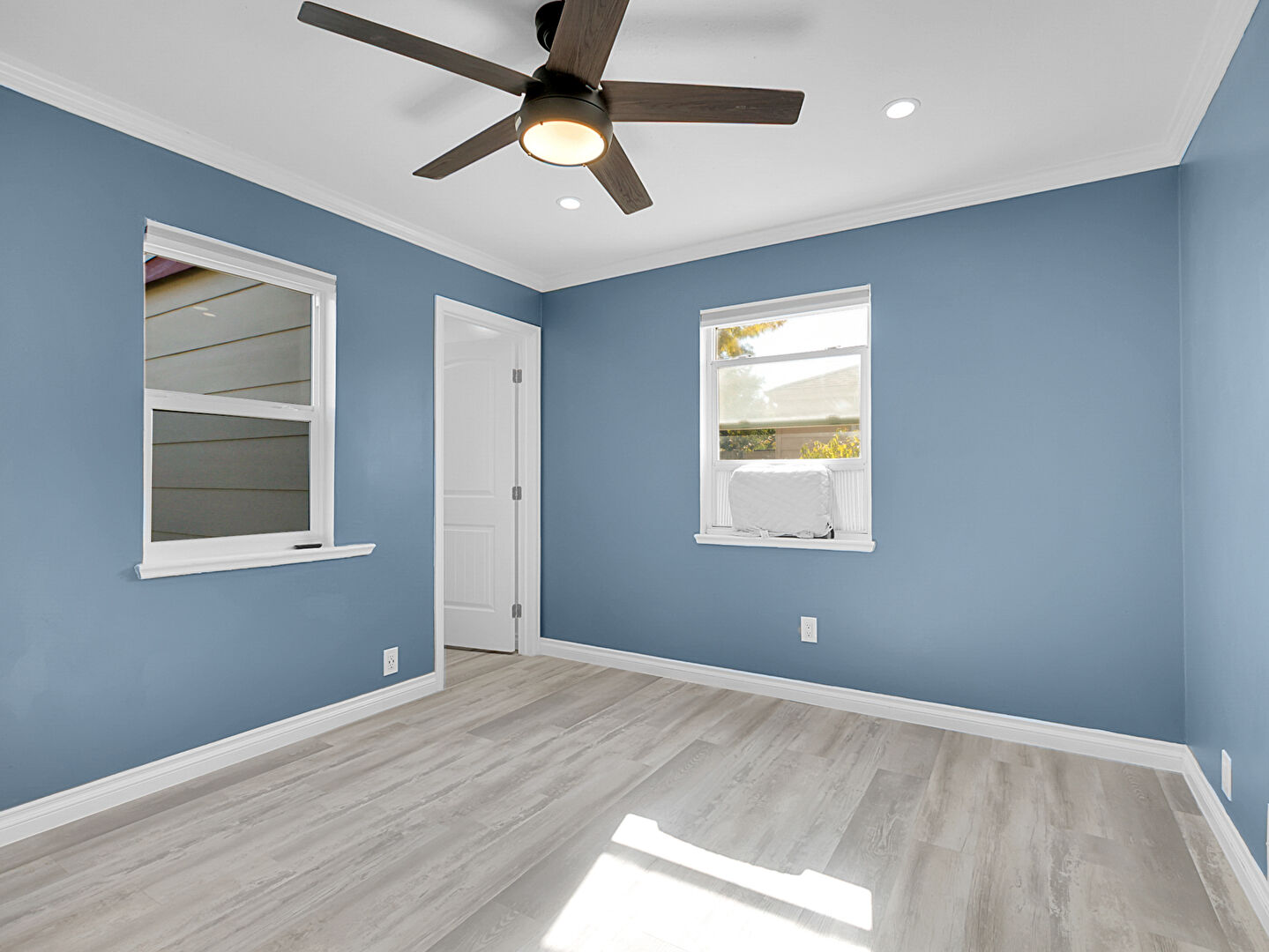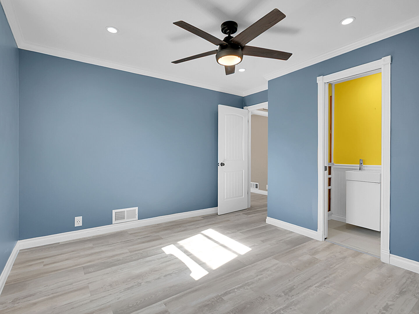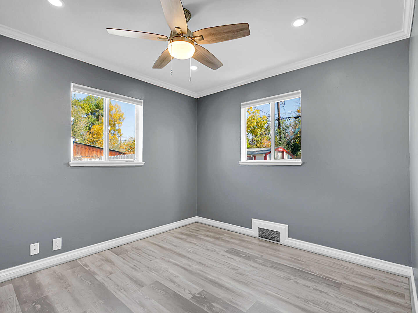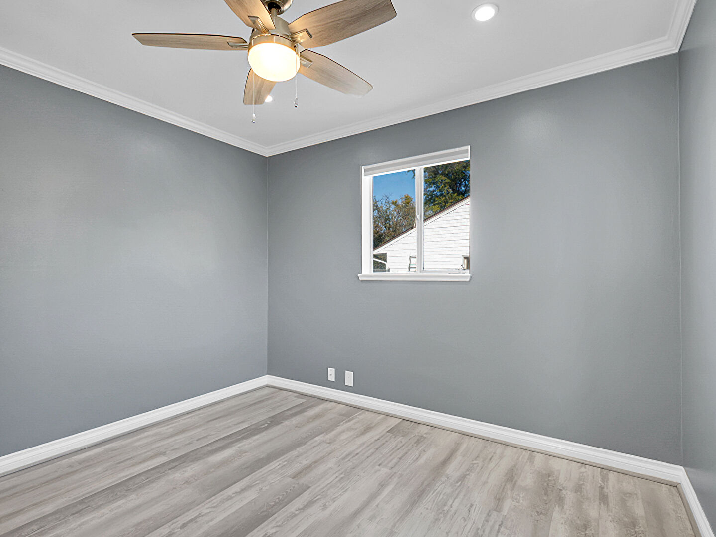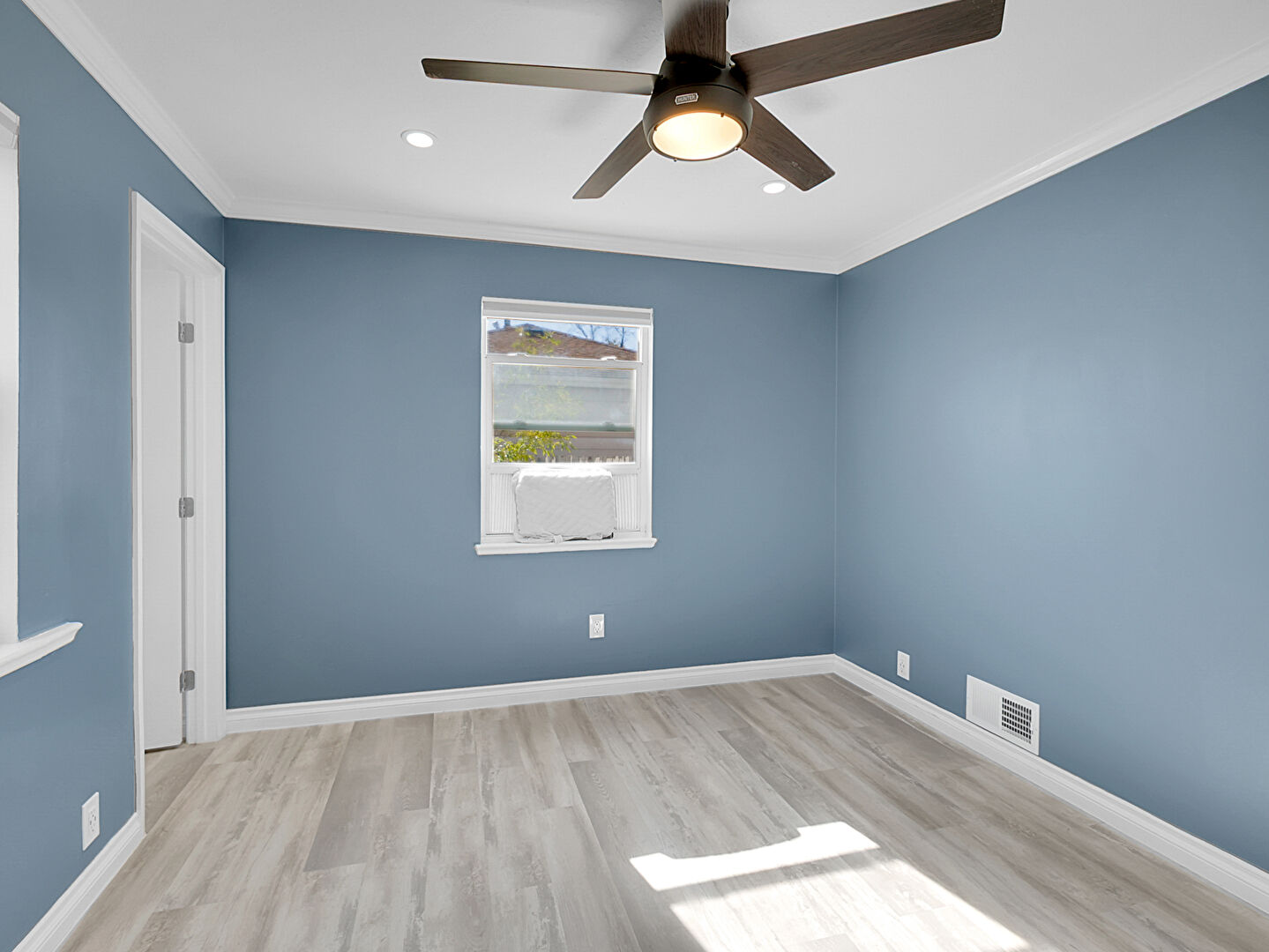 Baseboards Wall, Ceiling Fan, Crown Molding, Drywall, Natural Light, Recessed Lighting, Vent, Wood Finish Floor, Ceiling Fan, Drywall