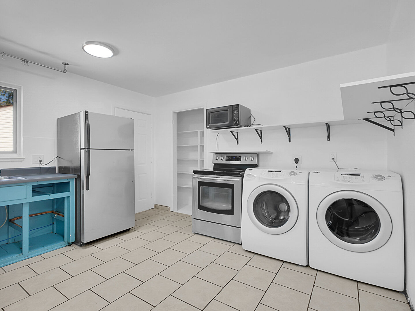 Blue Cabinets, Drywall, Electric Dryer Hookup, Laundry, Natural Light, Open Shelves, Tile Floor, Blue Cabinets, Natural Light