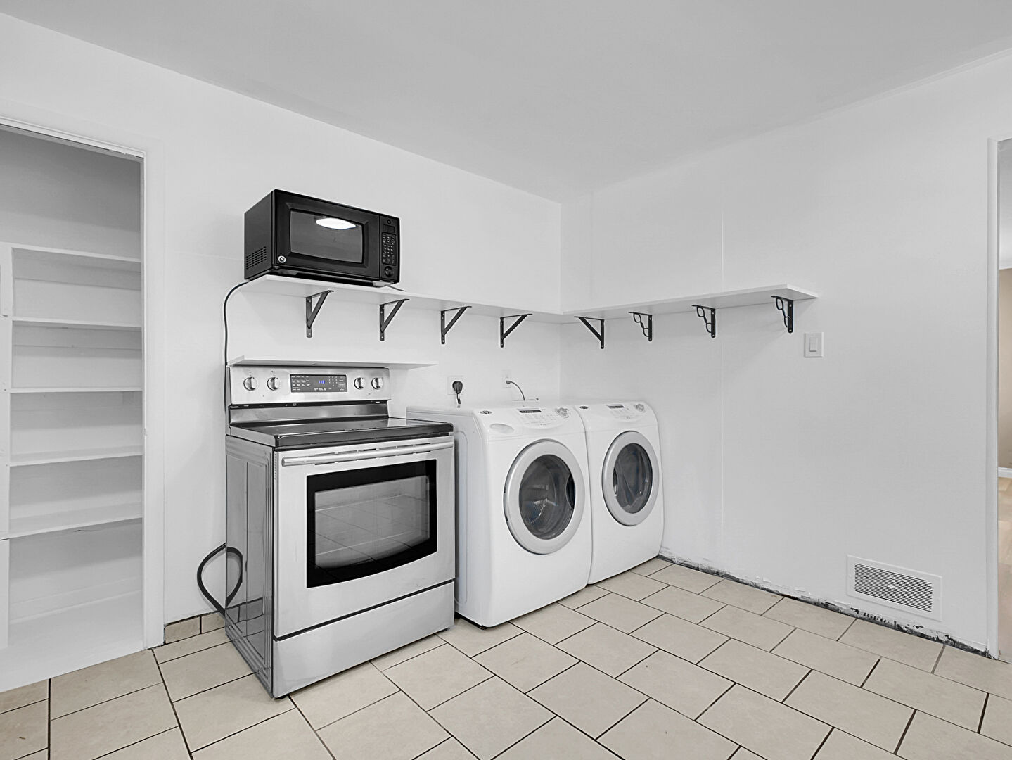 Baseboards Wall, Drywall, Electric Dryer Hookup, Laundry, Natural Light, Tile Floor, Laundry, Vent