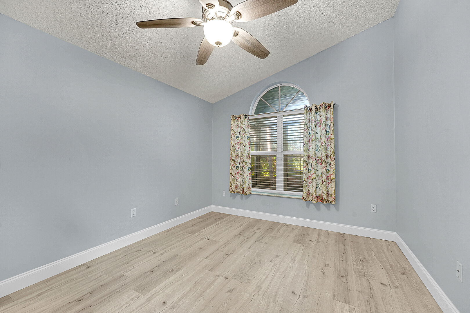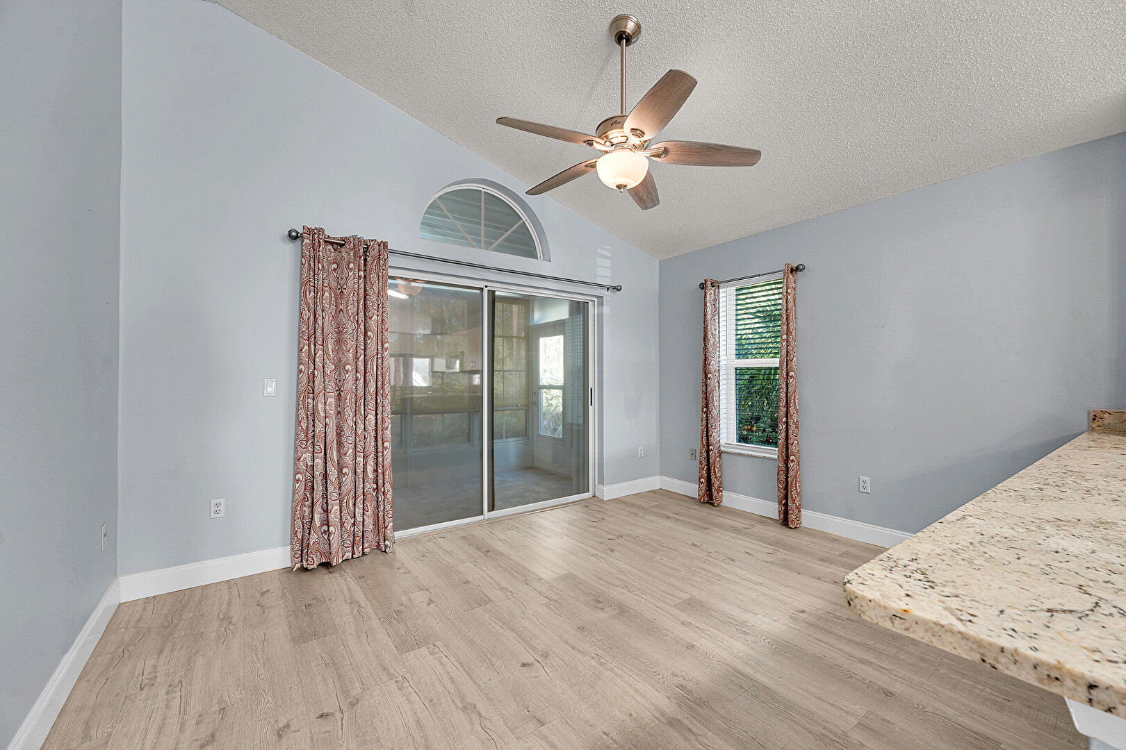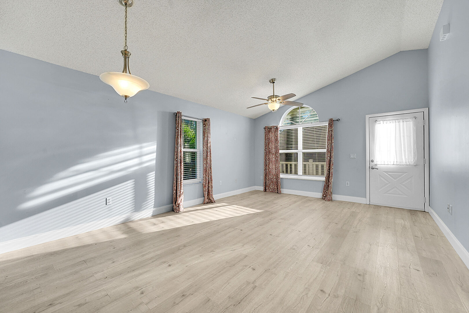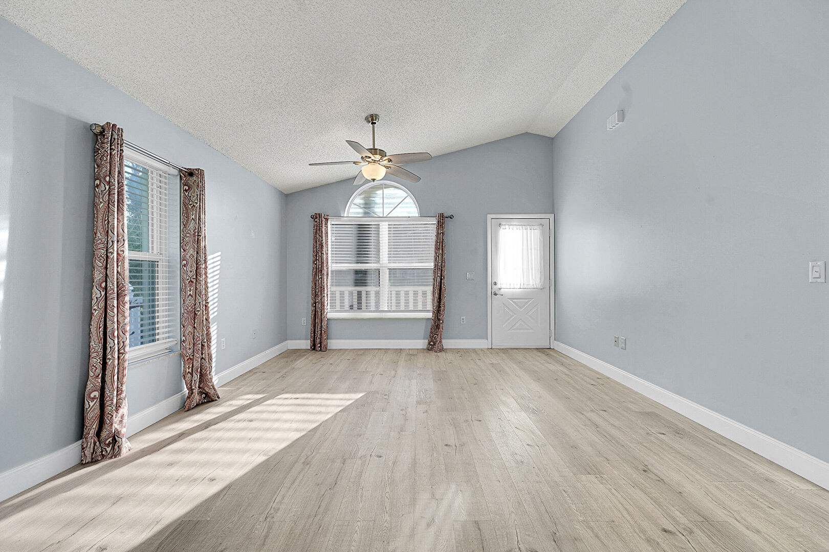 Baseboards Wall, Ceiling Fan, Drywall, Natural Light, Textured Ceiling, Vaulted Ceiling, Wood Finish Floor, High Ceiling, Textured Ceiling