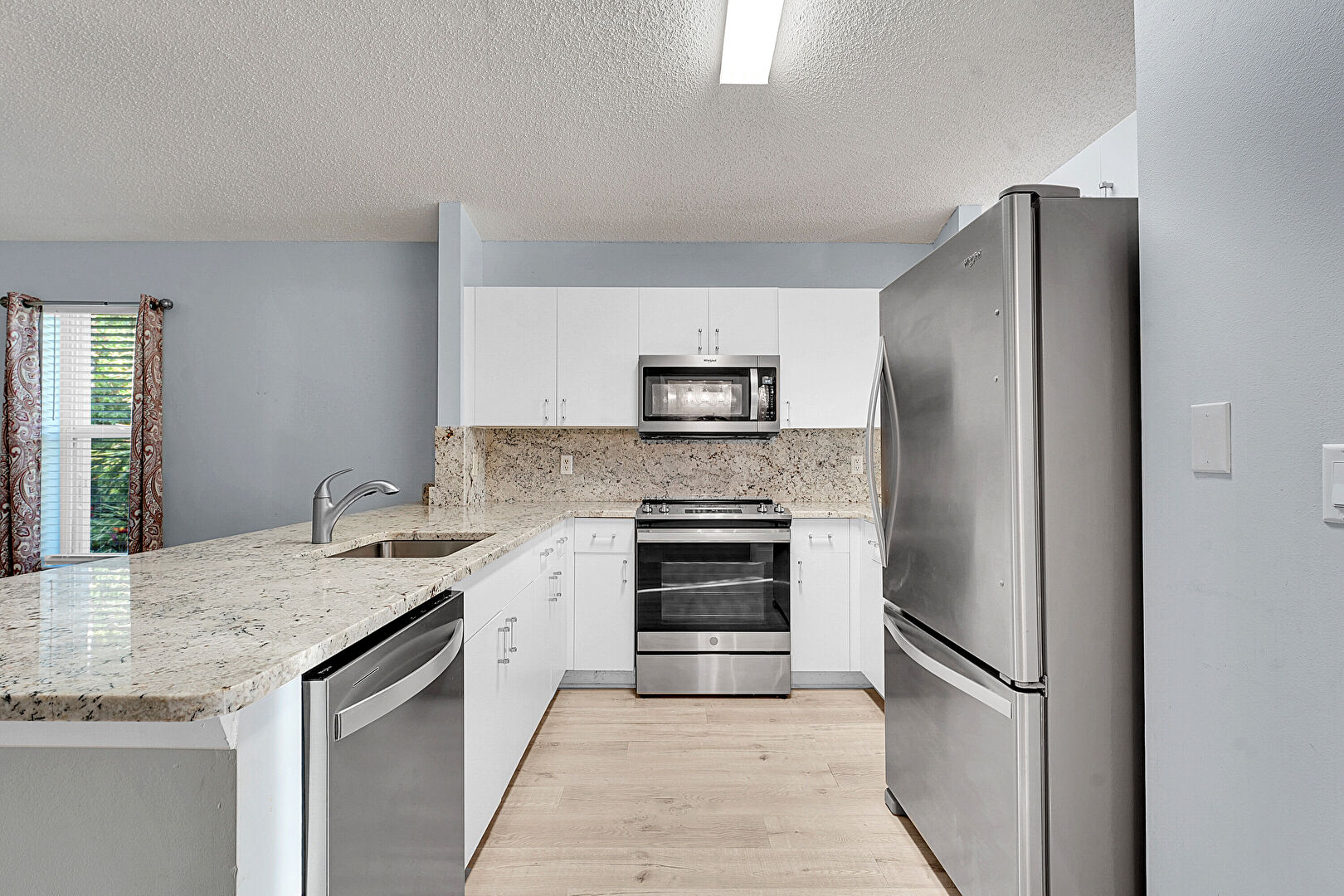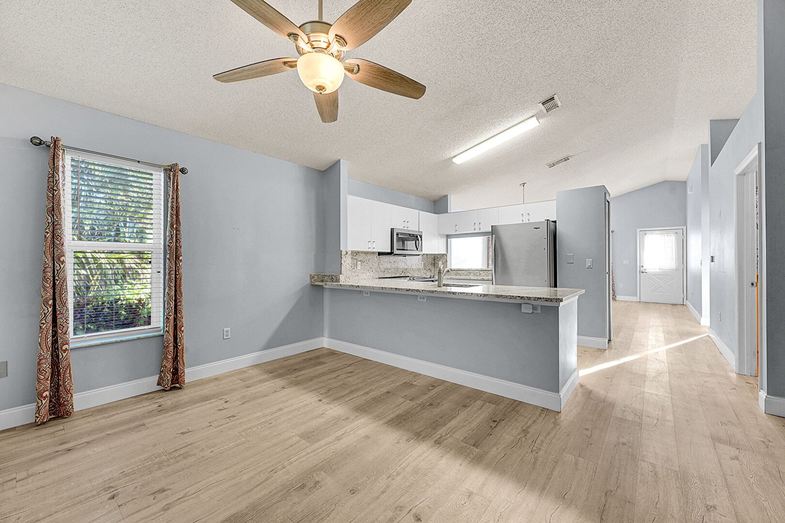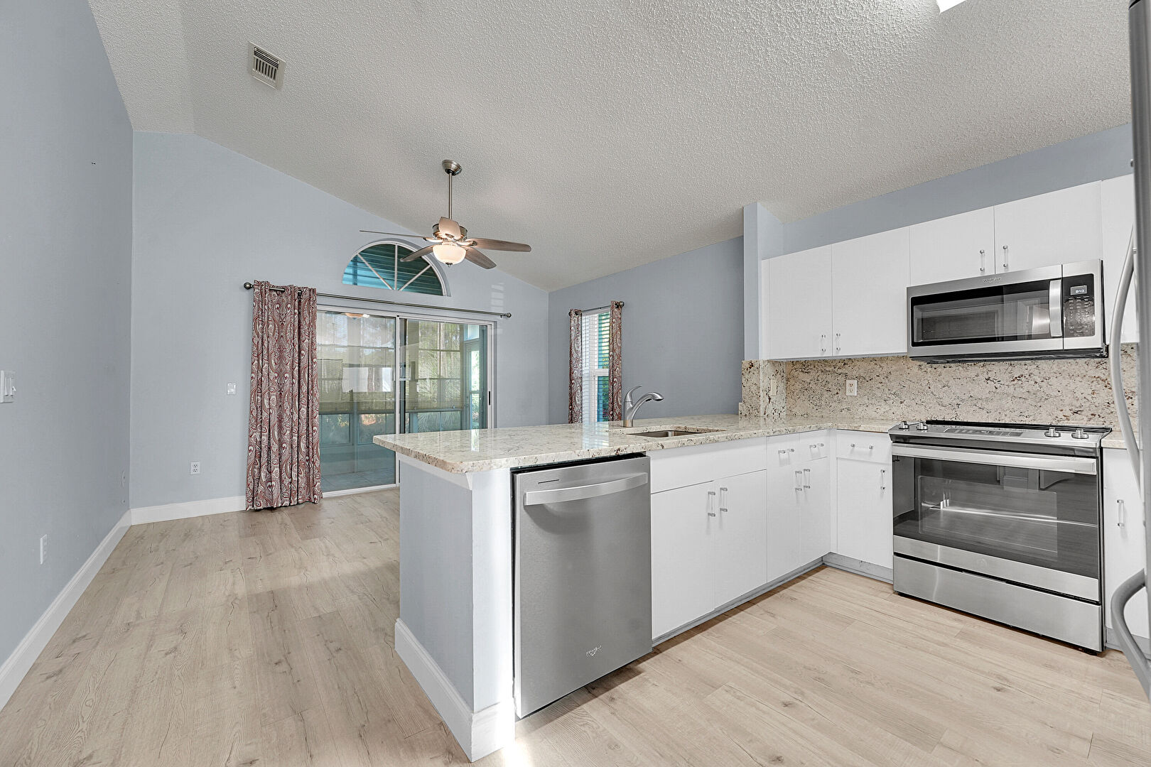 Baseboards Wall, Ceiling Fan, Drywall, High Ceiling, Kitchen Bar, Kitchen Peninsula, Natural Light, Stone Countertops, Textured Ceiling, U Shaped Kitchen, Vaulted Ceiling, Wood Finish Floor, Vaulted Ceiling, Vent