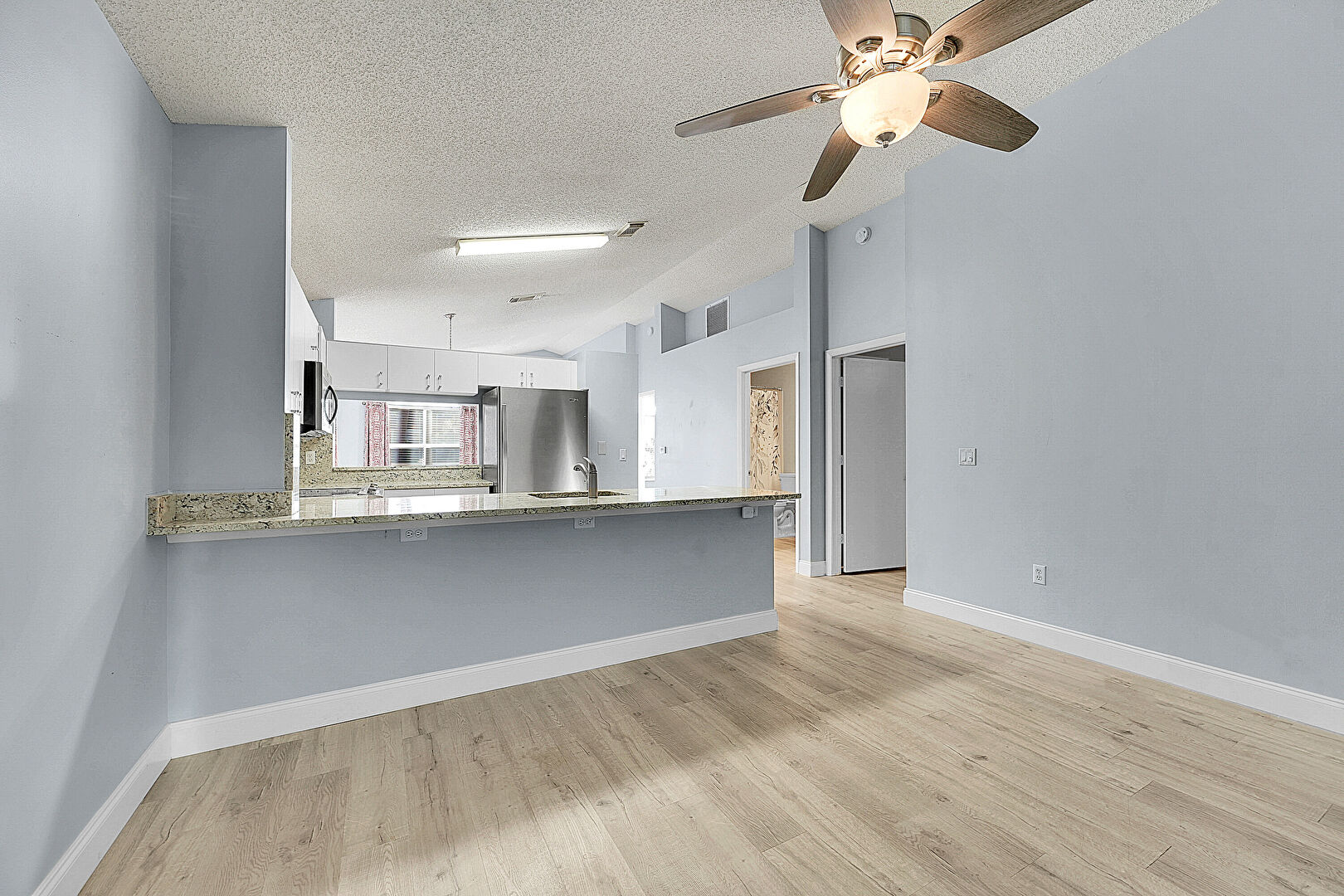 Baseboards Wall, Ceiling Fan, Drywall, High Ceiling, Kitchen Bar, Kitchen Peninsula, Natural Light, Stone Countertops, Textured Ceiling, U Shaped Kitchen, Vaulted Ceiling, Vent, Wood Finish Floor, Drywall, Kitchen Bar, Stone Countertops, U Shaped Kitchen