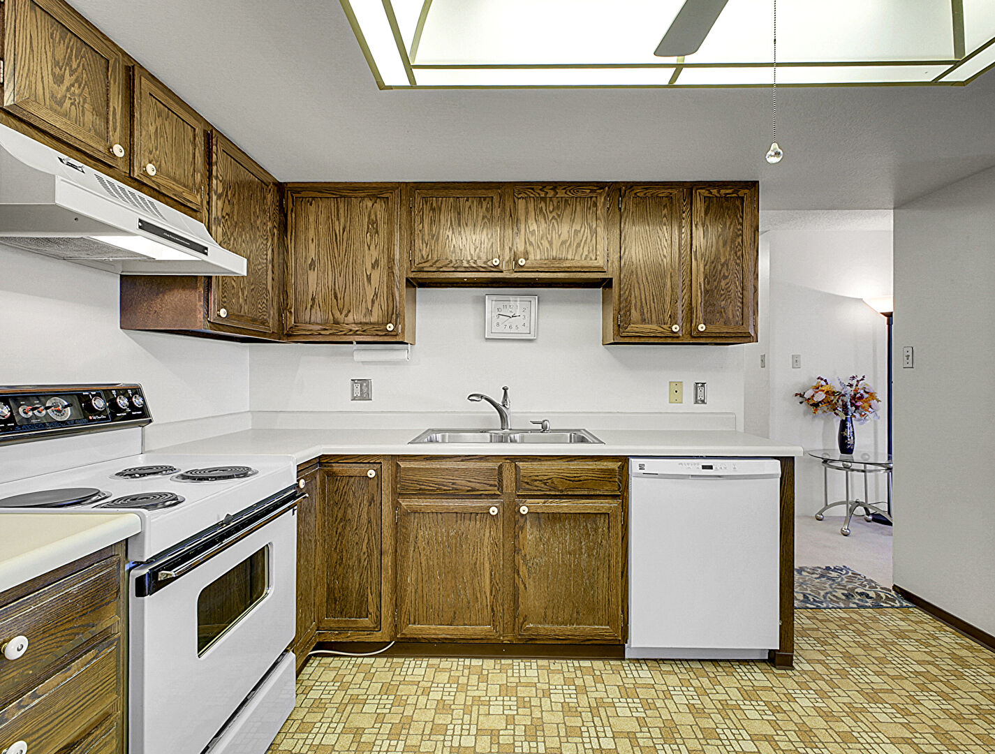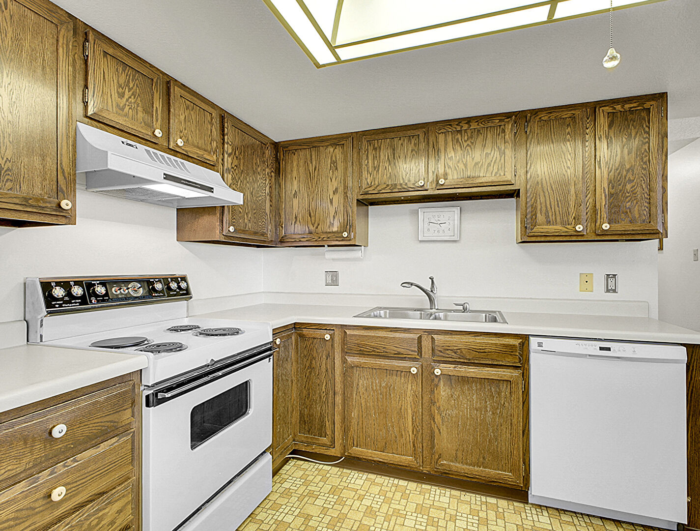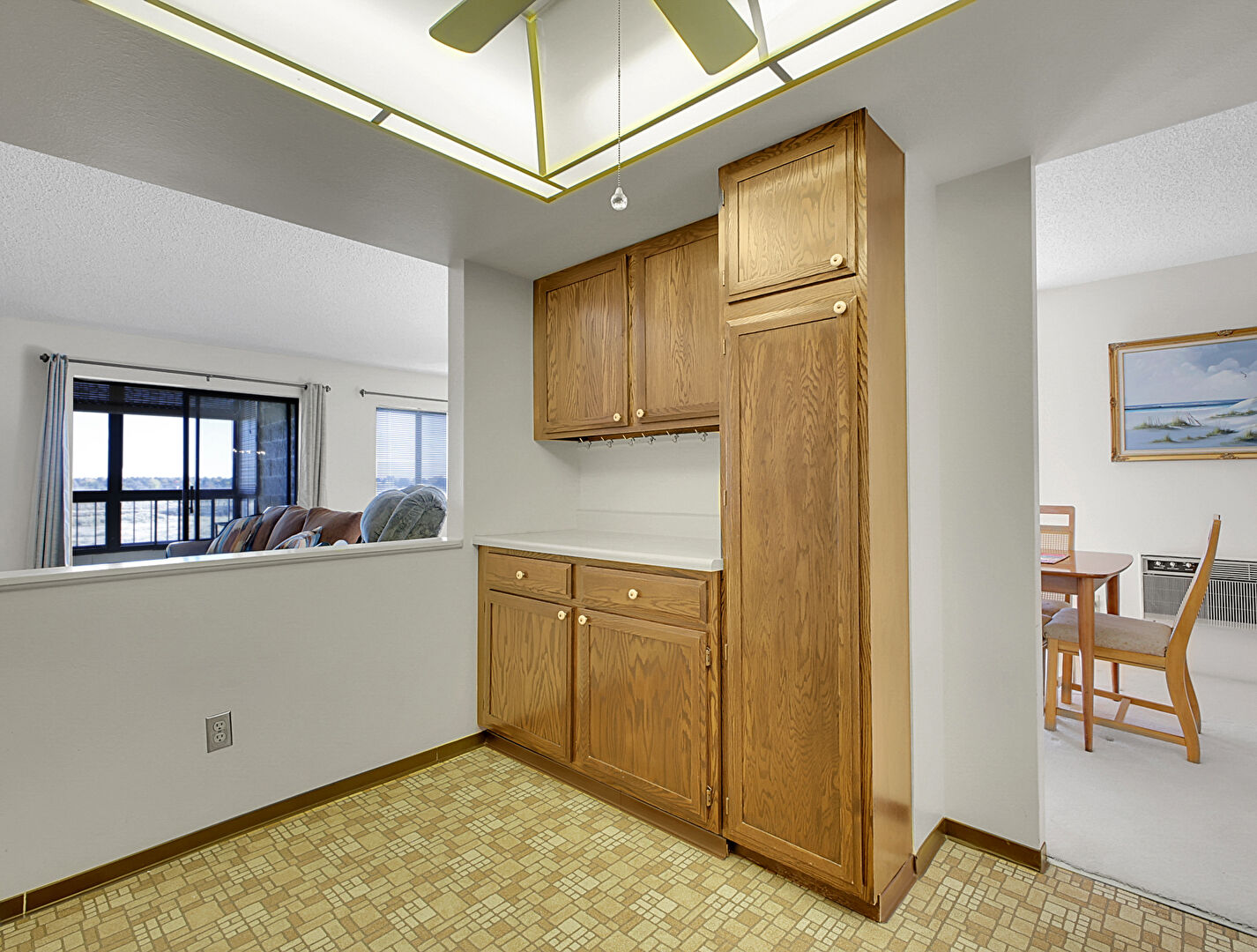Baseboards Wall, Ceiling Fan, Drywall, Fire Extinguisher, Medium Brown Cabinets, Natural Light, Opens To Living Area, Shaker Cabinets, Skylight, Textured Ceiling, U Shaped Kitchen, Vinyl Floor, Visible Hinge Cabinets, Wall Mounted Ac, Medium Brown Cabinets, Shaker Cabinets, Vinyl Floor, Visible Hinge Cabinets