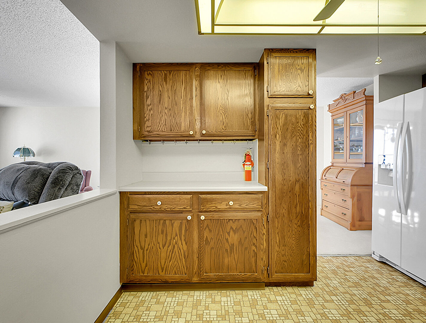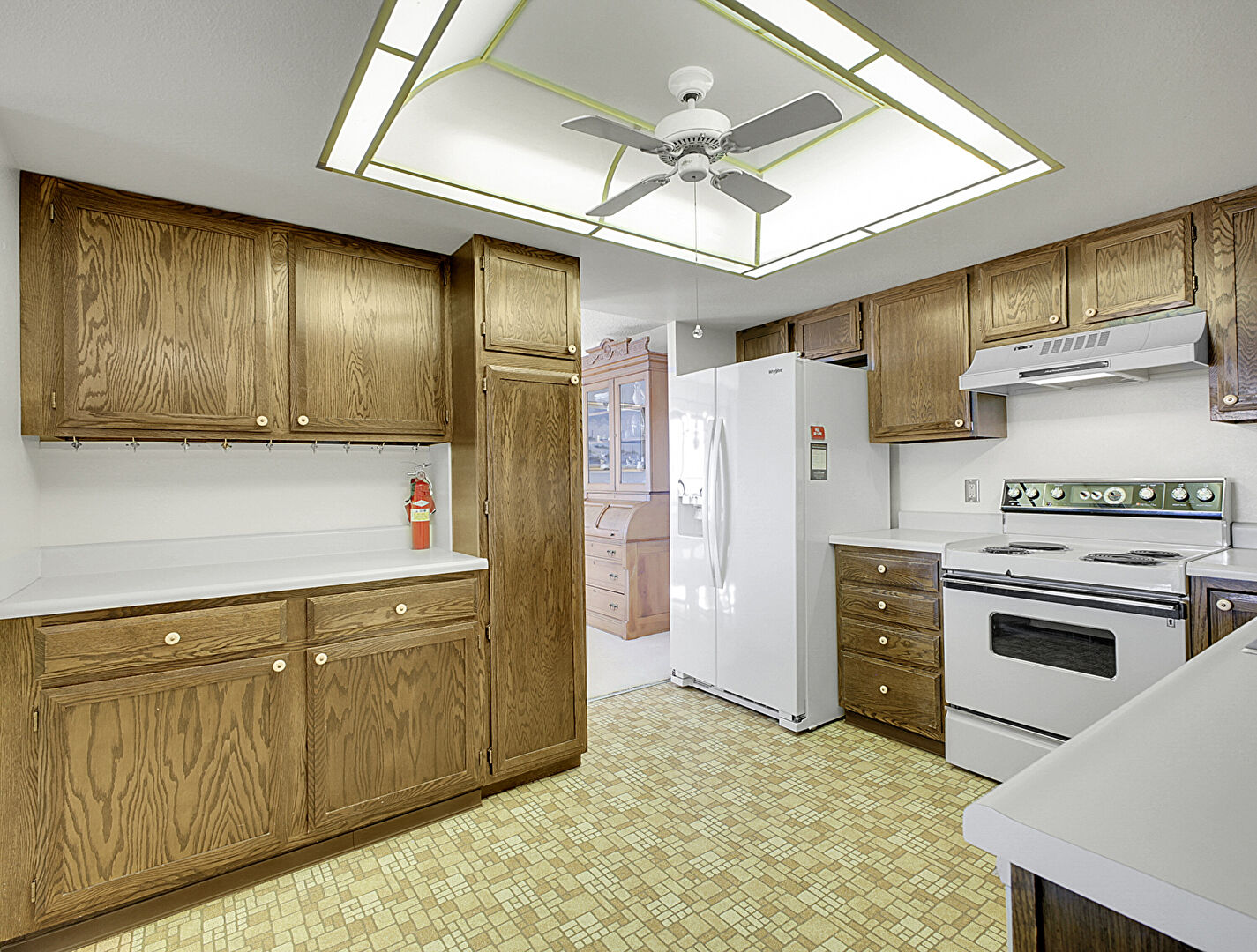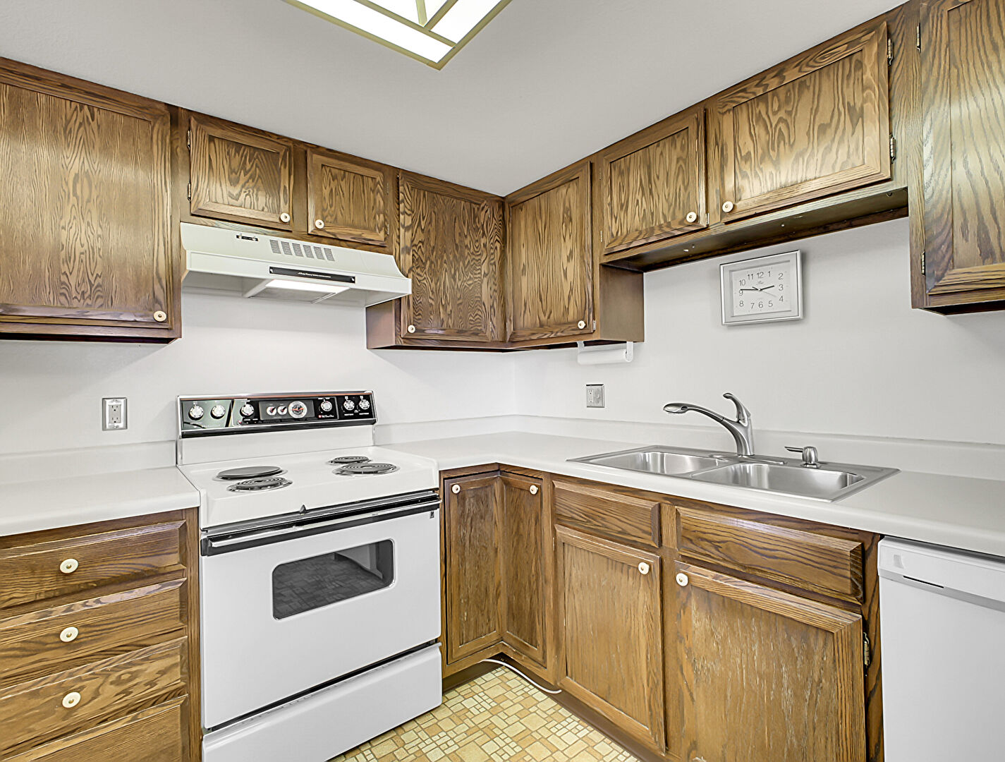 Baseboards Wall, Ceiling Fan, Drywall, Fire Extinguisher, Medium Brown Cabinets, Natural Light, Opens To Living Area, Shaker Cabinets, Skylight, Textured Ceiling, U Shaped Kitchen, Vinyl Floor, Visible Hinge Cabinets, Wall Mounted Ac, Medium Brown Cabinets, Shaker Cabinets, Vinyl Floor, Visible Hinge Cabinets