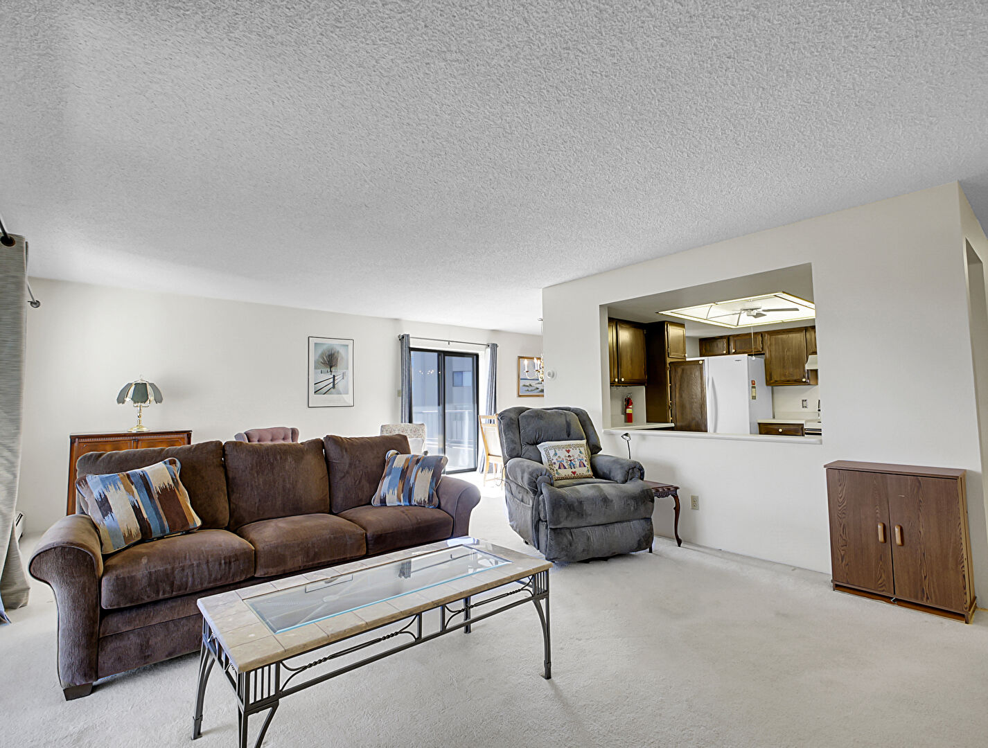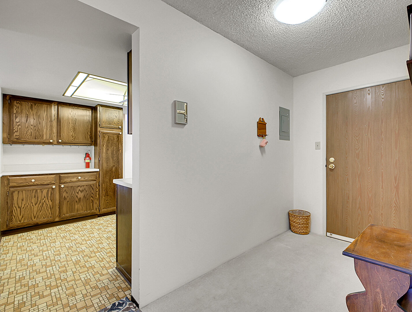 Baseboard Radiator, Carpet, Drywall, Fire Extinguisher, G Shaped Kitchen, Natural Light, Notable Chandelier, Skylight, Textured Ceiling, Wall Mounted Ac, Baseboard Radiator, Drywall, Textured Ceiling, Wall Mounted Ac