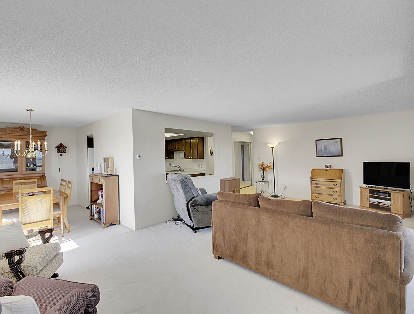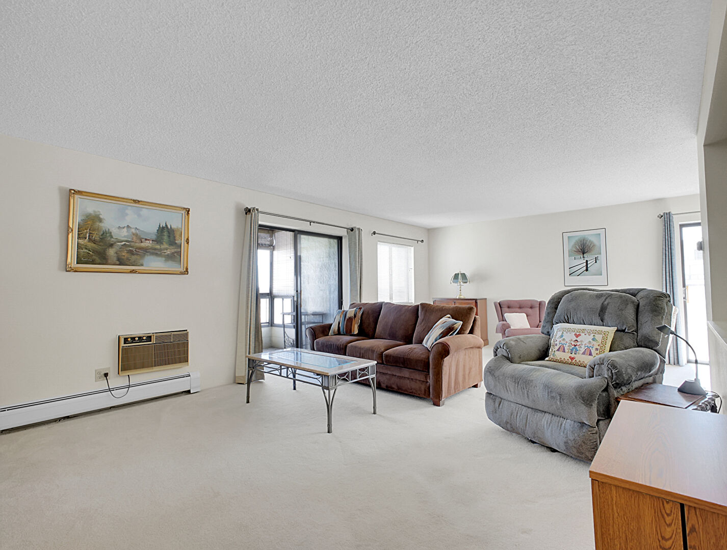 Baseboard Radiator, Carpet, Drywall, Natural Light, Notable Chandelier, Textured Ceiling, Wall Mounted Ac, Carpet, Notable Chandelier, Textured Ceiling
