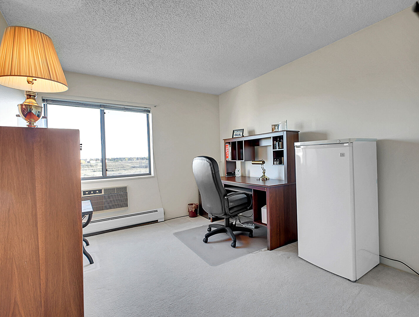 Baseboard Radiator, Carpet, Concrete Floor, Drywall, Natural Light, Office Area, Textured Ceiling, Baseboard Radiator, Drywall, Wall Mounted Ac