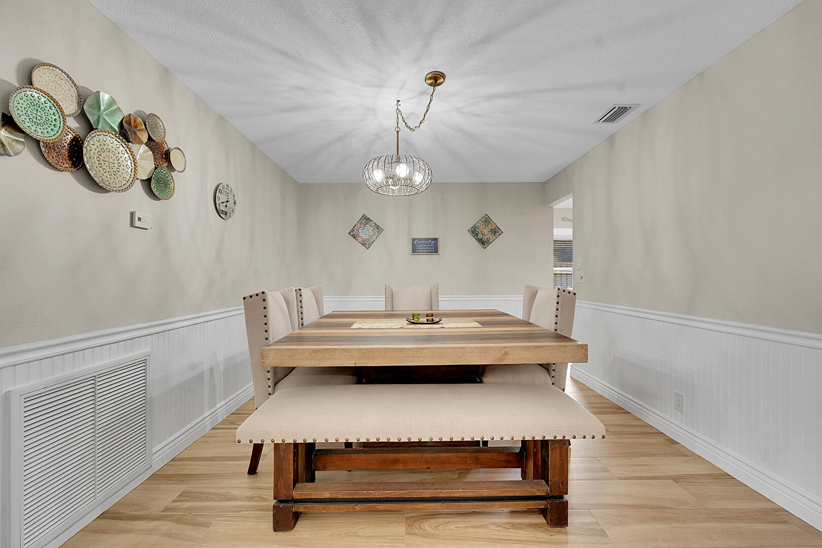 Baseboards Wall, Drywall, Notable Chandelier, Textured Ceiling, Vent, Wainscot Wall, Wood Finish Floor, Ceiling Fan, Wood Finish Floor