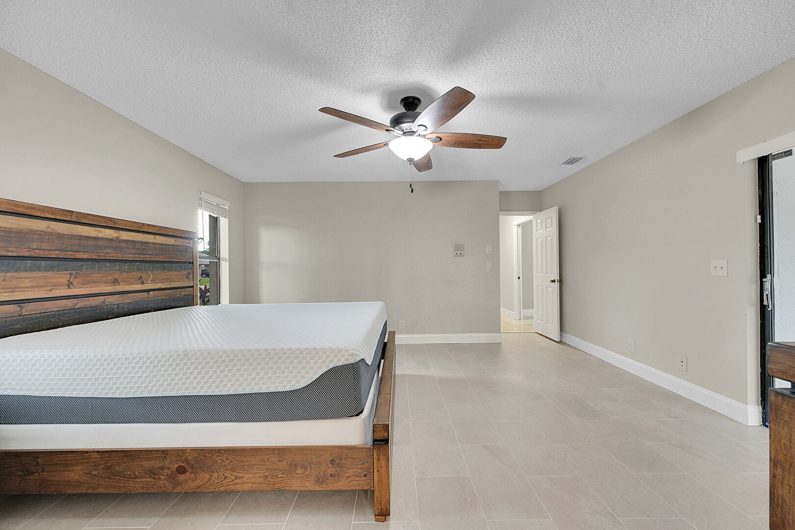 Access To Exterior, Baseboards Wall, Ceiling Fan, Drywall, Ensuite Bathroom, Natural Light, Textured Ceiling, Tile Floor, Vent, Baseboards Wall, Natural Light